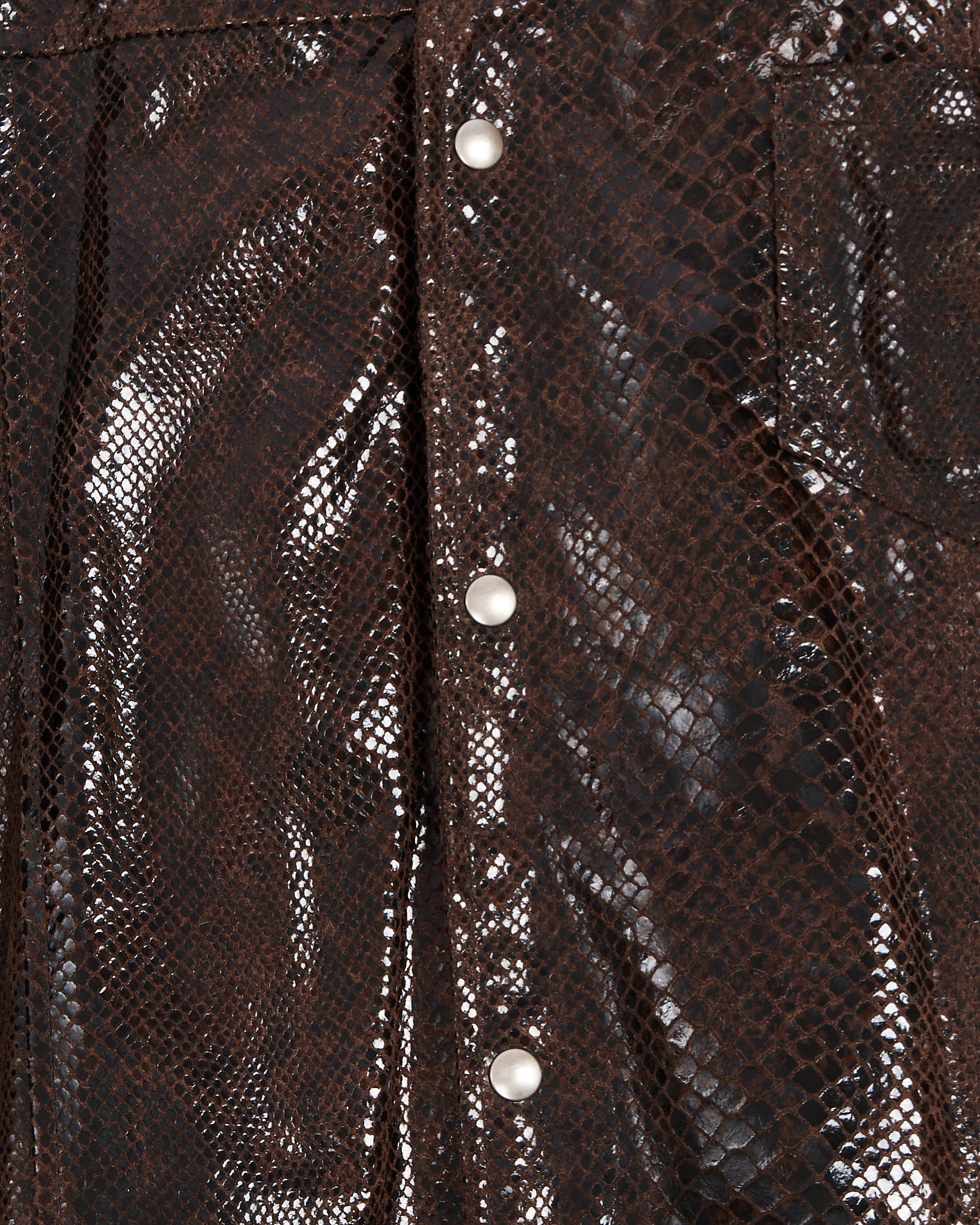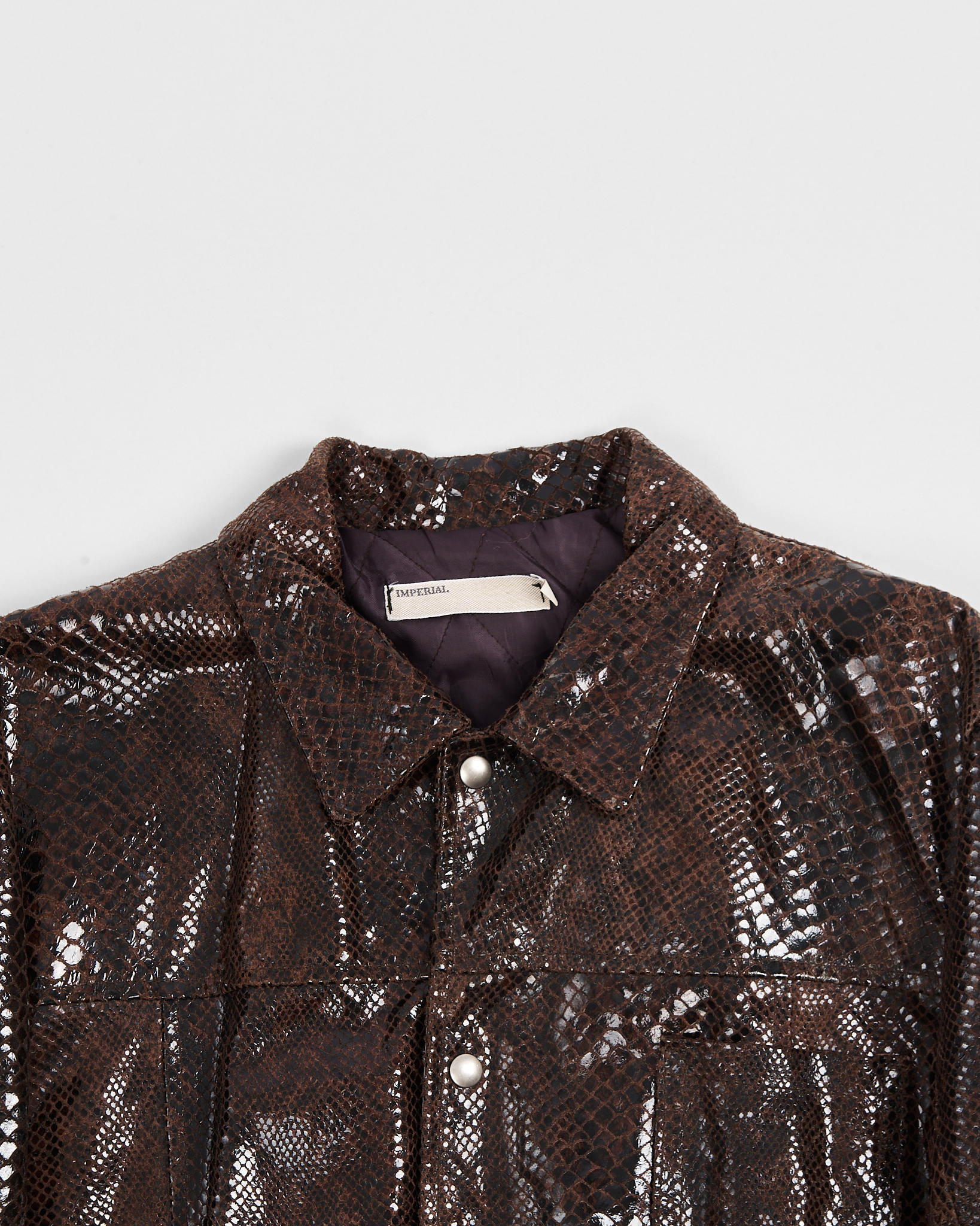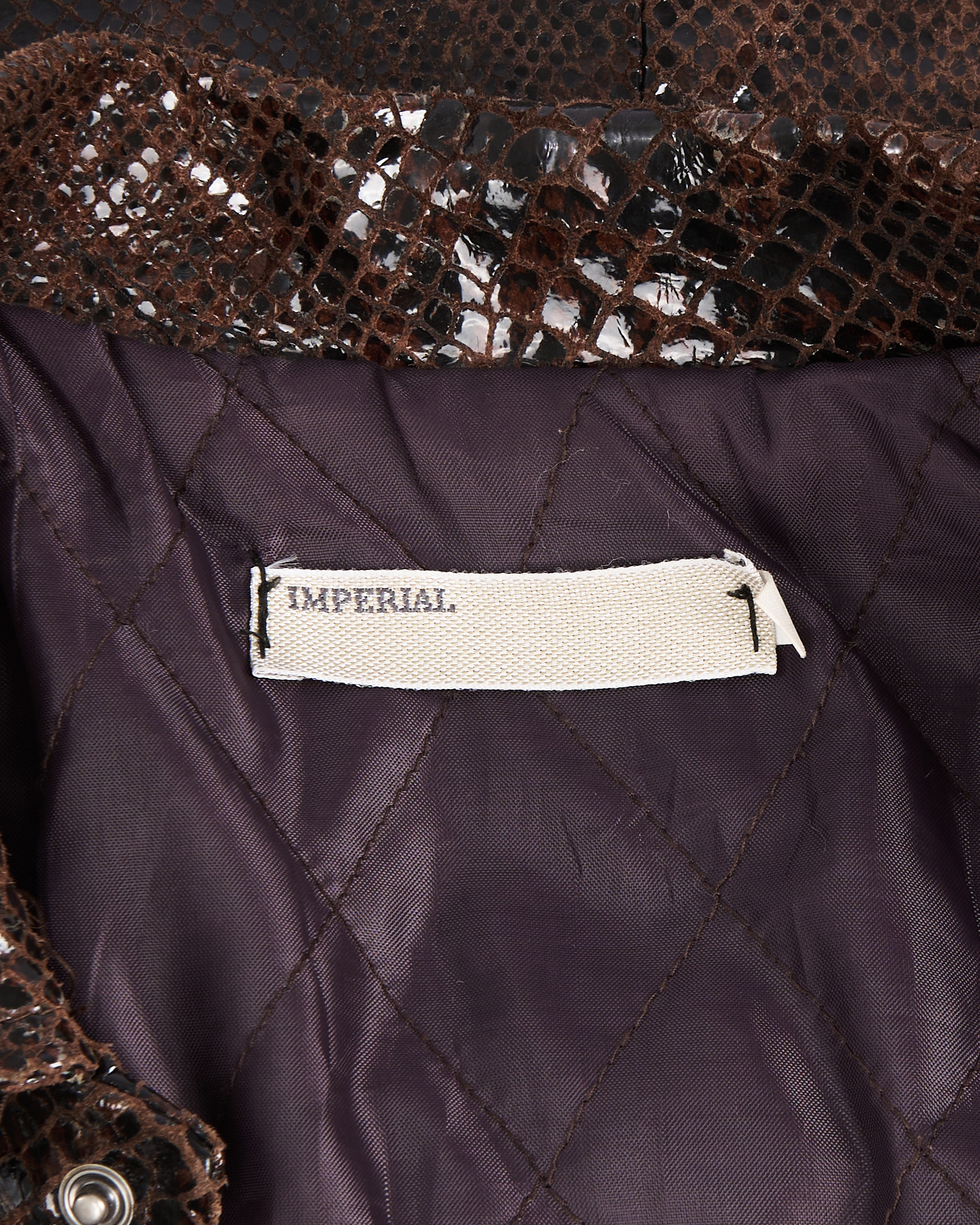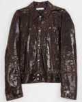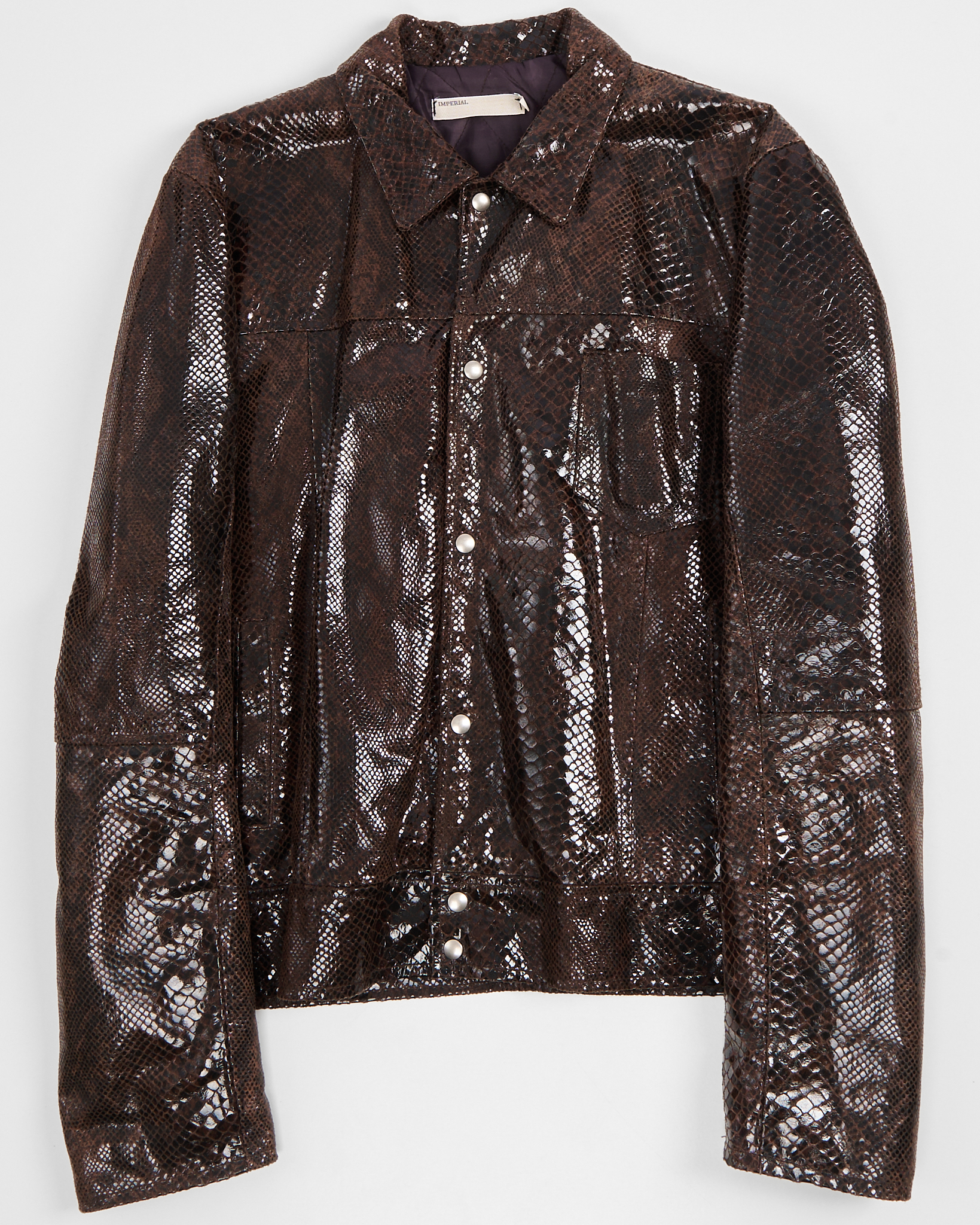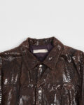 Винтажная куртка Imperial из натуральной кожи с выделкой под рептилию. Темно-коричневый цвет с глянцевым эффектом, классический воротник и застежка на кнопки. Карманы по бокам и на груди. Итальянское производство.