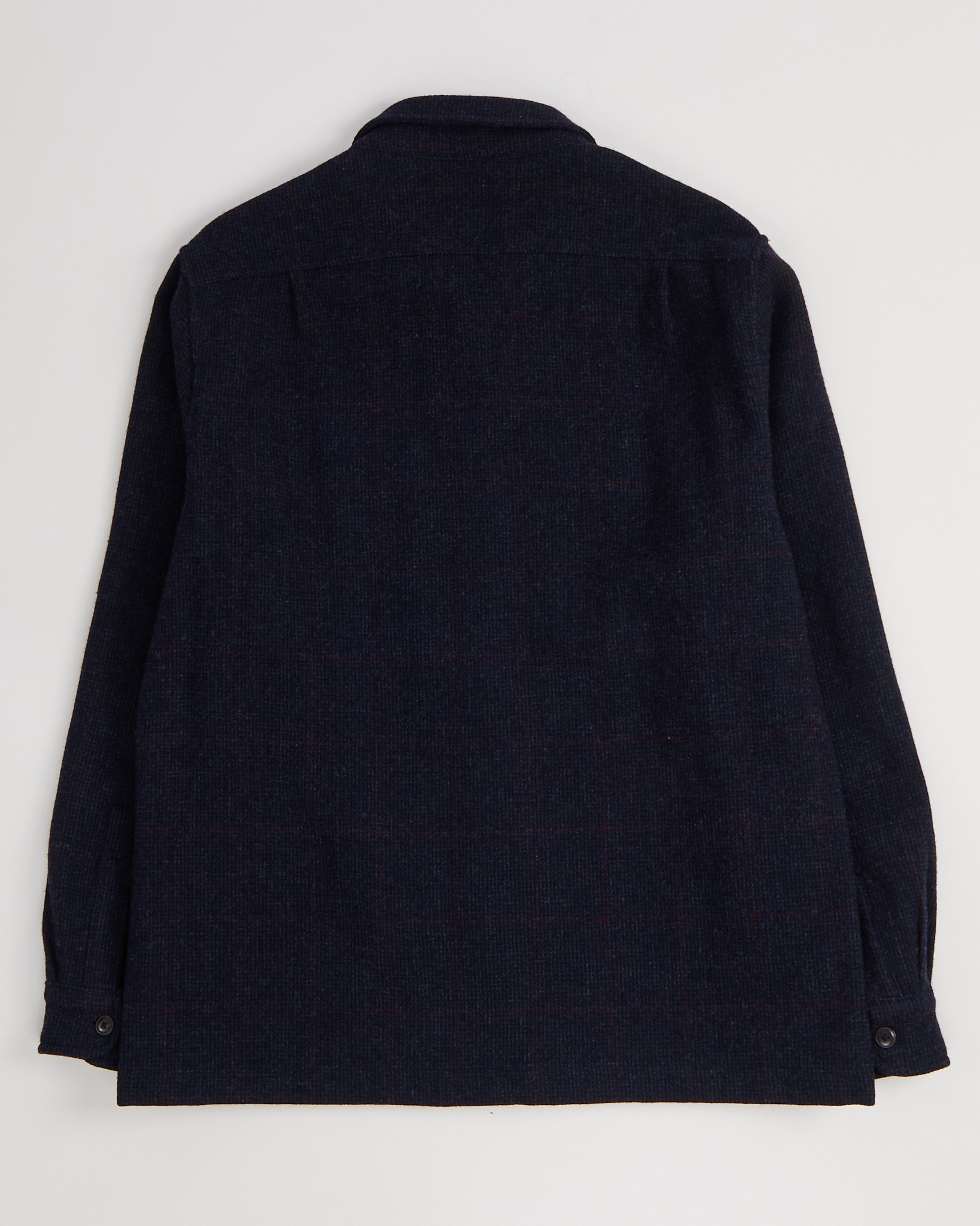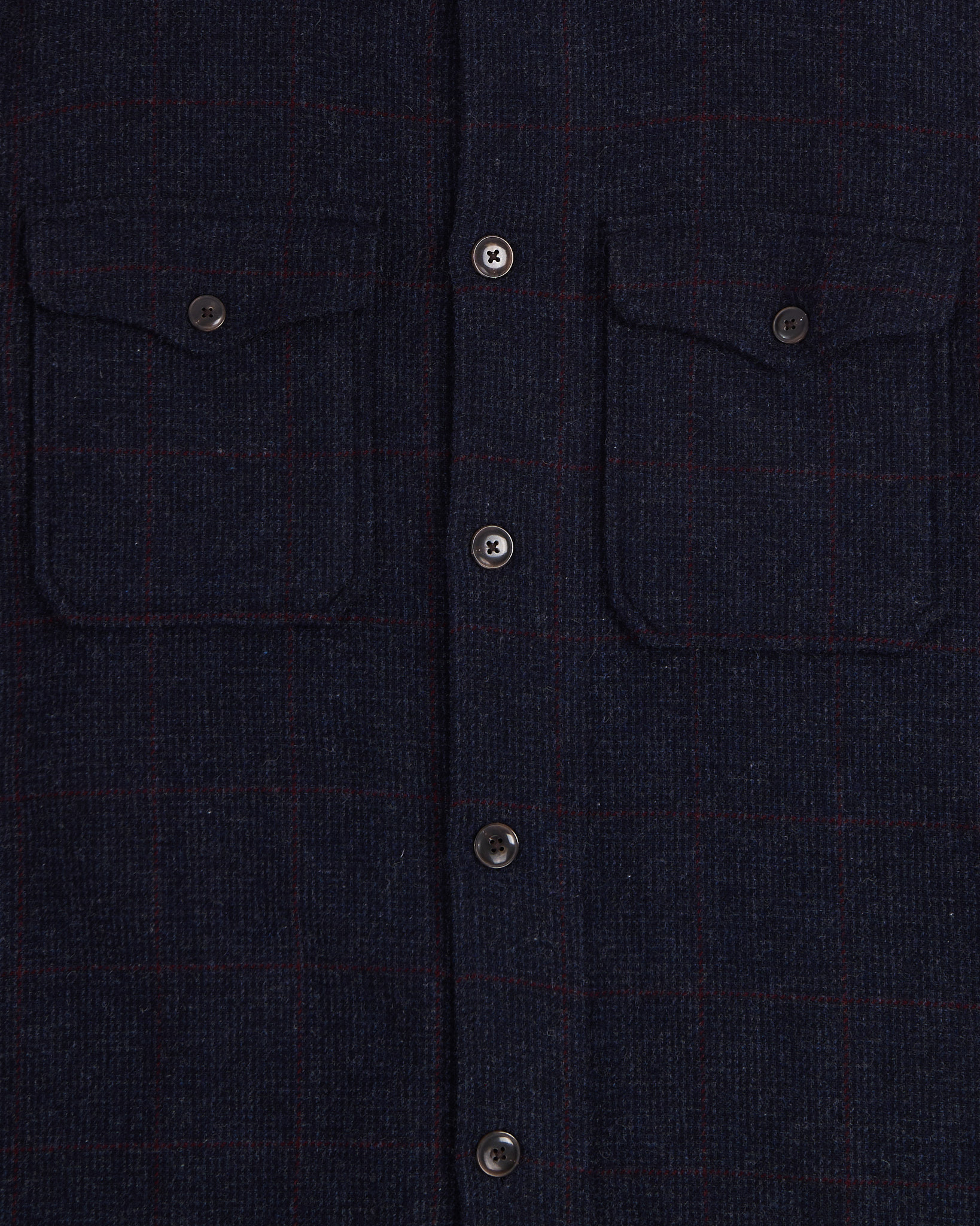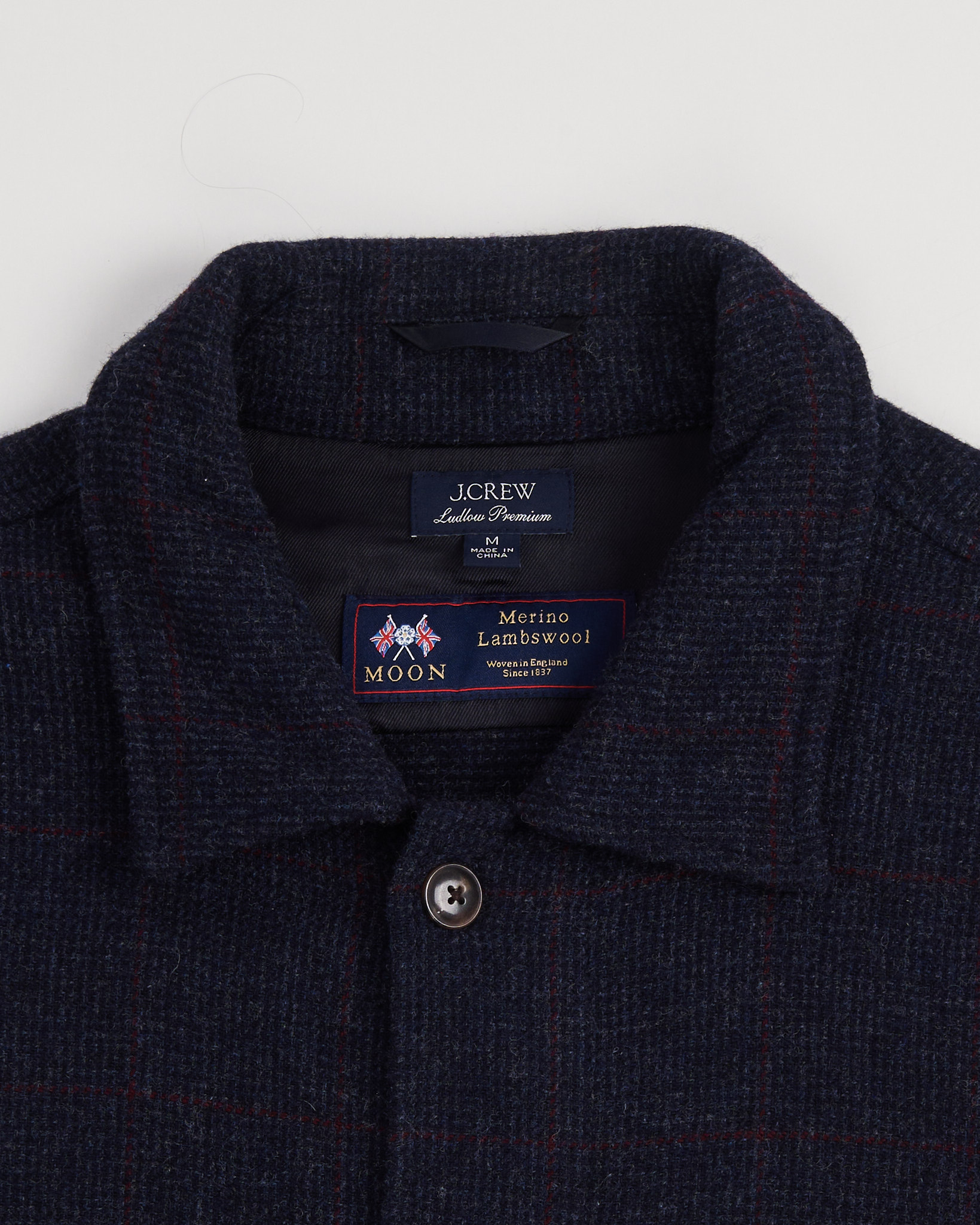 Шерстяная куртка J.Crew темно - синего цвета. В ткани переплетаются нити черного и красного цвета. Посадка свободная, с леким оверсайз-эффектом. Два накладных кармана с клапанами. Классический отложной воротник. Застежка на пуговицах.