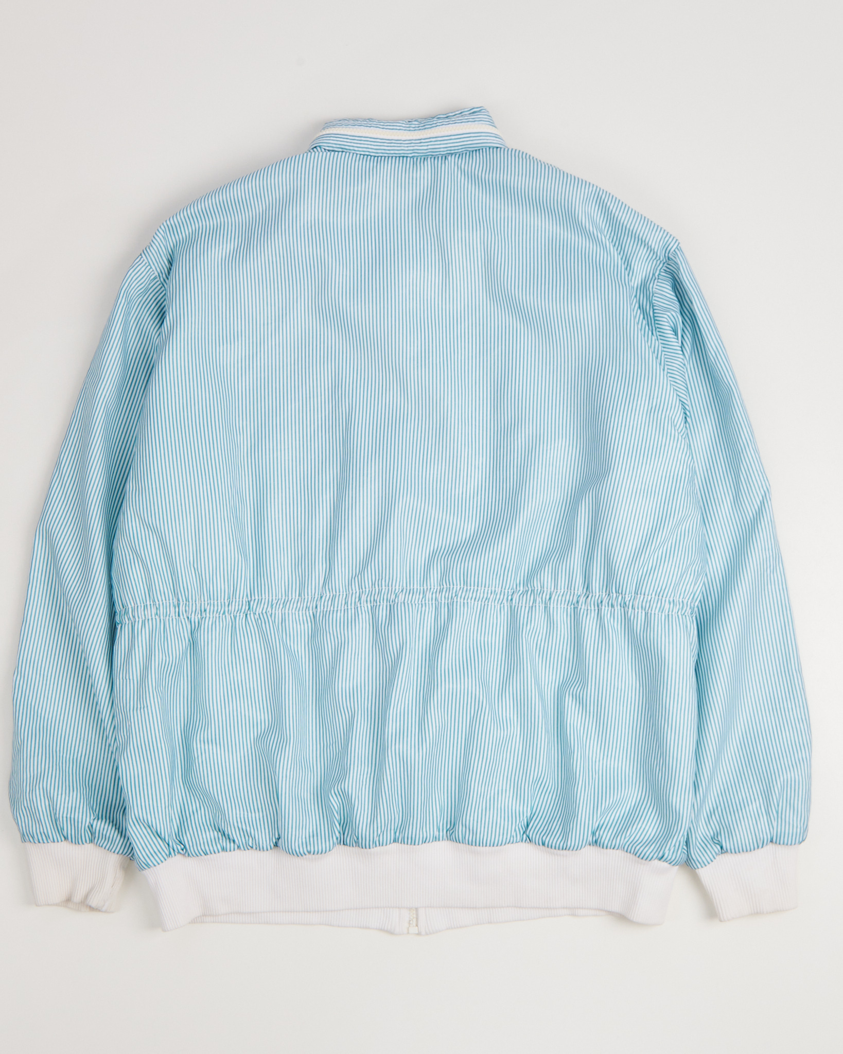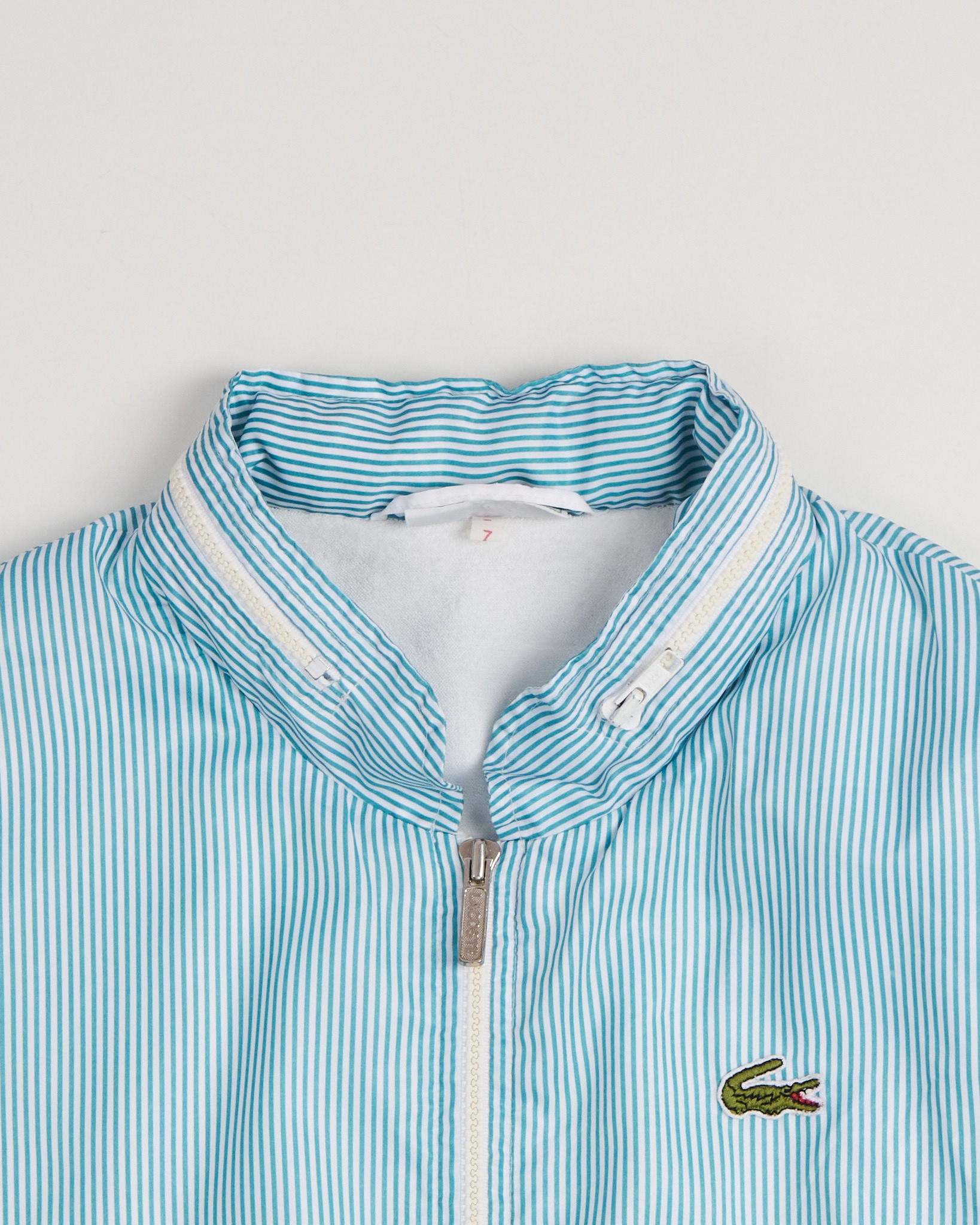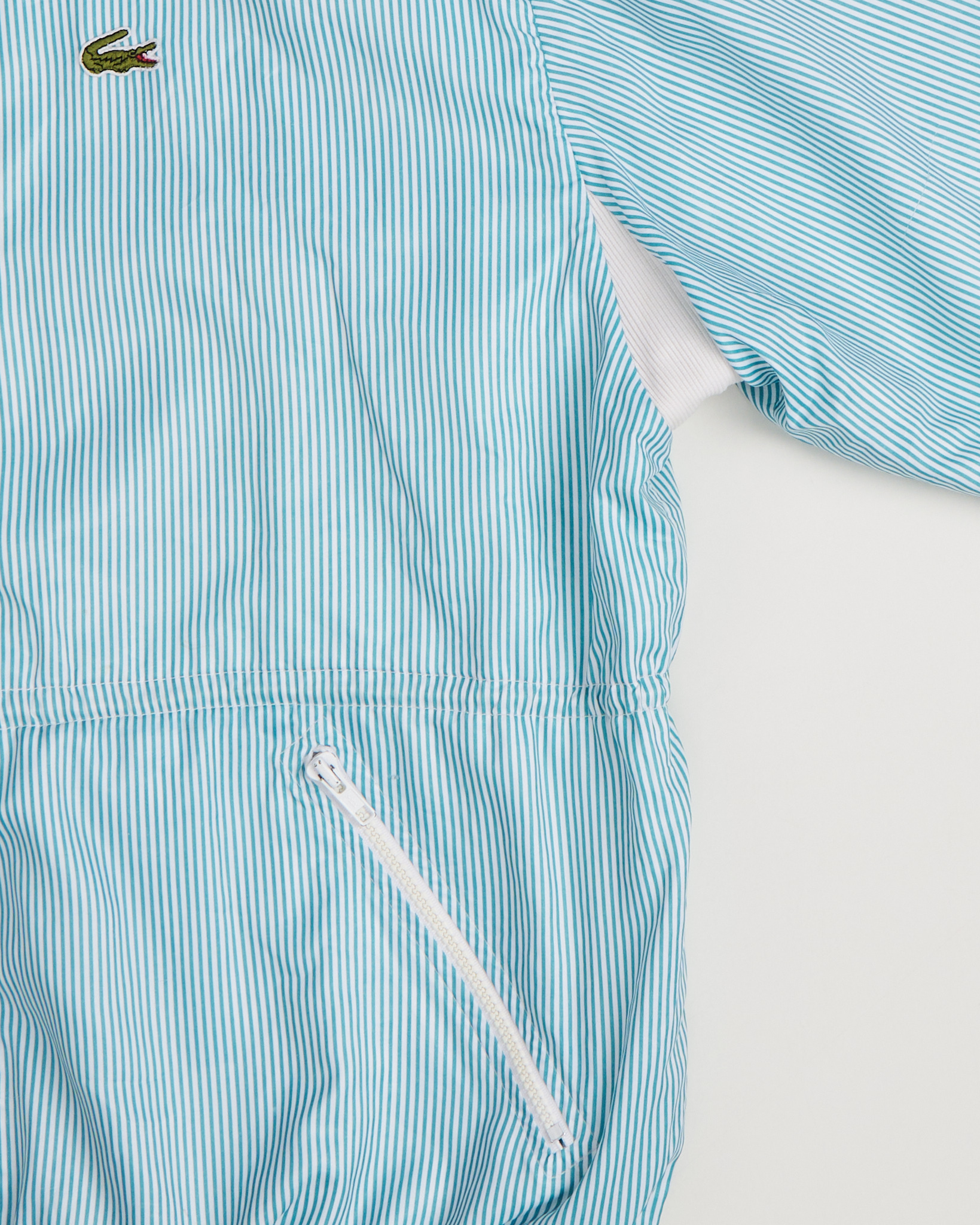 Модель выполнена в светло-голубую полоску, на груди вышит фирменный логотип, спереди застежка на молнию и карманы с наклонной линией входа. Прямой силуэт, свободная посадка. Рукава и низ дополнены эластичными манжетами. В воротнике скрыт капюшон. Made in France