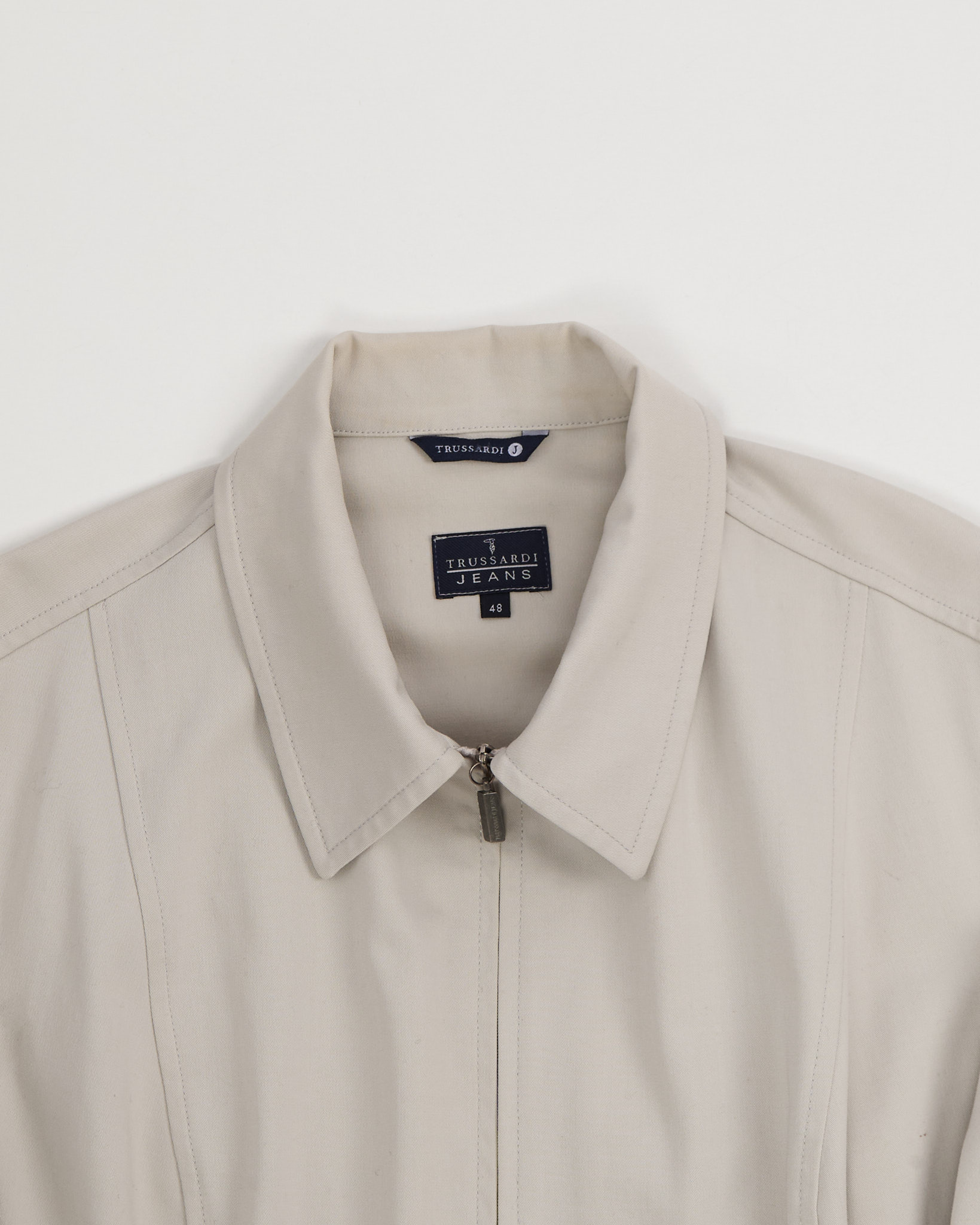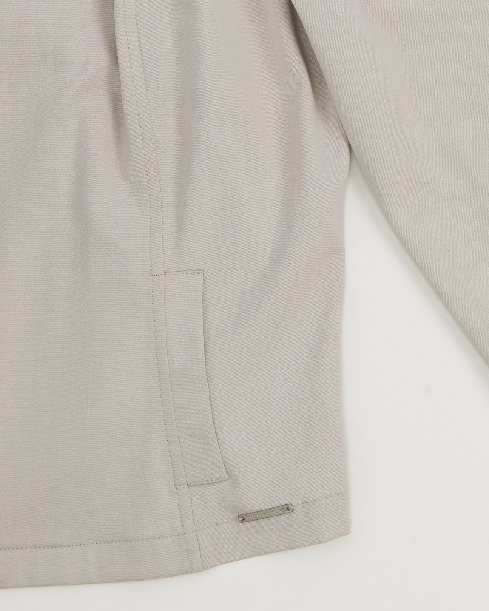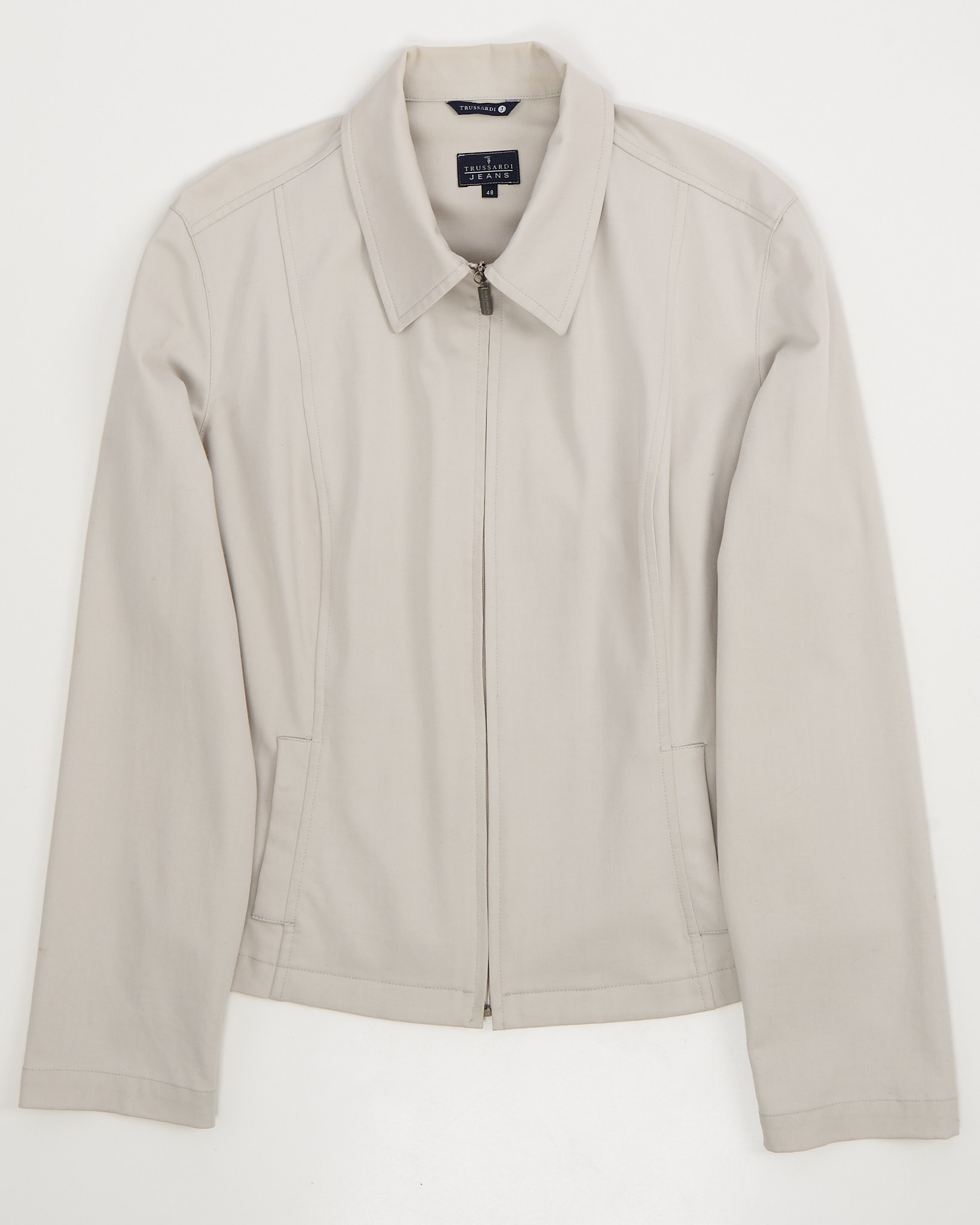 Бежевая куртка от бренда Trussardi Jeans. Прямой крой, комфортная посадка. Фирменная фурнитура, по бокам функциональные карманы.