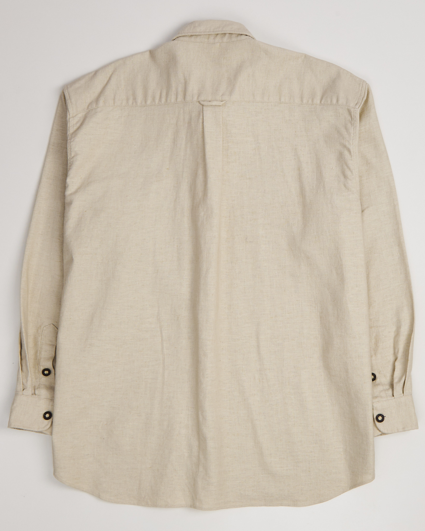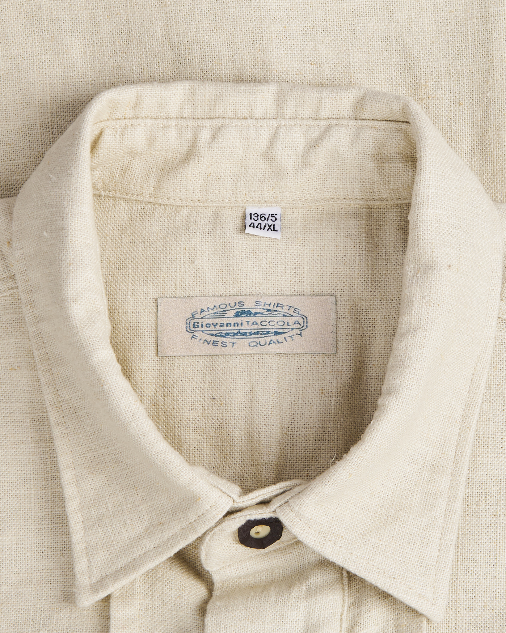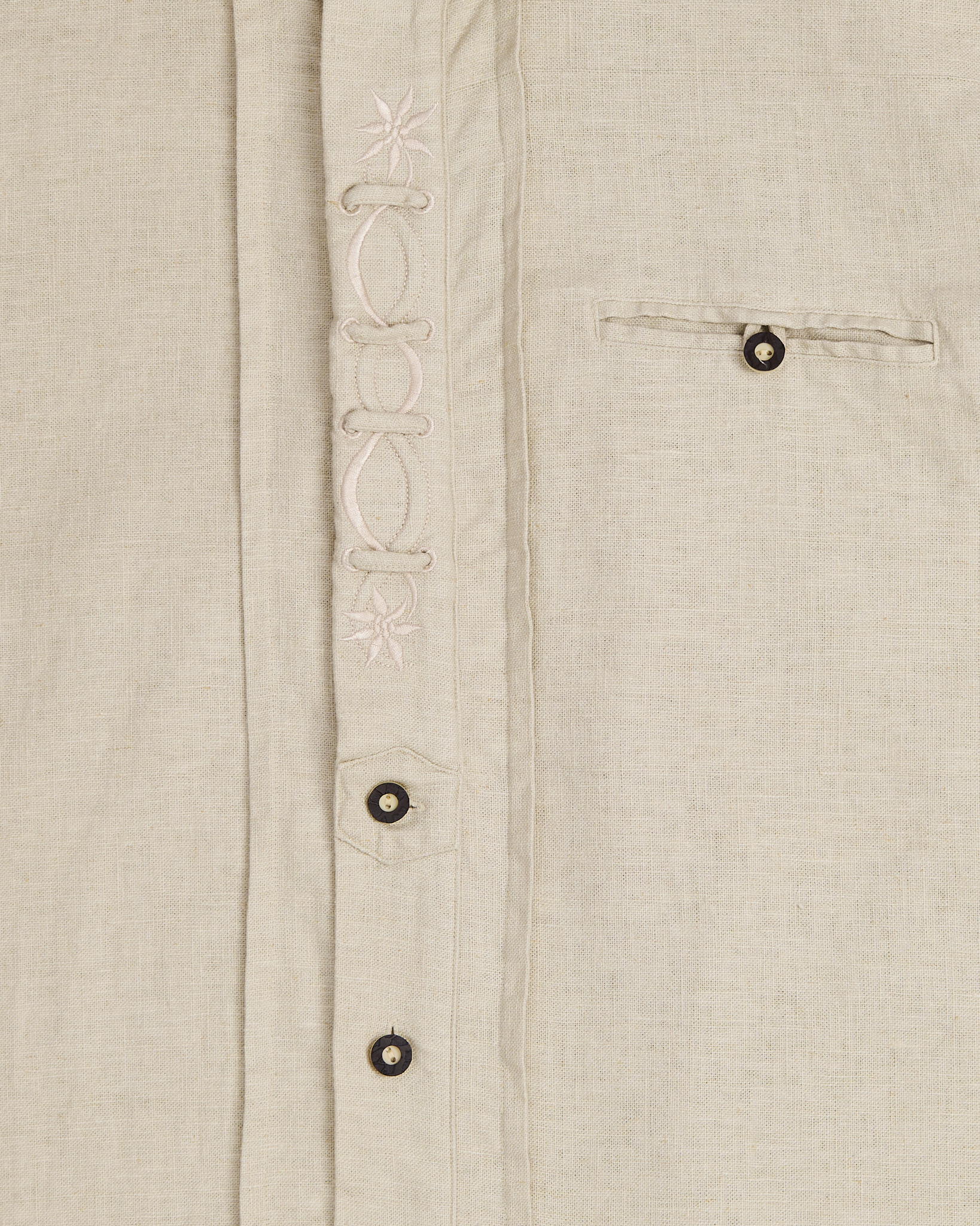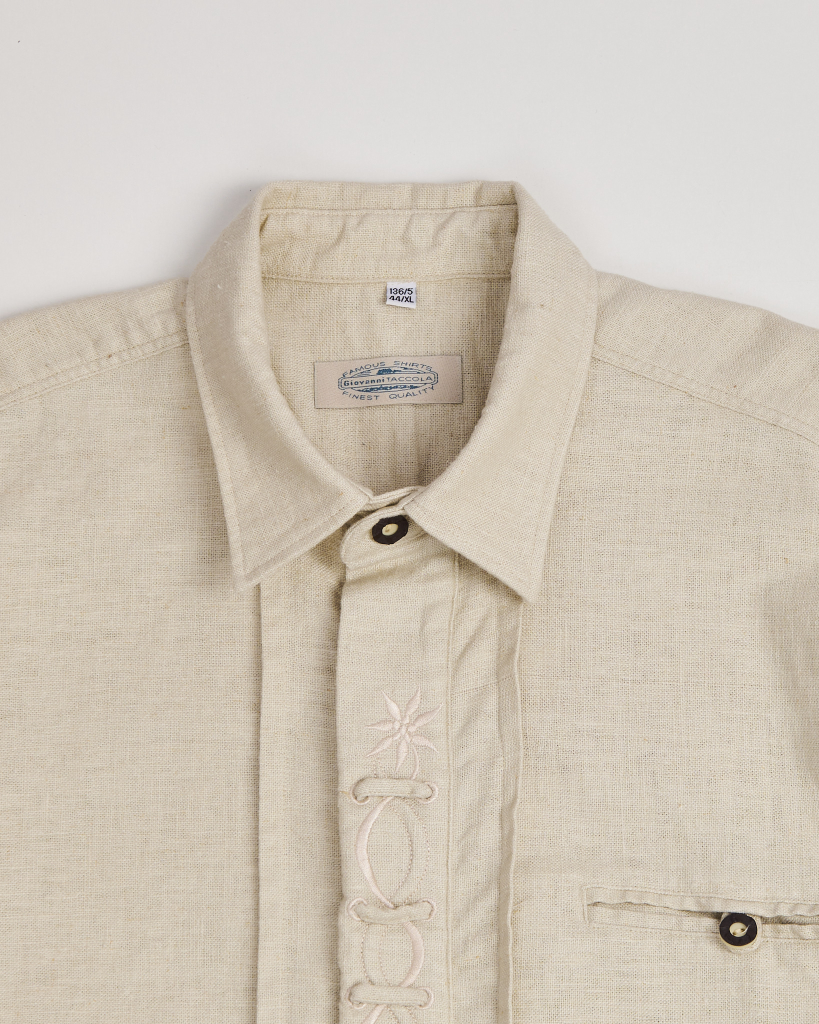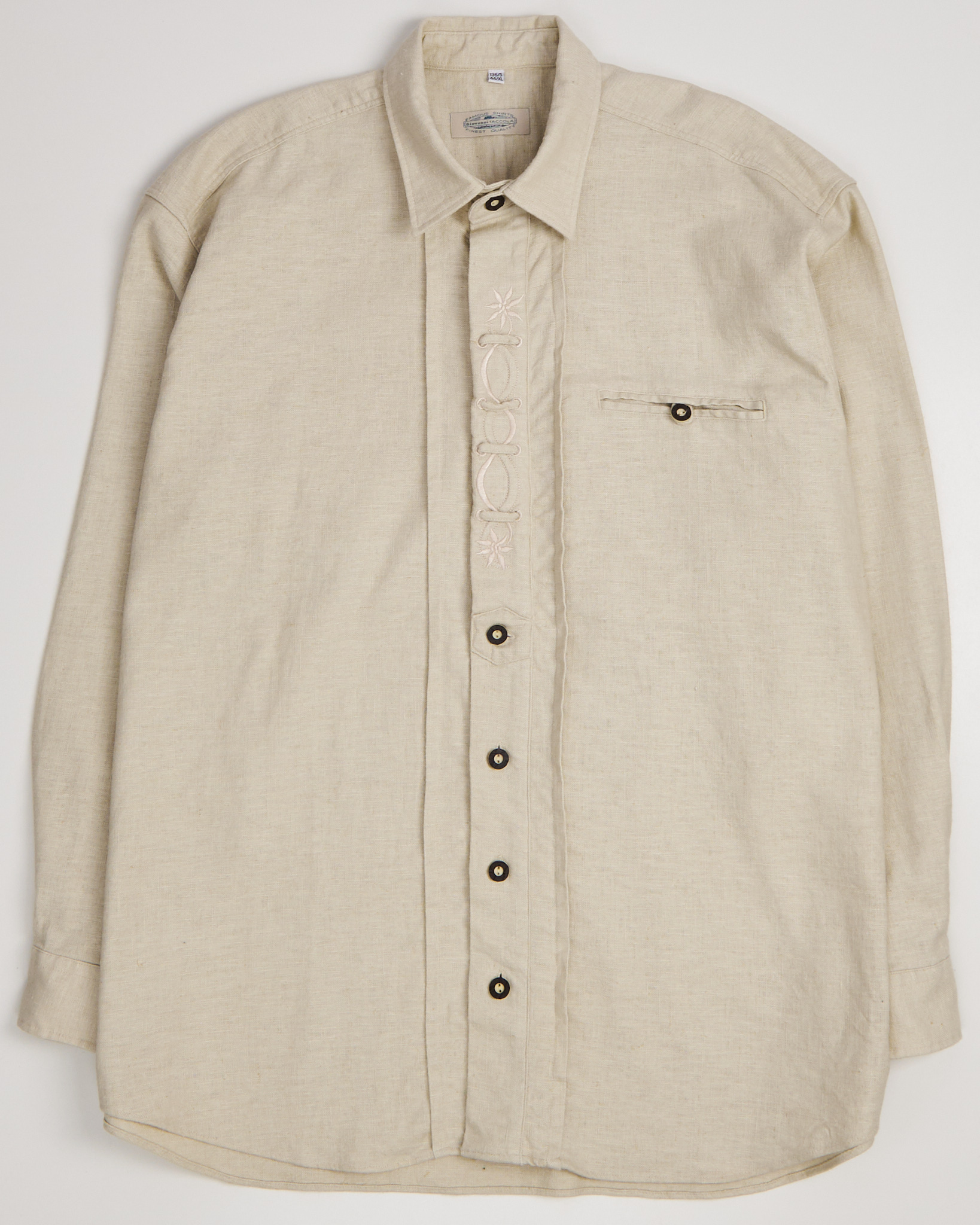 Рубашка от Giovanni Taccola из плотного льна с хлопком светло-бежевого оттенка. Классический прямой удлиненный крой, свободная посадка. Декоративная вышивка вдоль планки застёжки, длинные рукава с манжетами на пуговицах, накладной карман слева. Расслабленный кэжуал с элементами бохо.