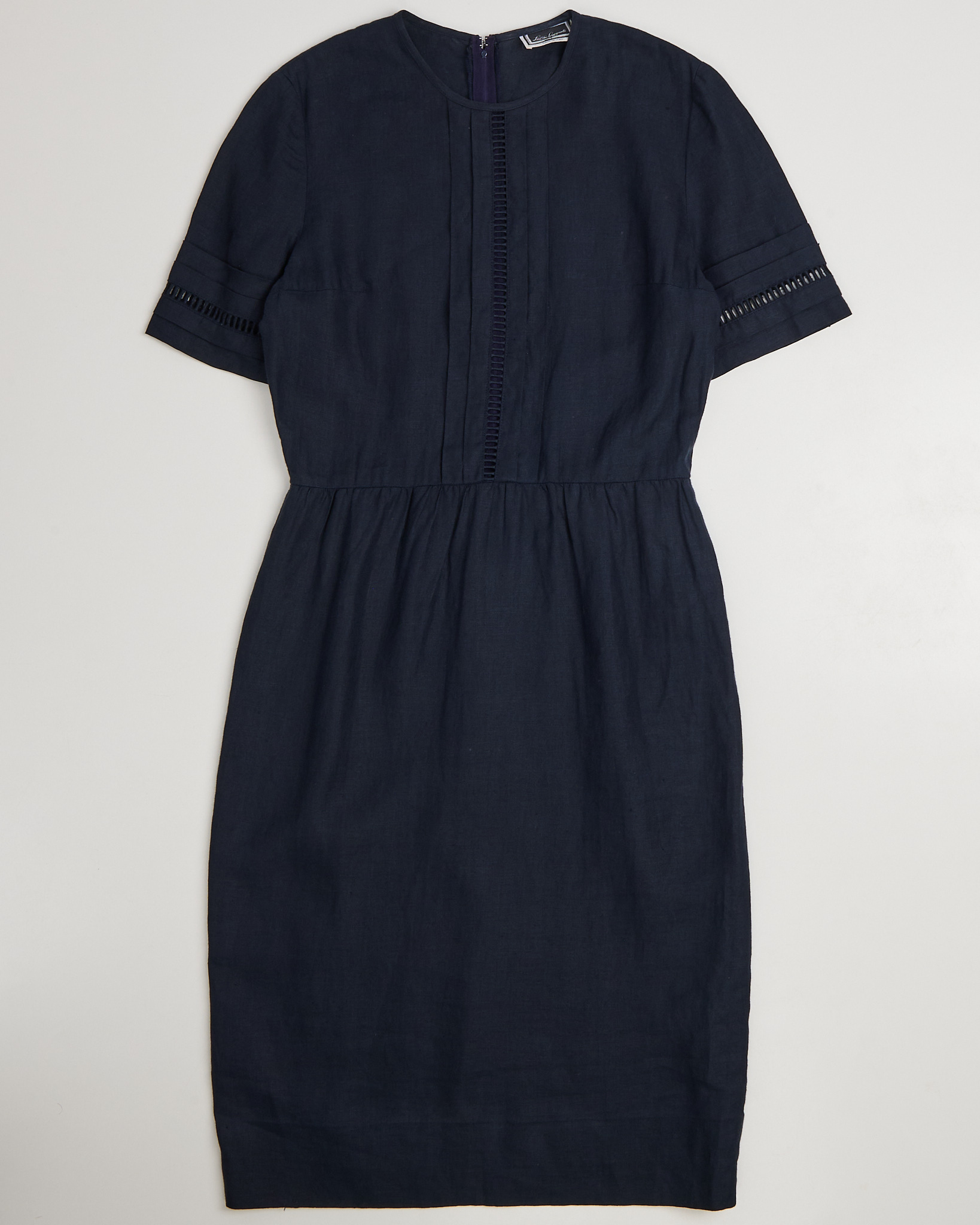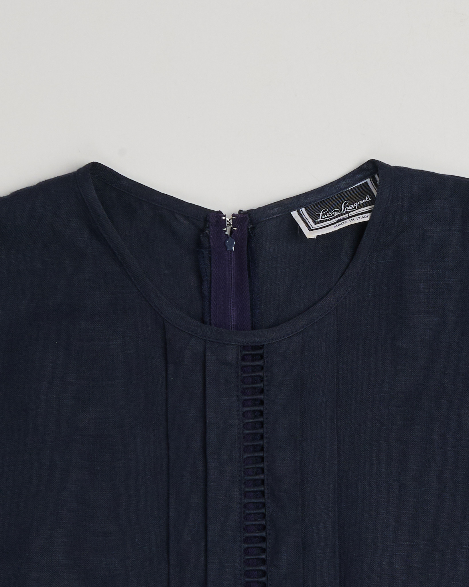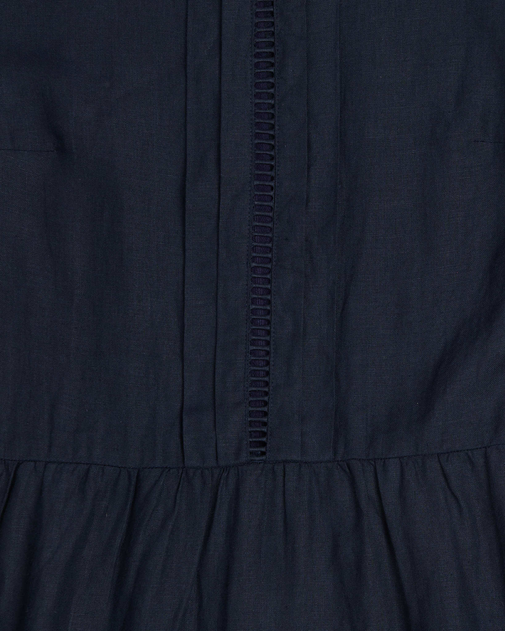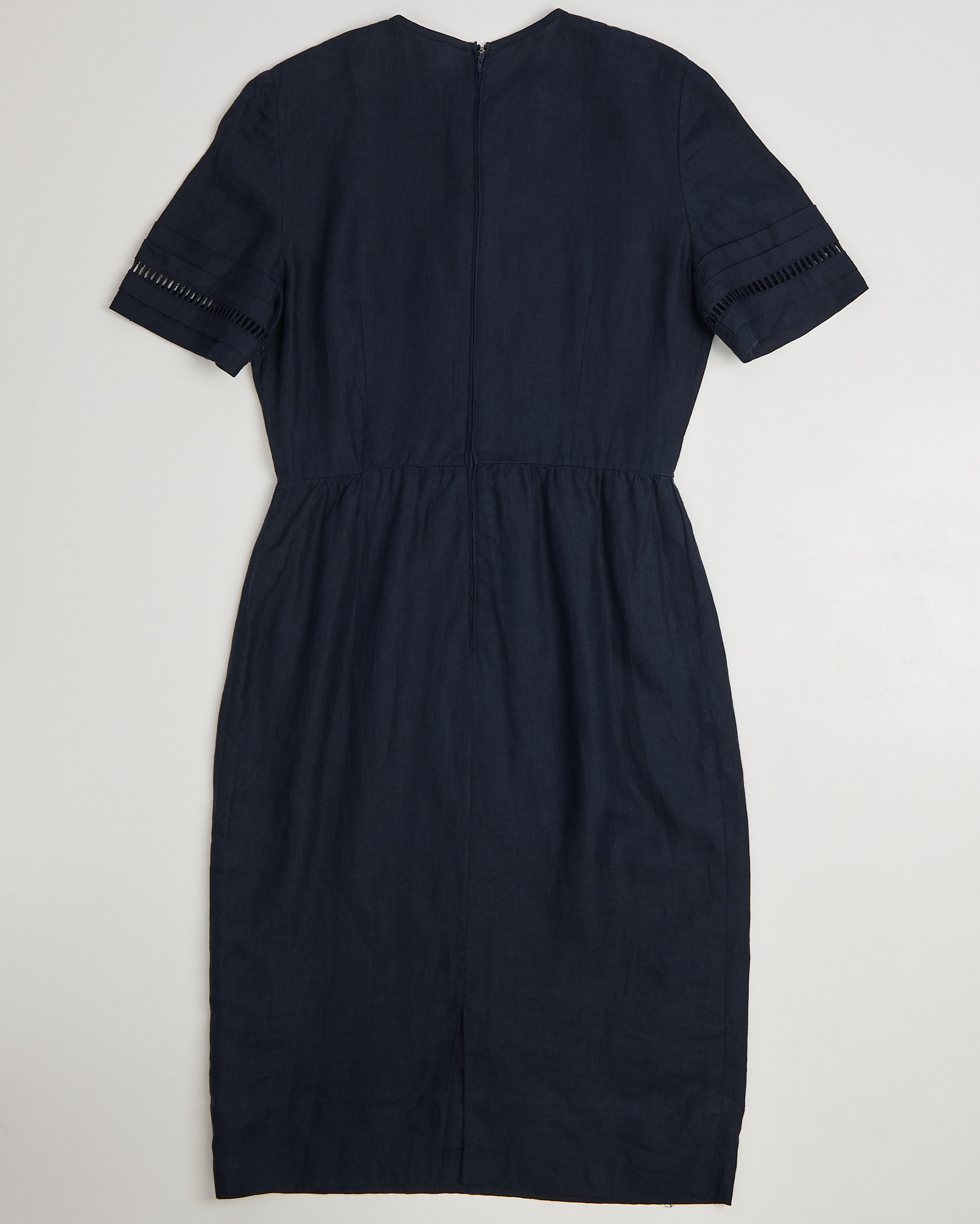 Платье из натурального льна, выполнено в тёмно-синем оттенке с матовой поверхностью ткани. Приталенного силуэта с акцентом на талии и мягкой сборкой по линии пояса