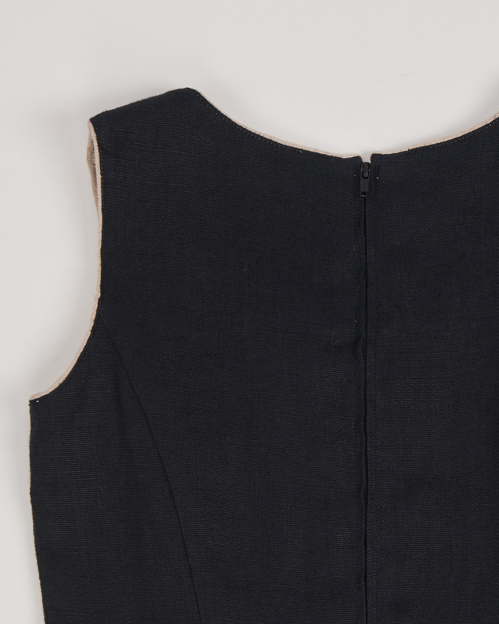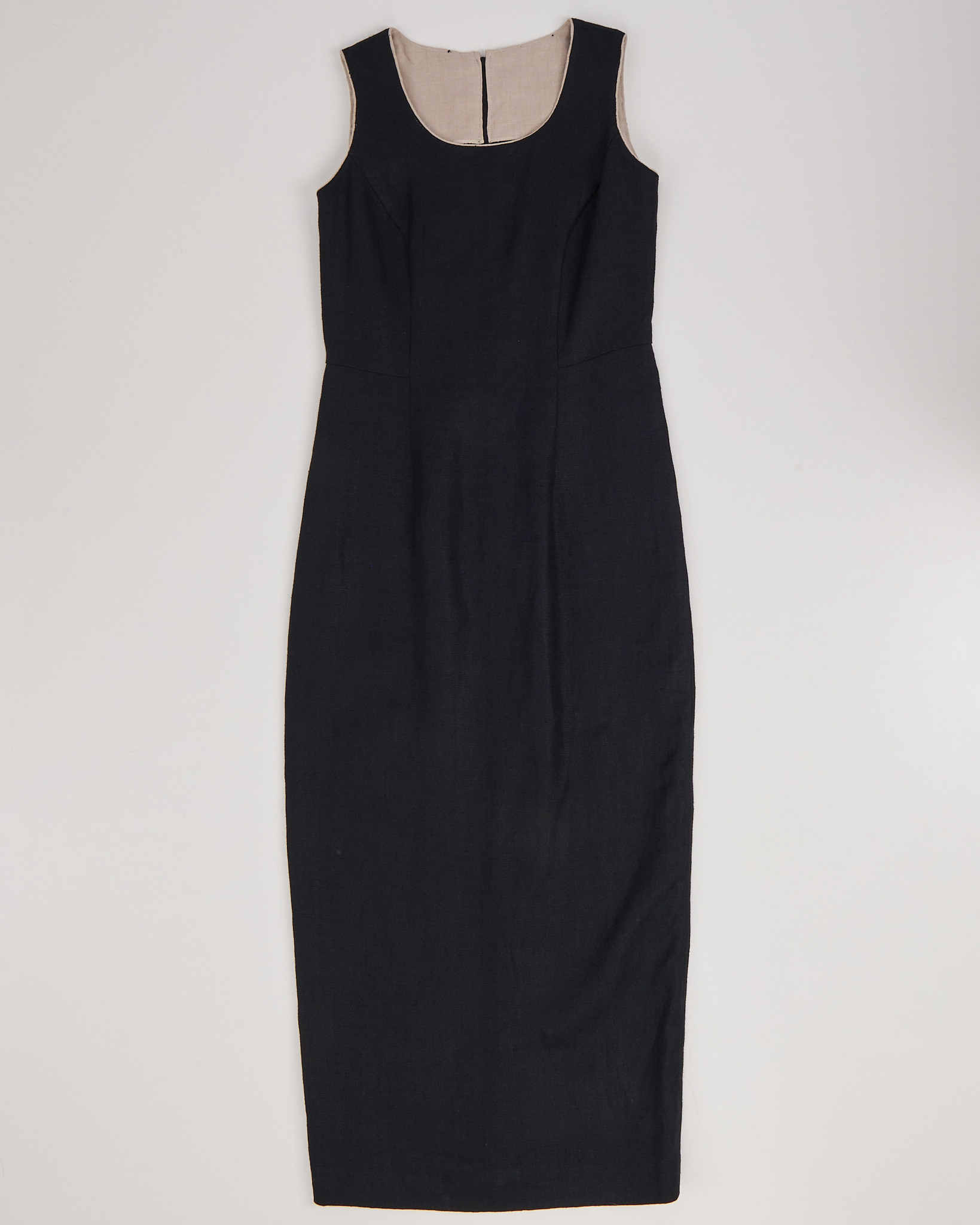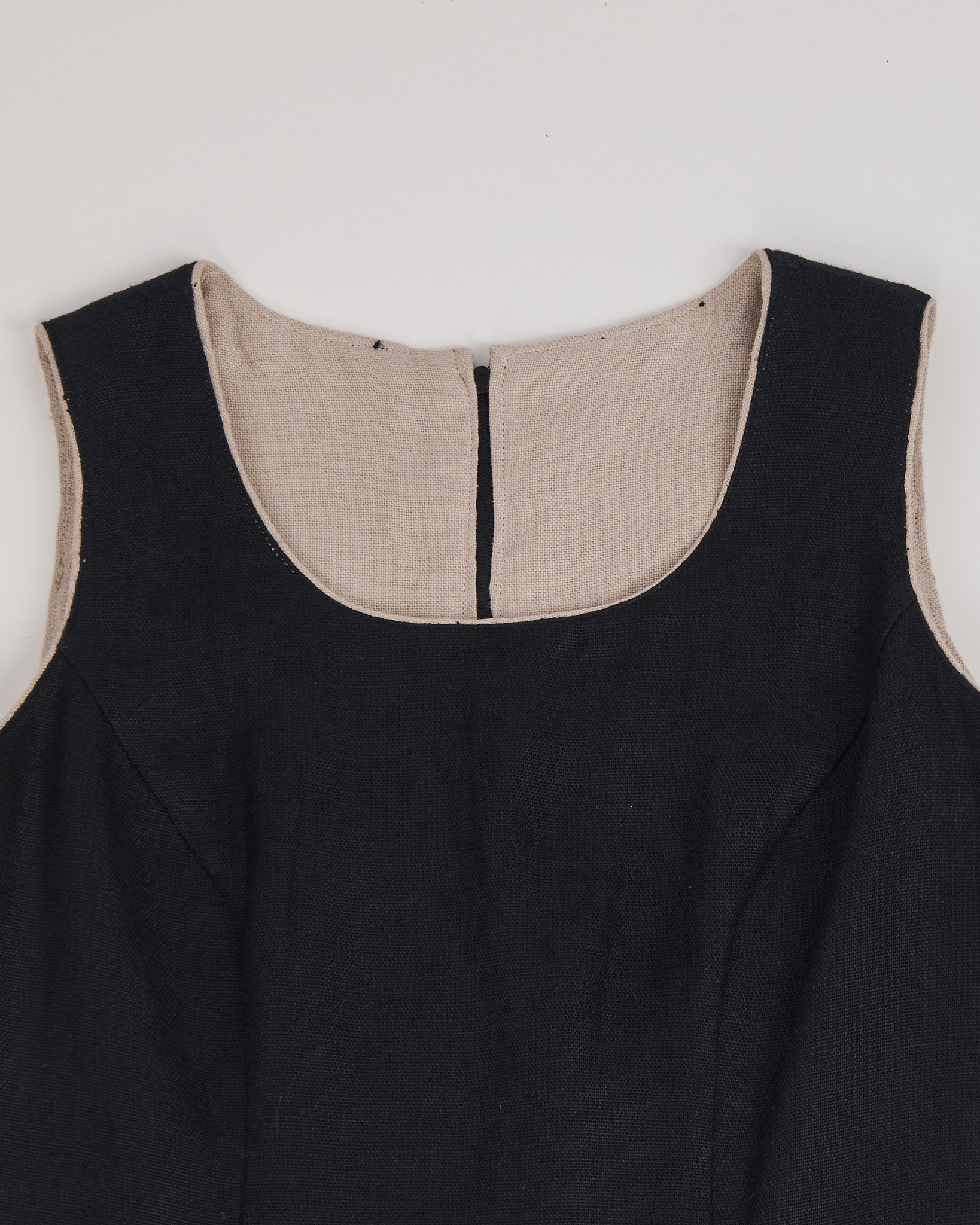 Платье из натурального льна тёмного оттенка, простого кроя с квадратным вырезом. На спинке расположена молния для удобства посадки.Отсутствие лишних деталей делает это платье универсальным для любого случая.