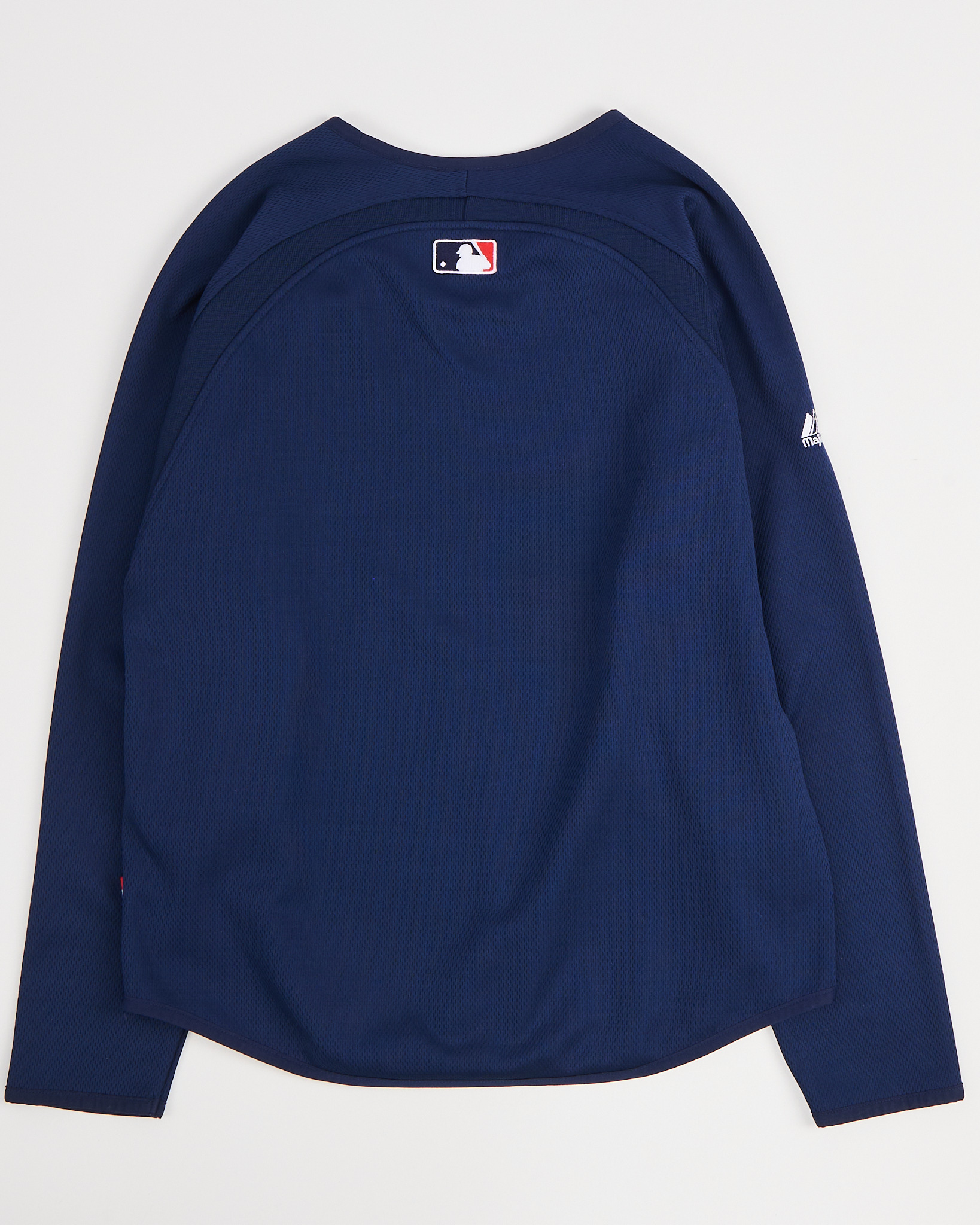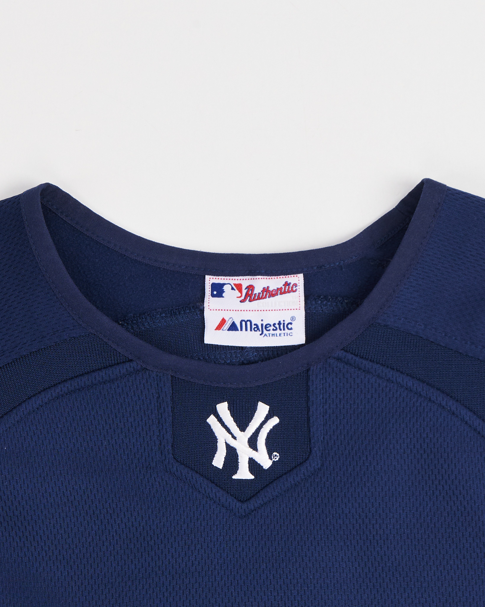 Спортивный лонгслив глубокого тёмно-синего цвета с эмблемой New York Yankees. Свободная посадка с рукавом реглан. Ткань сетчатой структуры, лёгкая и дышащая. Контрастный логотип на груди и фирменные элементы придают акцент.