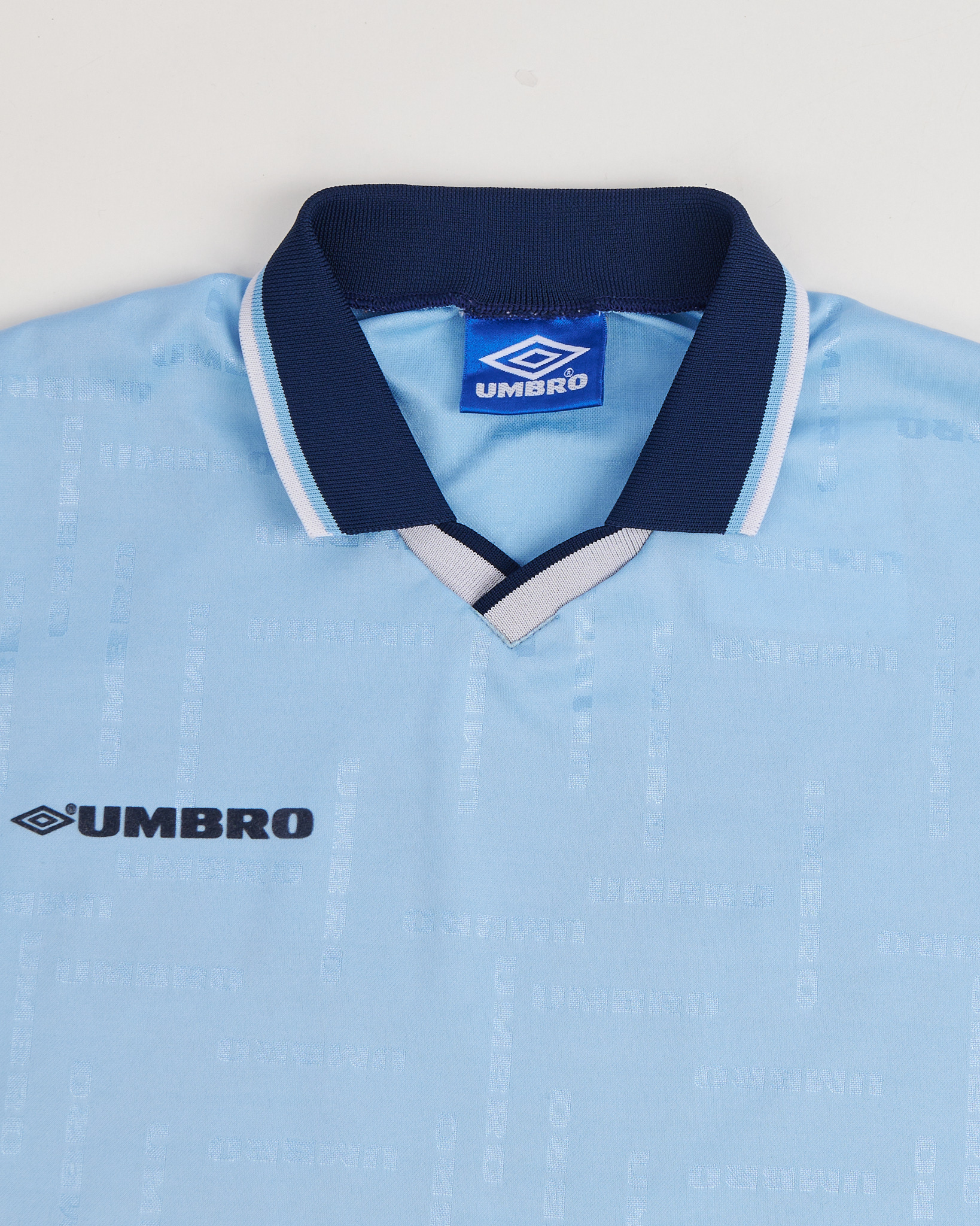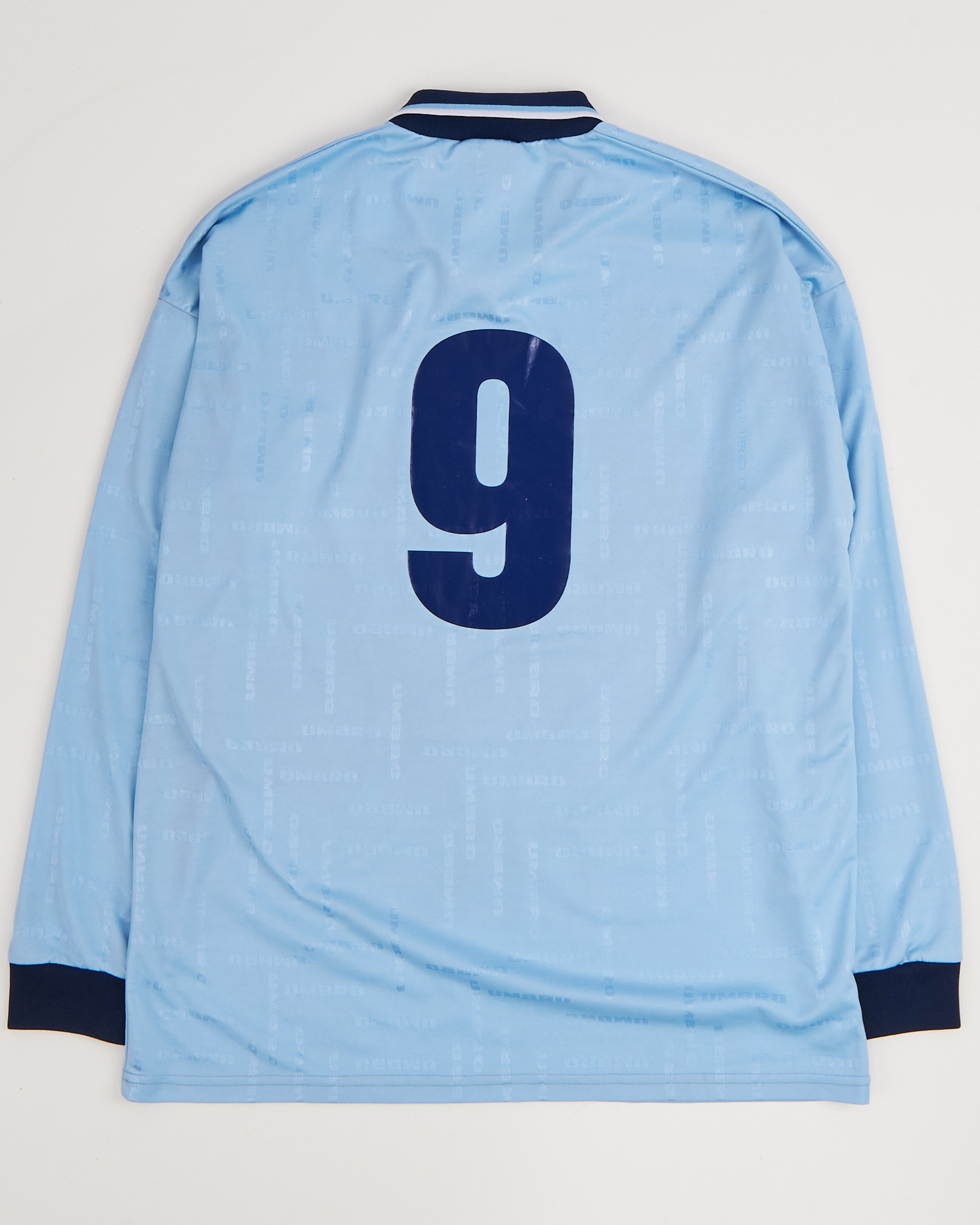 Лонгслив из лёгкого синтетического материала Umbro. Ткань с лёгким блеском и фирменным жаккардовым узором. Светло-голубой оттенок с контрастным воротником и манжетами в тёмно-синем цвете. Прямой крой. Логотип на груди и крупный номер на спине