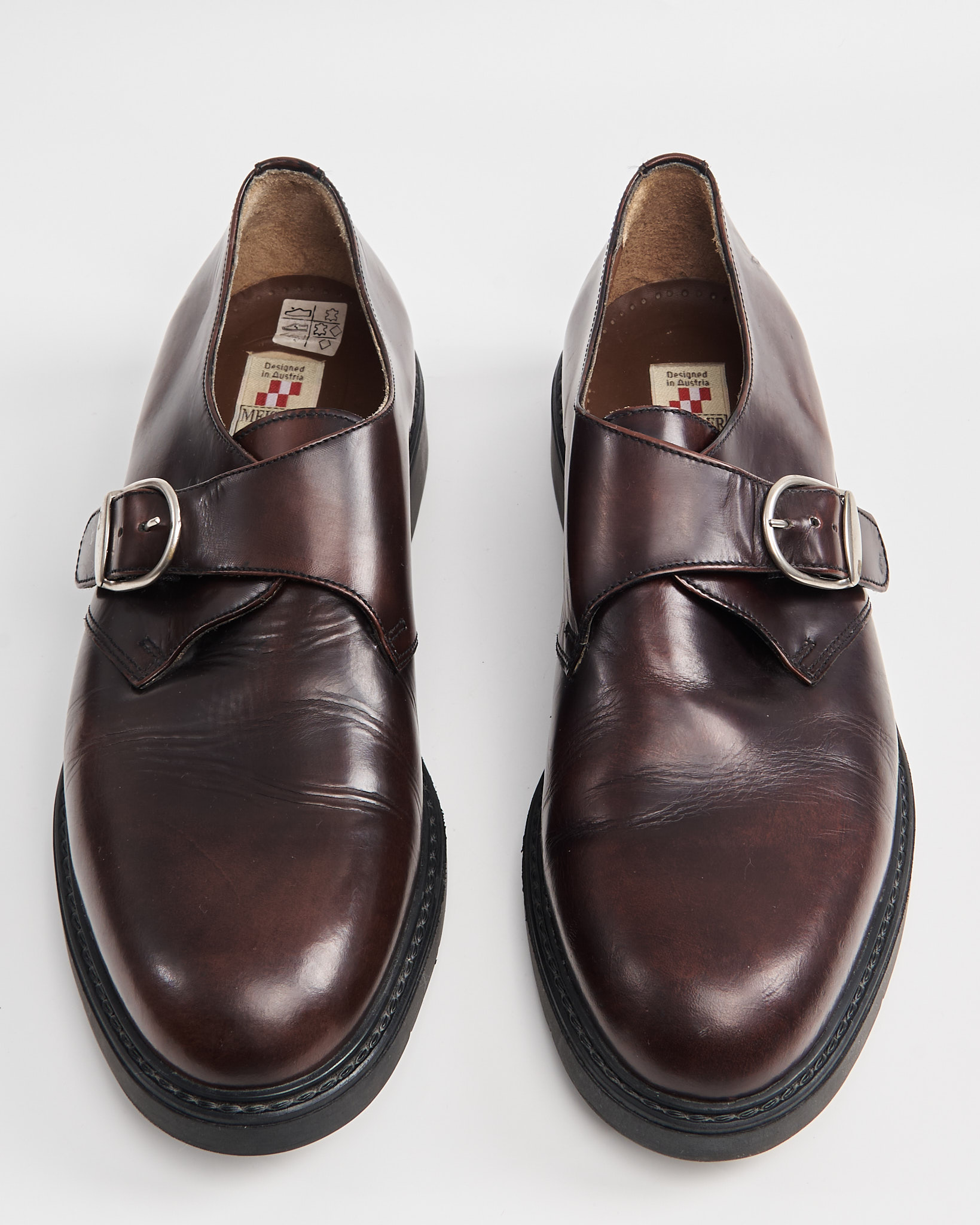 Австрийские монки Meister Klasse из 100% натуральной кожи. Колодка обеспечивает жесткую фиксацию и комфортную посадку в течение всего дня. Массивная серебристая пряжка и маркировка австрийского дизайна на стельке. Прочная подошва с протектором гарантирует долговечность и устойчивость.