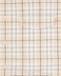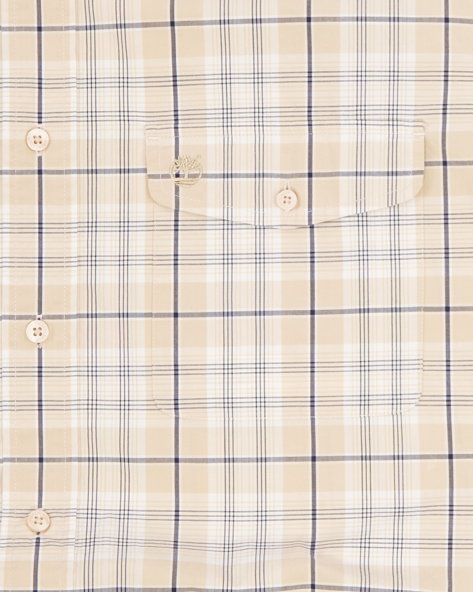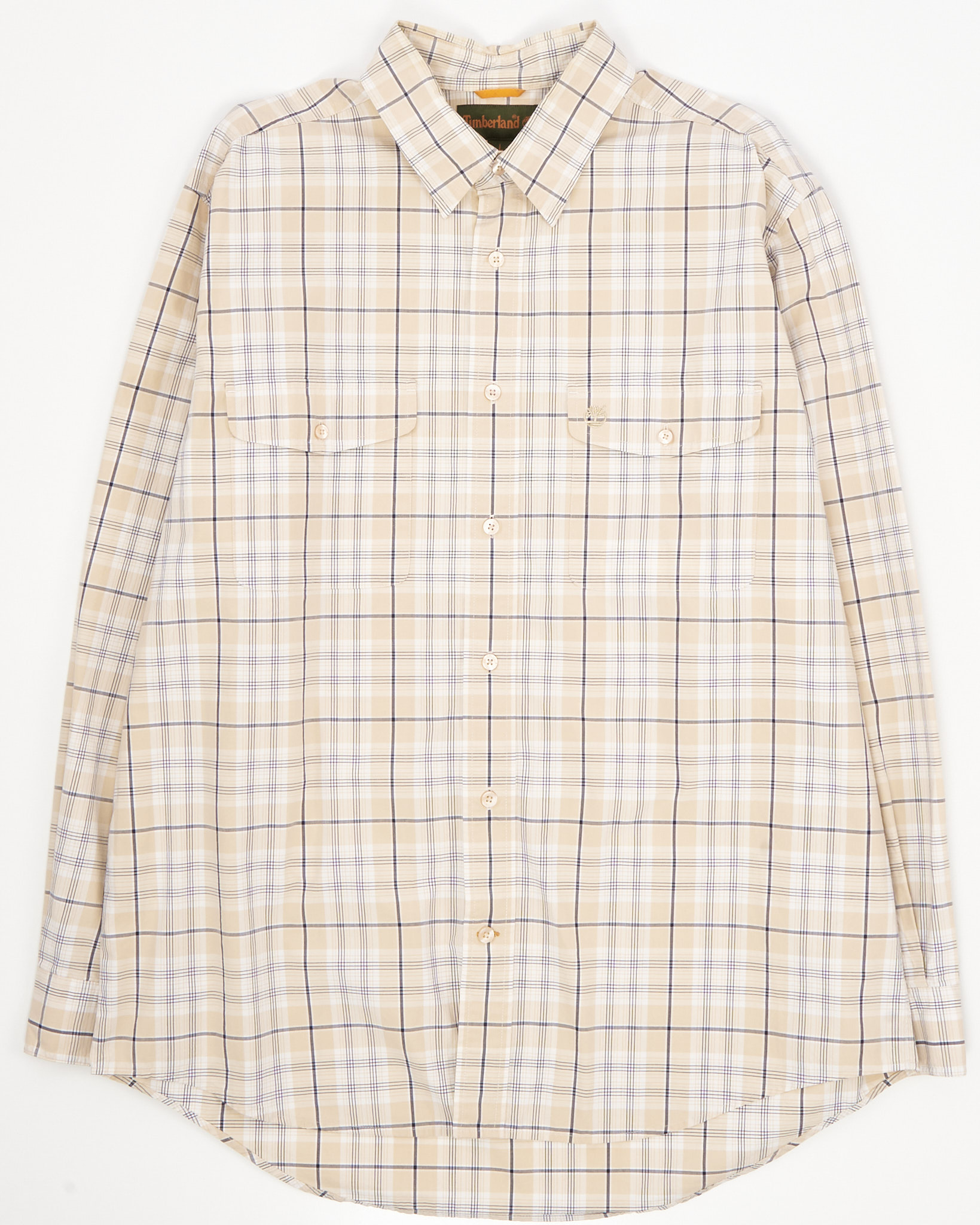 Рубашка от из 100% хлопка от бренда Timberland. Классическая бежевая клетка. Прямой крой, два нагрудных кармана с клапанами и пуговицами, вышитый логотип Timberland на левом кармане.