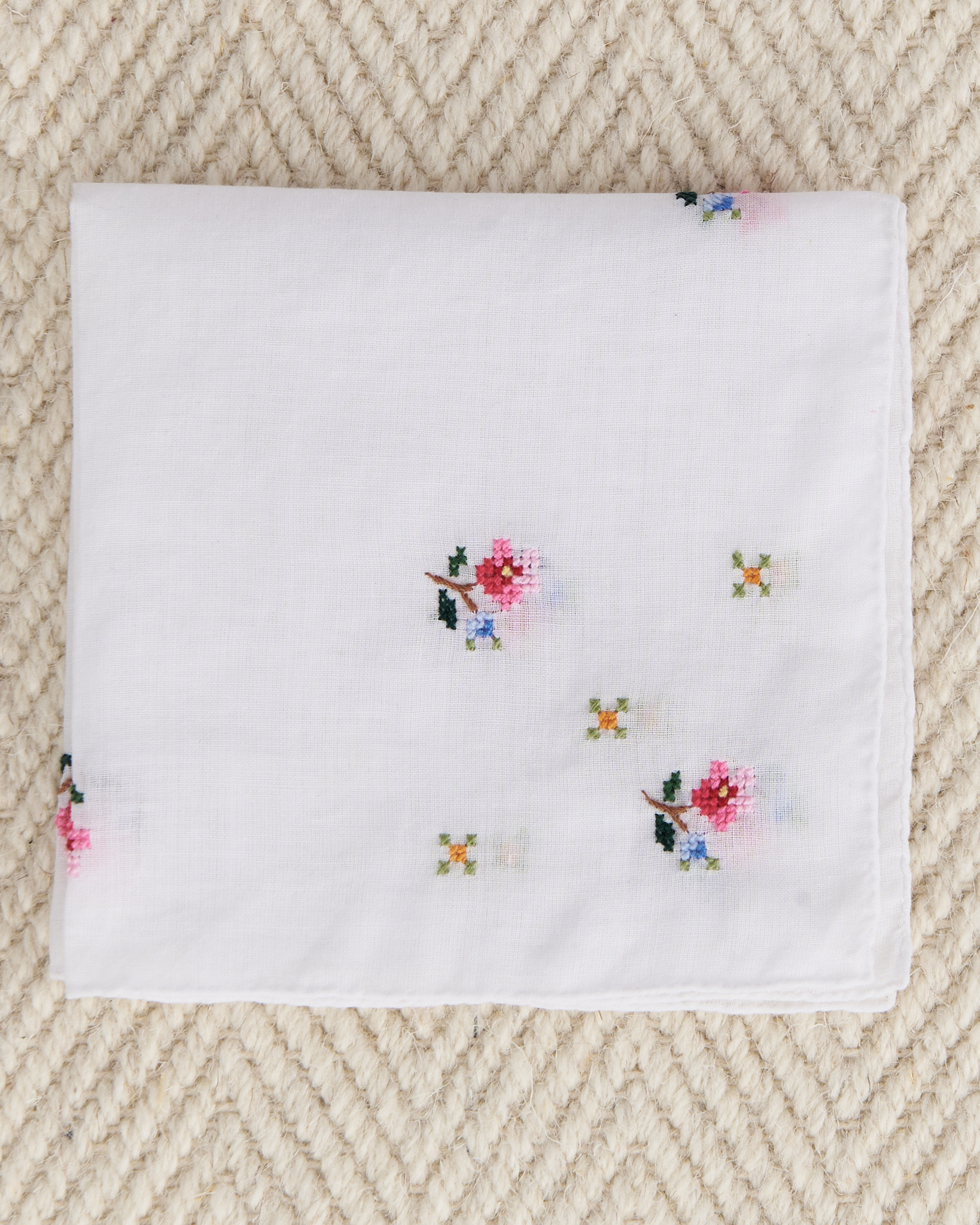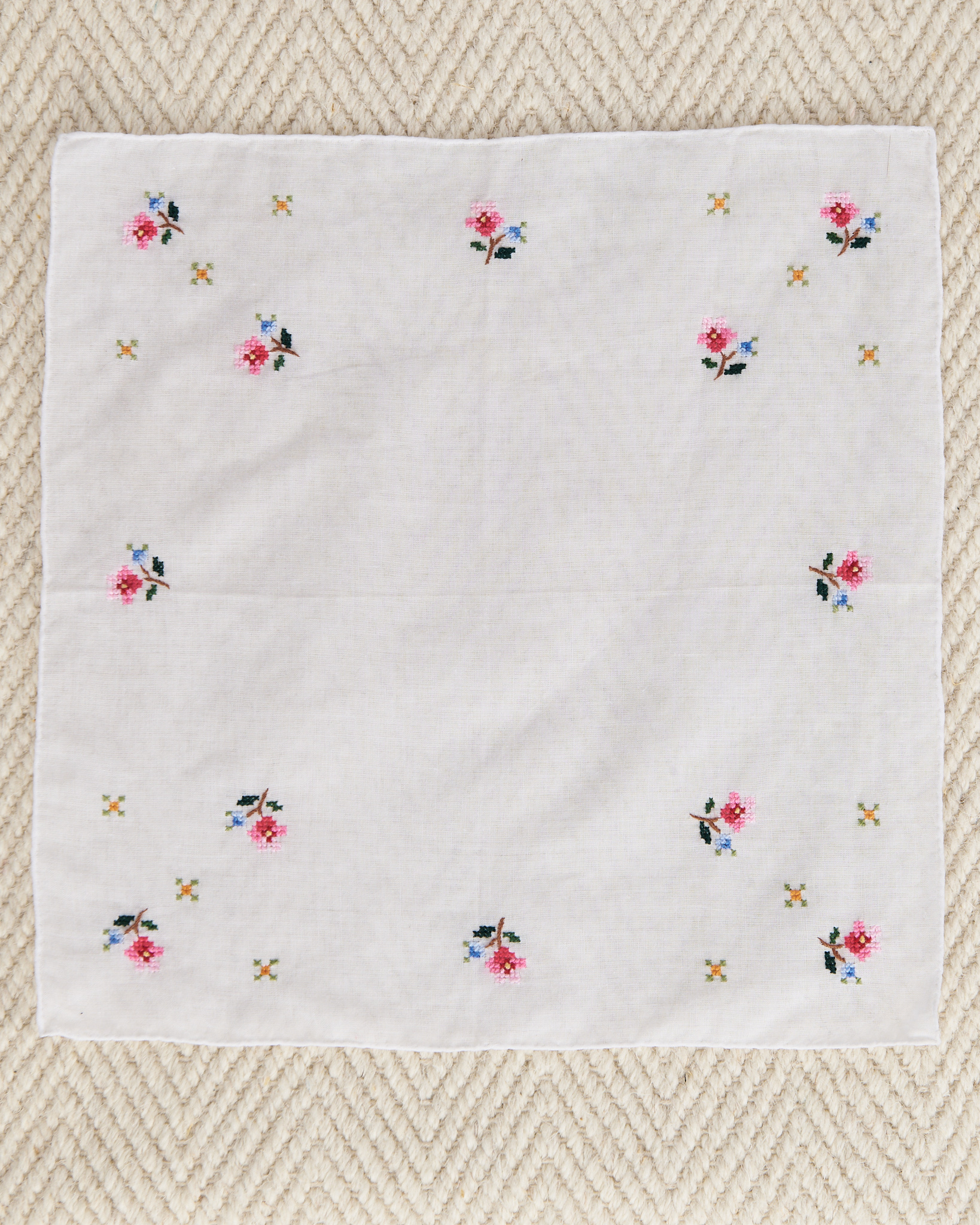 Платок выполнен из 100% хлопка в светлом оттенке с вышивкой с мелкими цветами. Ручная работа.