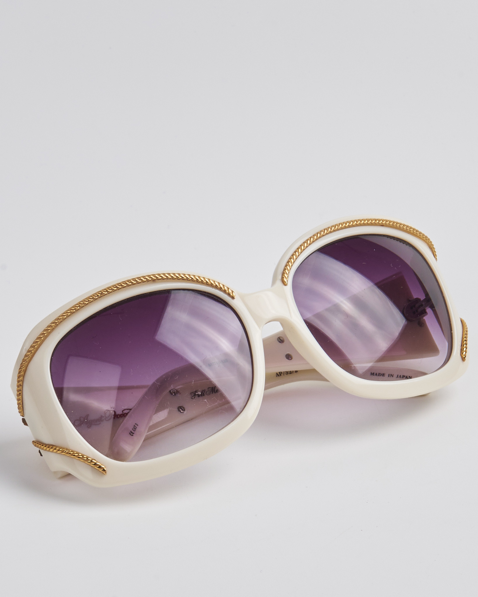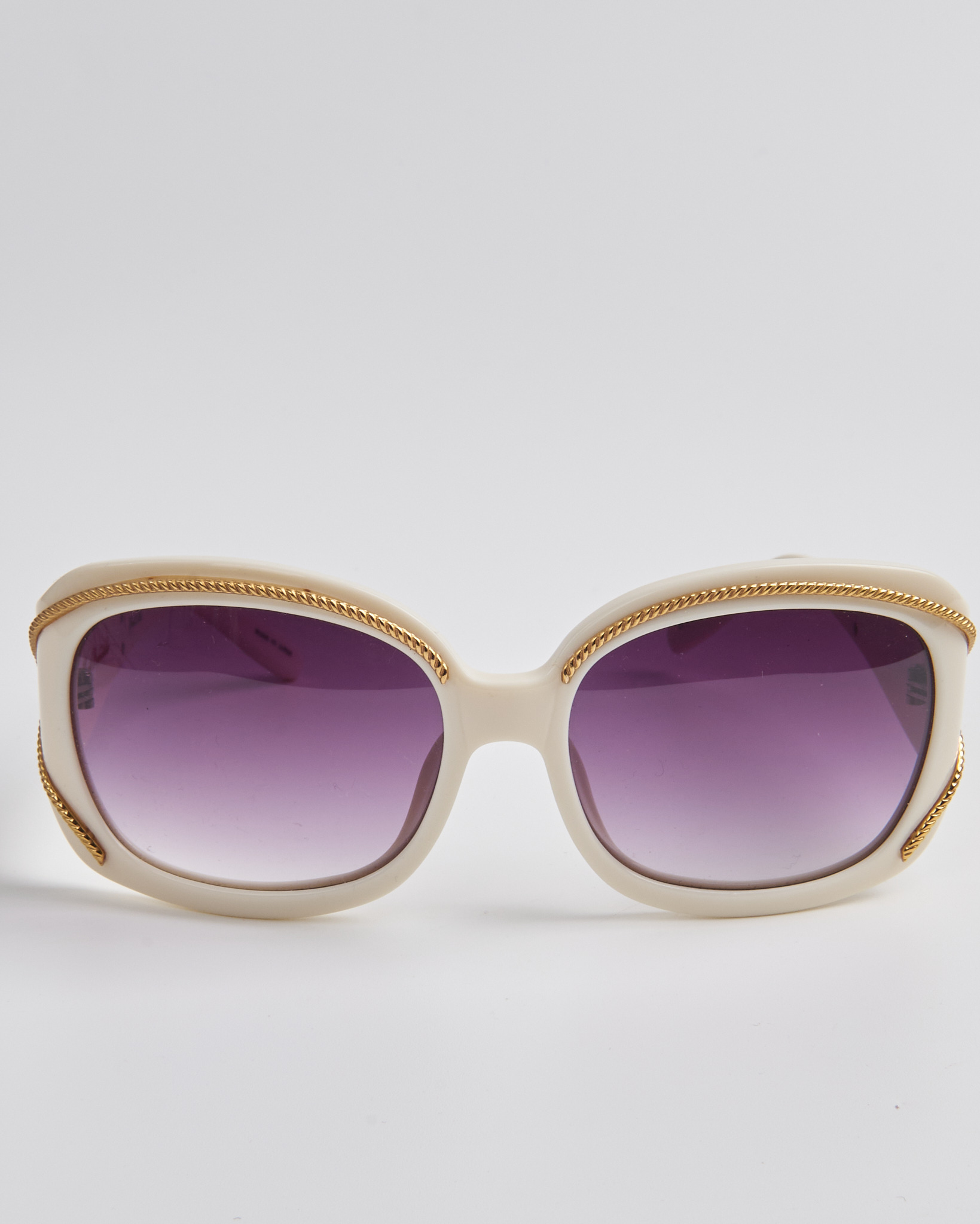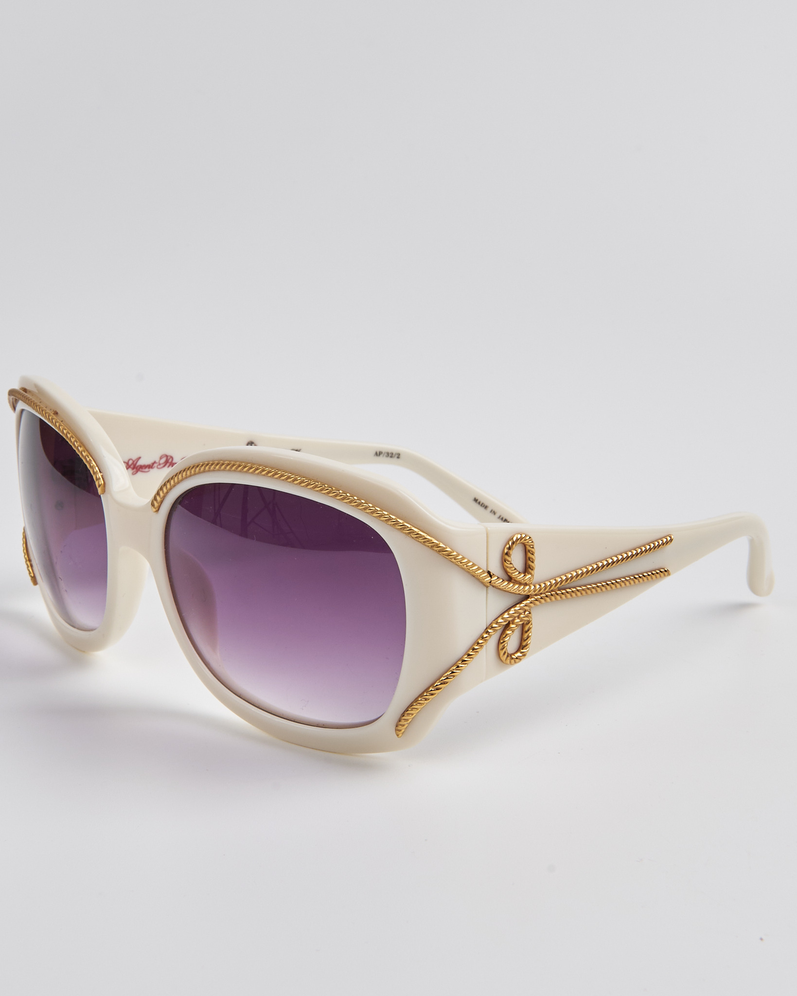 Солнцезащитные очки Agent Provocateur в светлой оправе, линзы с фиолетовым градиентом дают мягкий оттенок. Золотистый декор по линии оправы