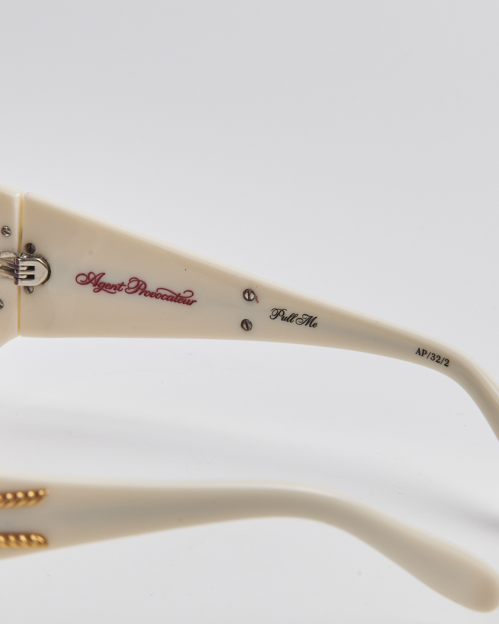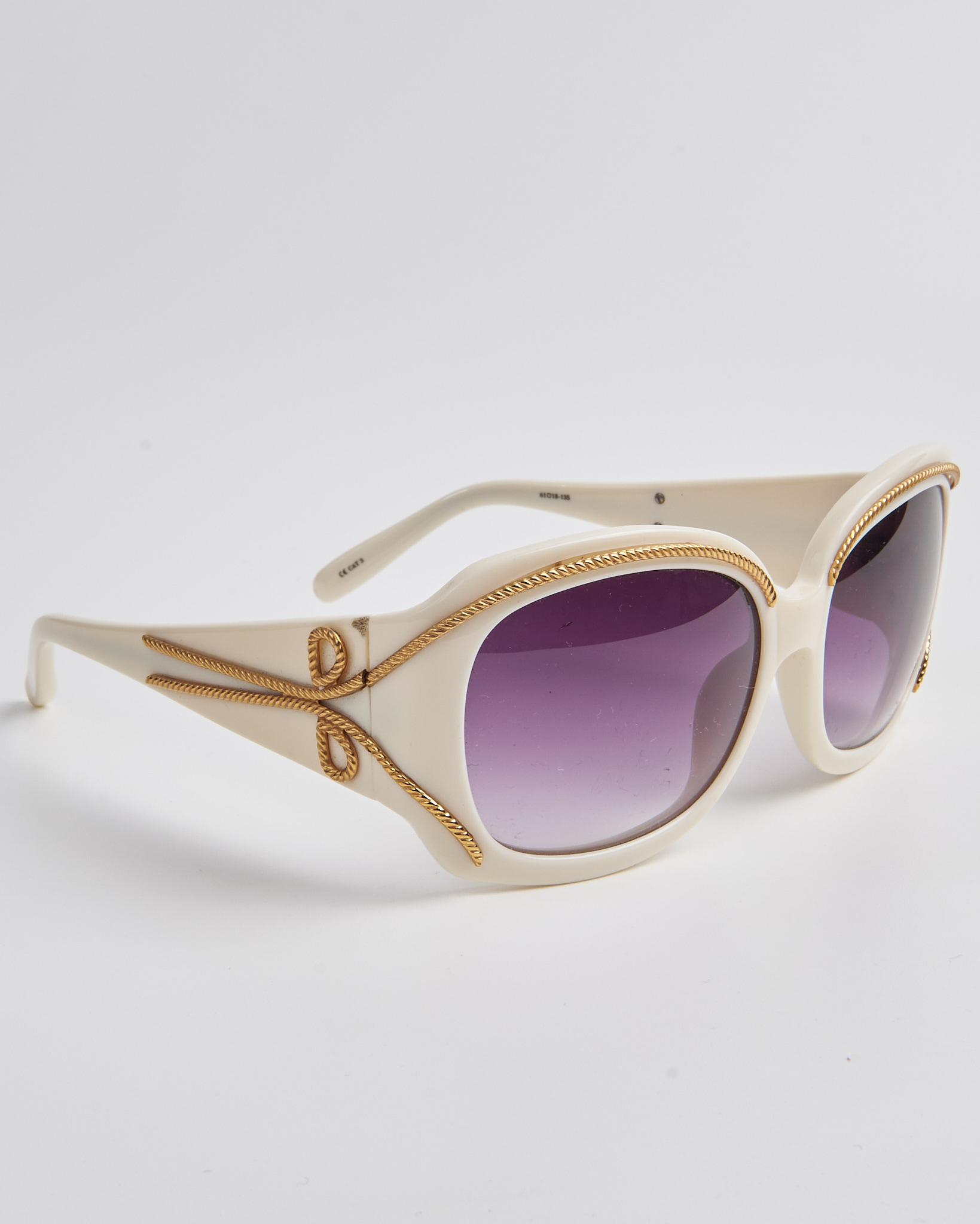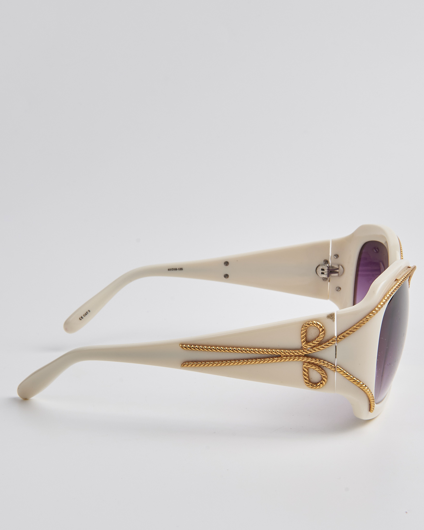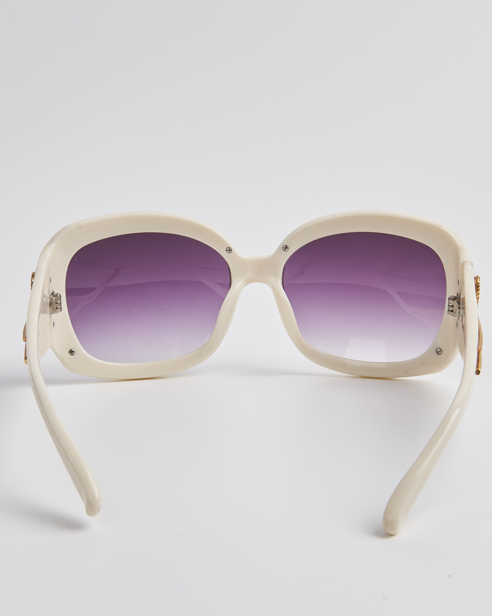 Солнцезащитные очки Agent Provocateur в светлой оправе, линзы с фиолетовым градиентом дают мягкий оттенок. Золотистый декор по линии оправы