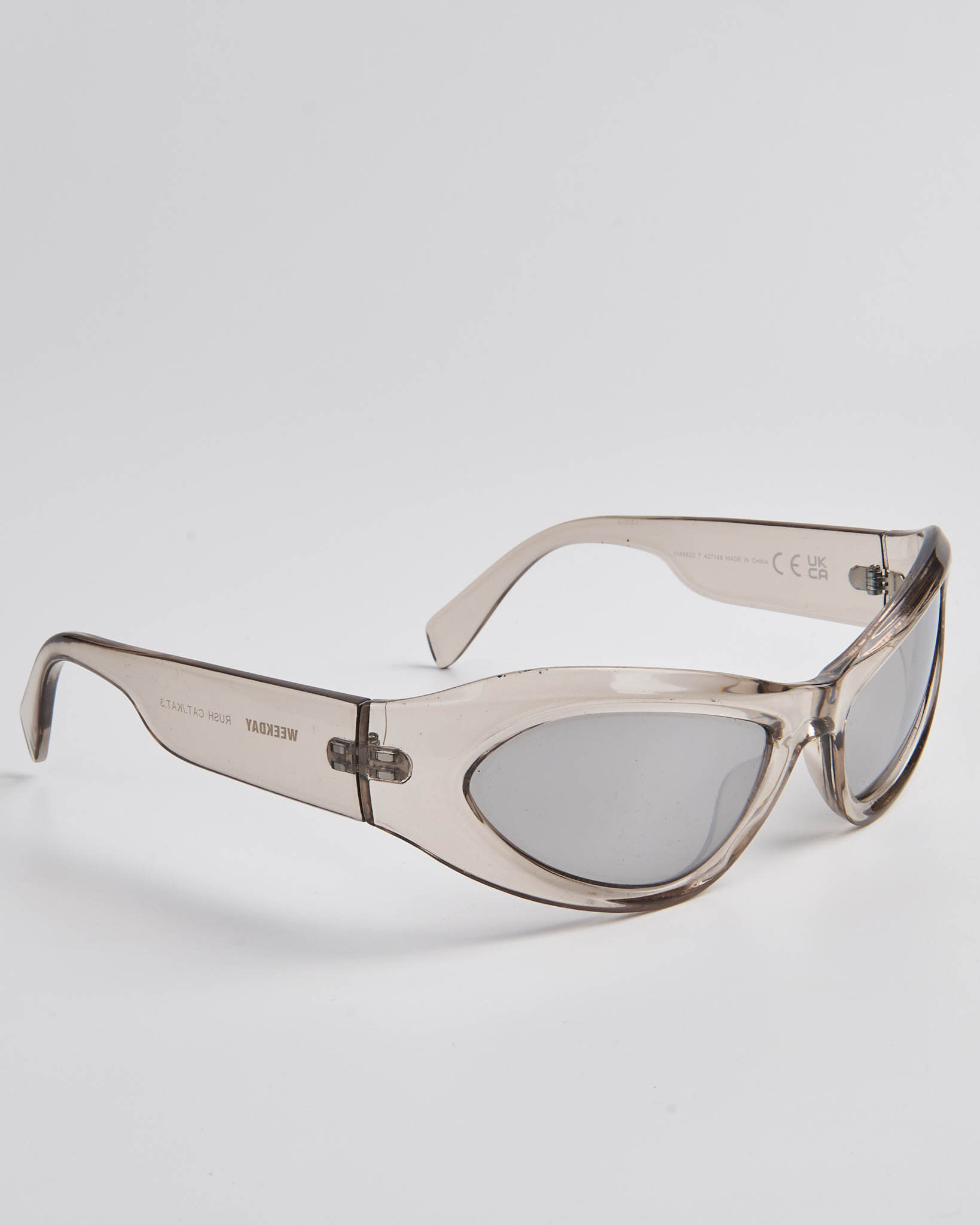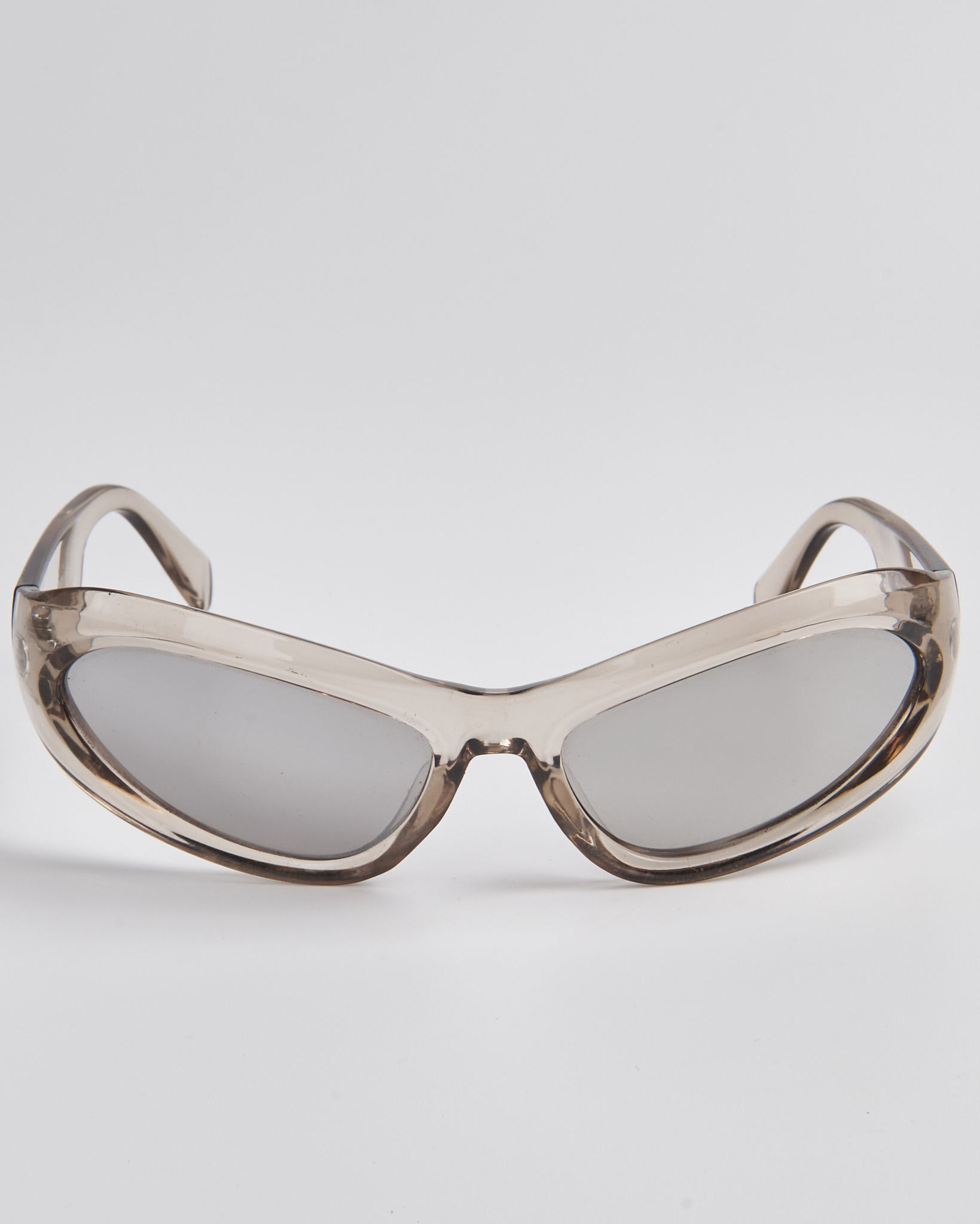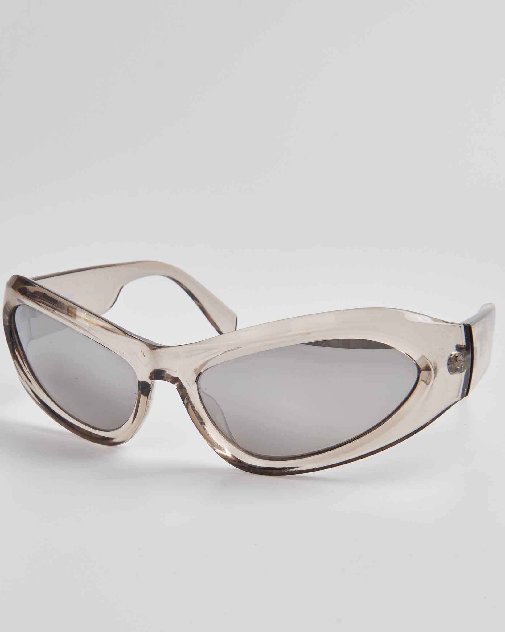 Очки с вытянутой овальной формой линз. Полупрозрачная оправа в оттенке металлик
