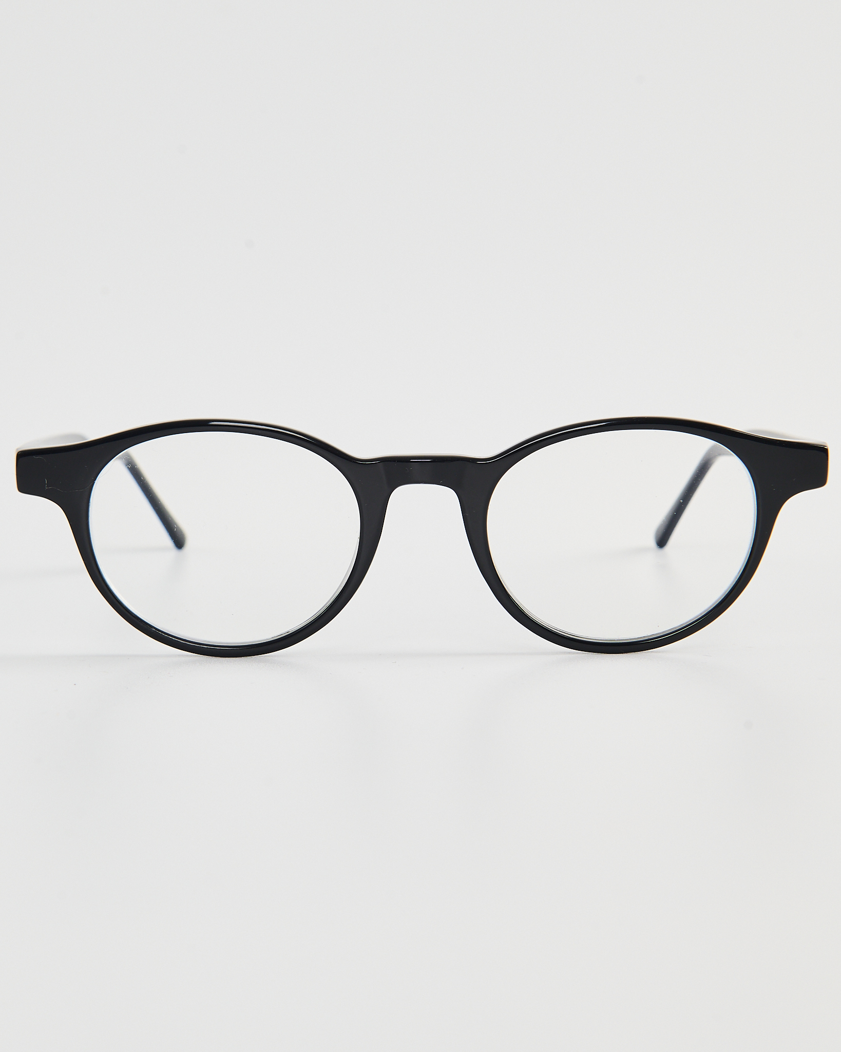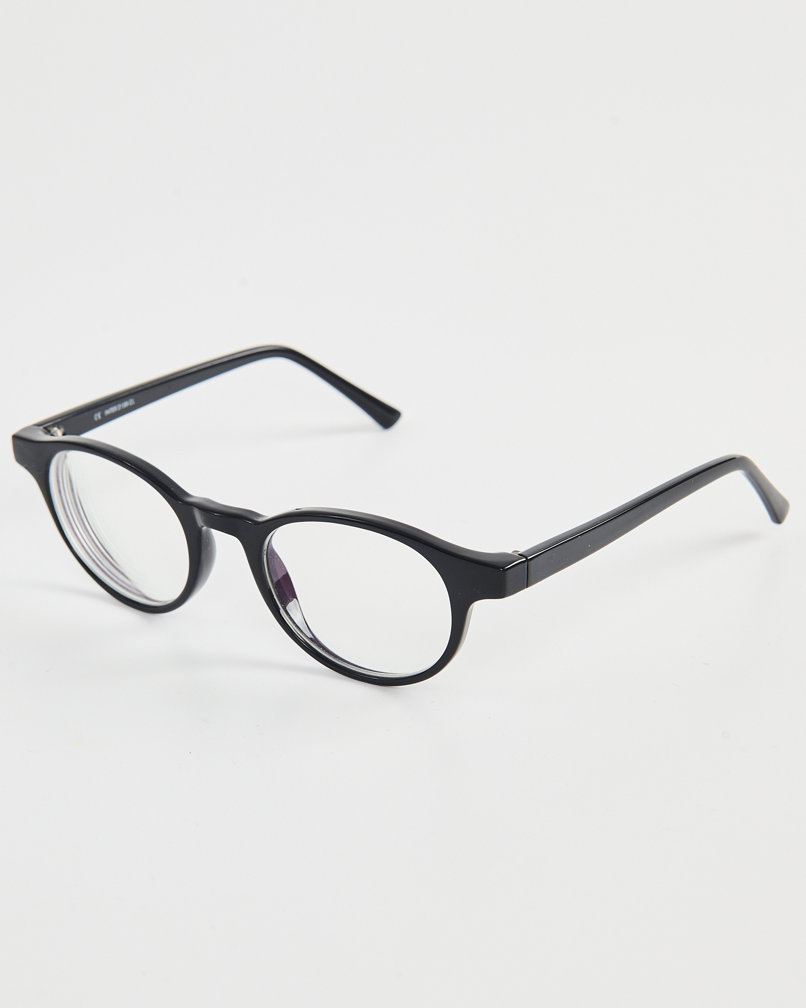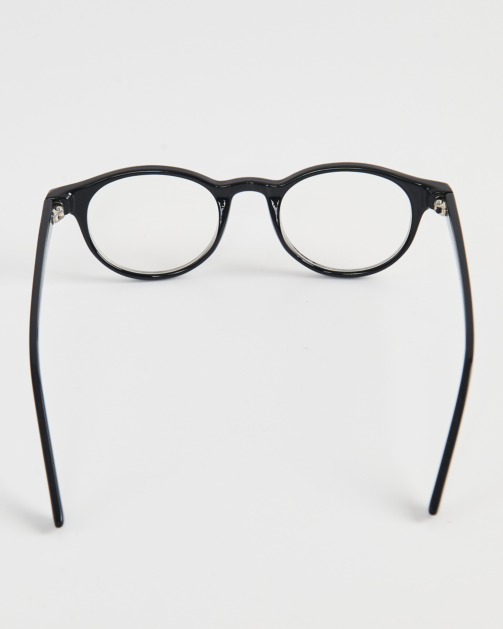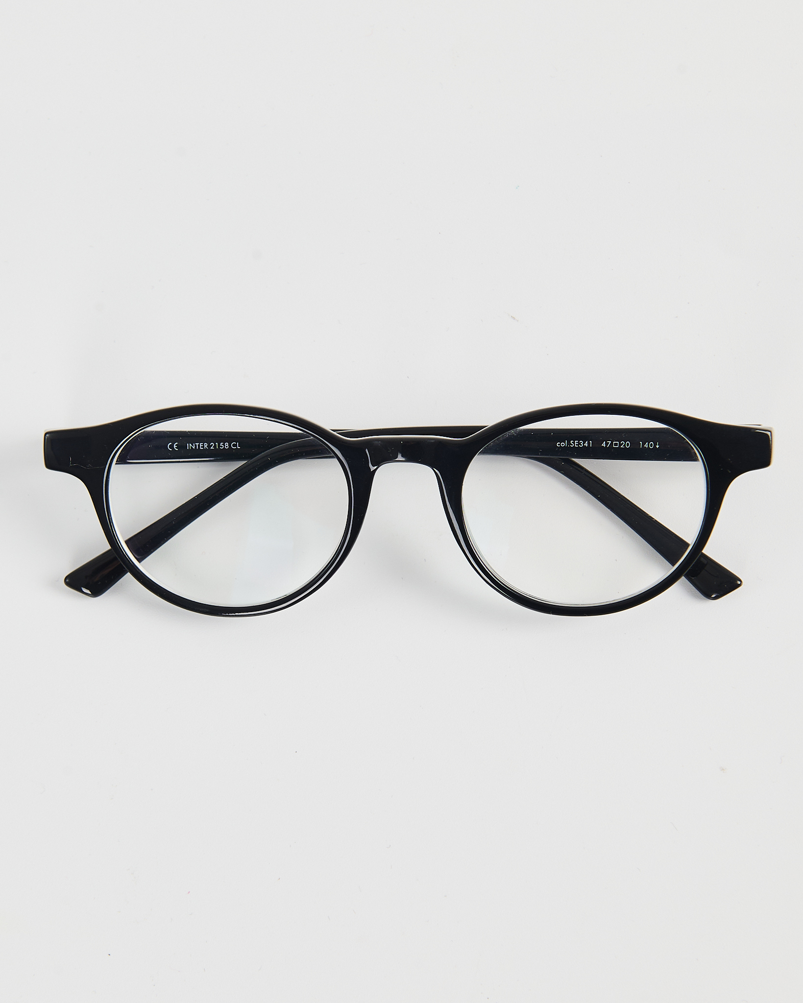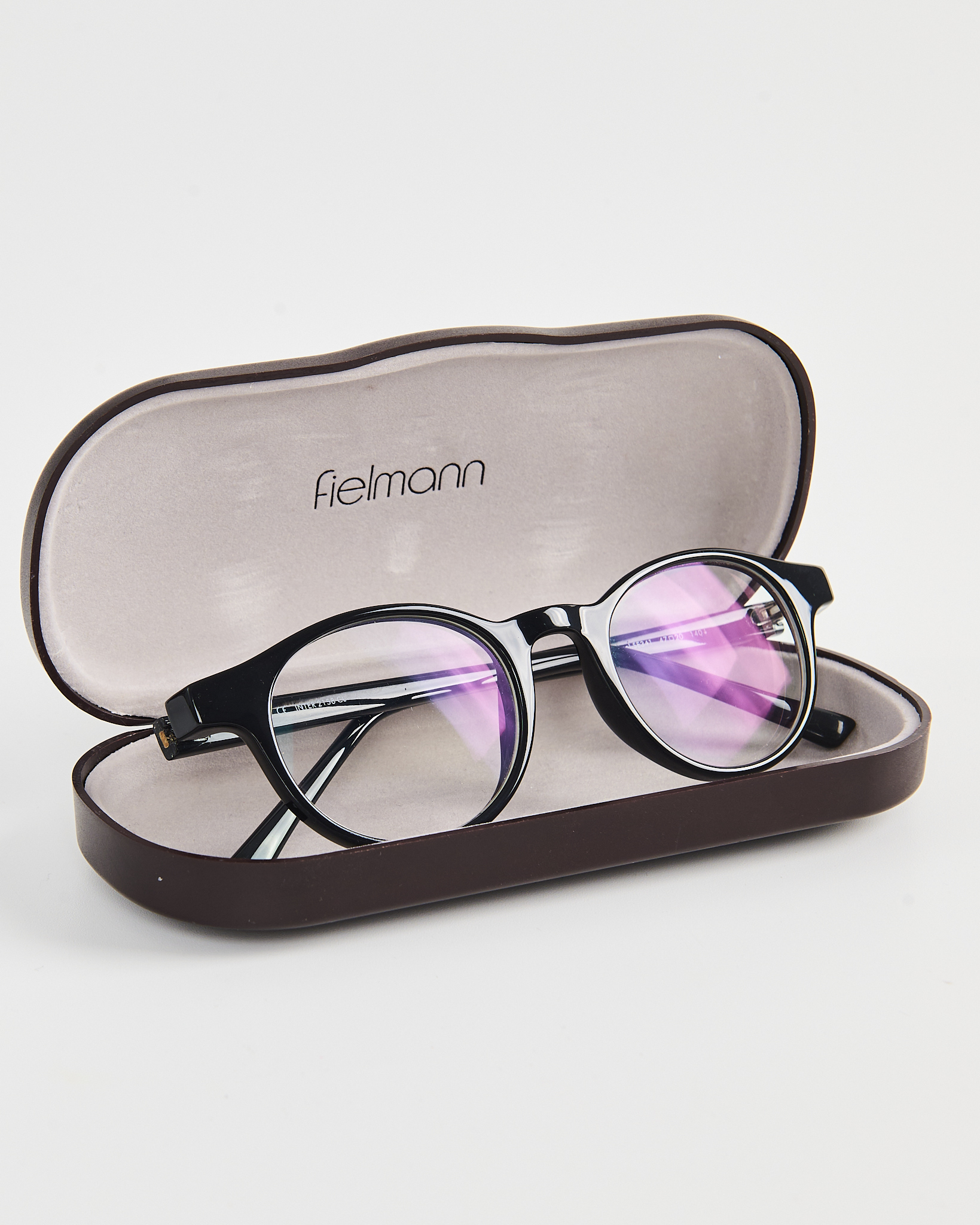 Оправа Fielmann с округлой формой линз и чёрной оправой. Пластик гладкий, плотный.