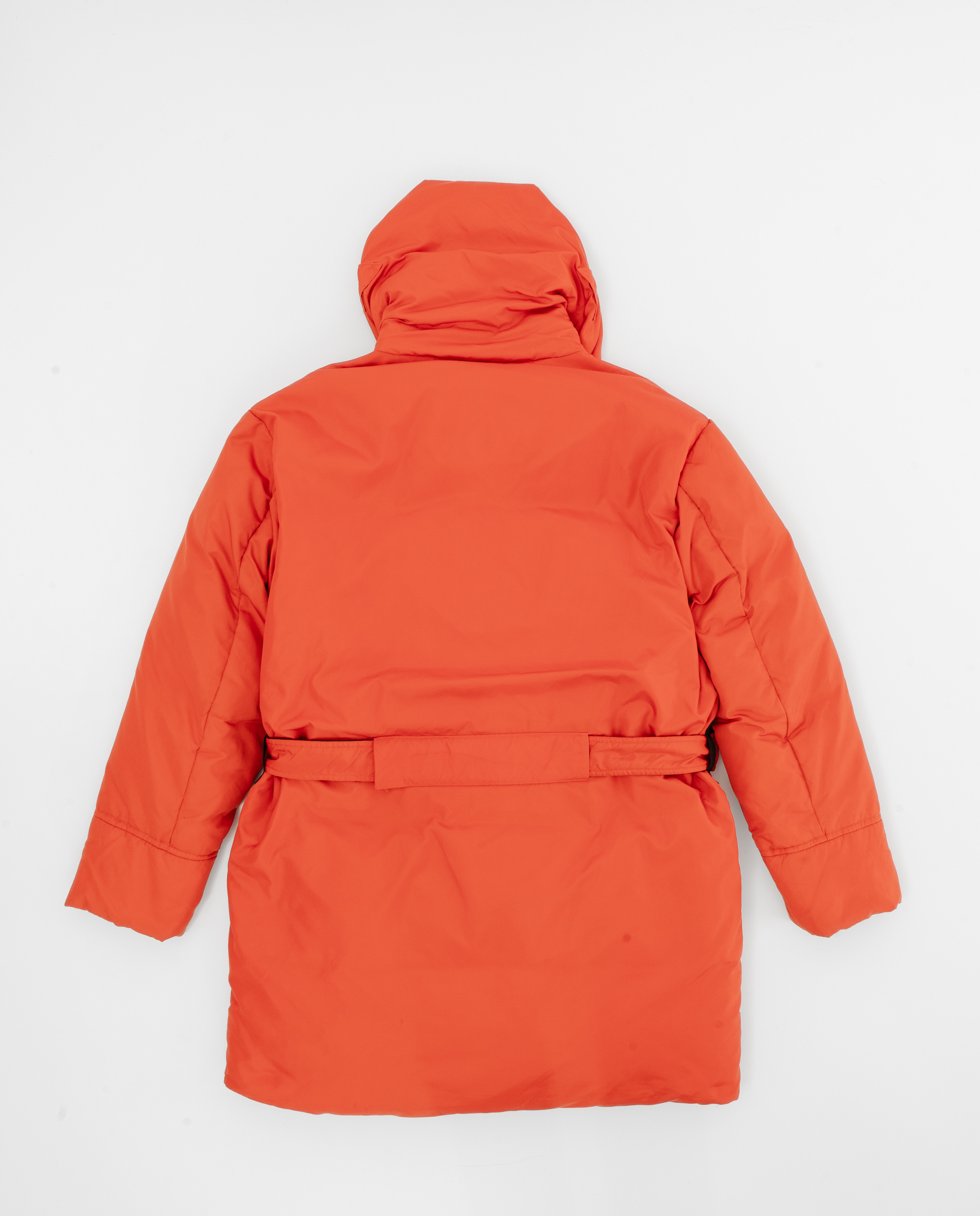 - Прямой силуэт со съёмным поясом даёт комфортную посадку по фигуре и позволяет слегка утянуть талию
