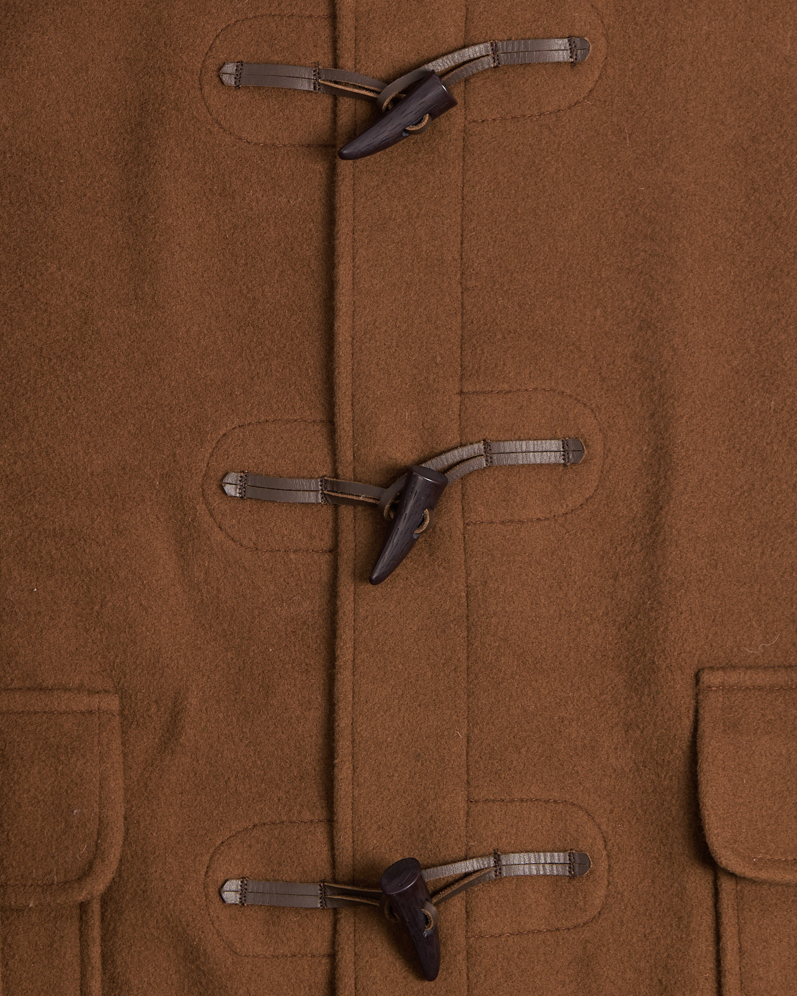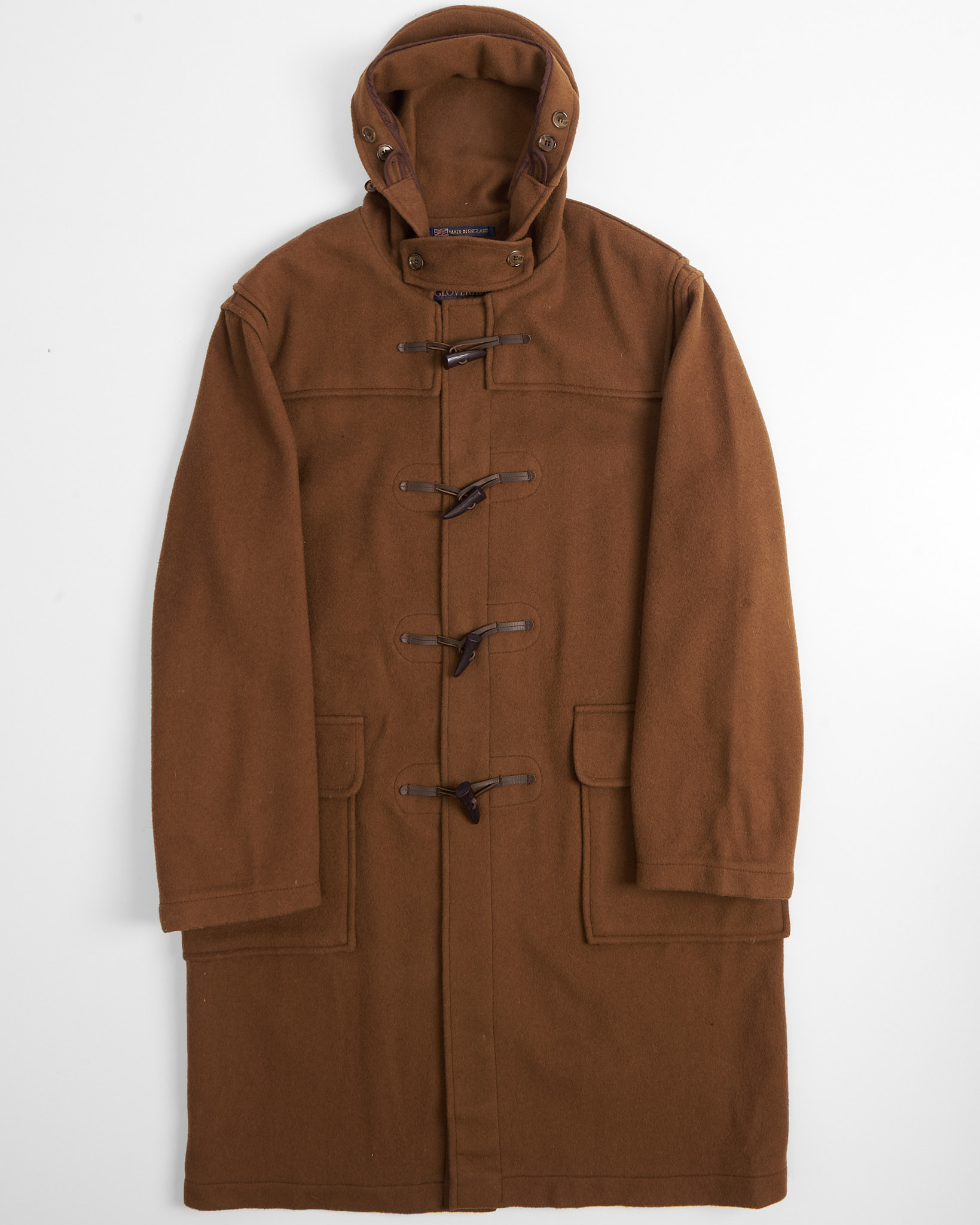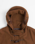 Пальто из 80% шерсти  от культовой британской марки Gloverall. Прямой свободный крой, фирменные пуговицы-клыки на кожаных петлях, капюшон и функциональные карманы по бокам.