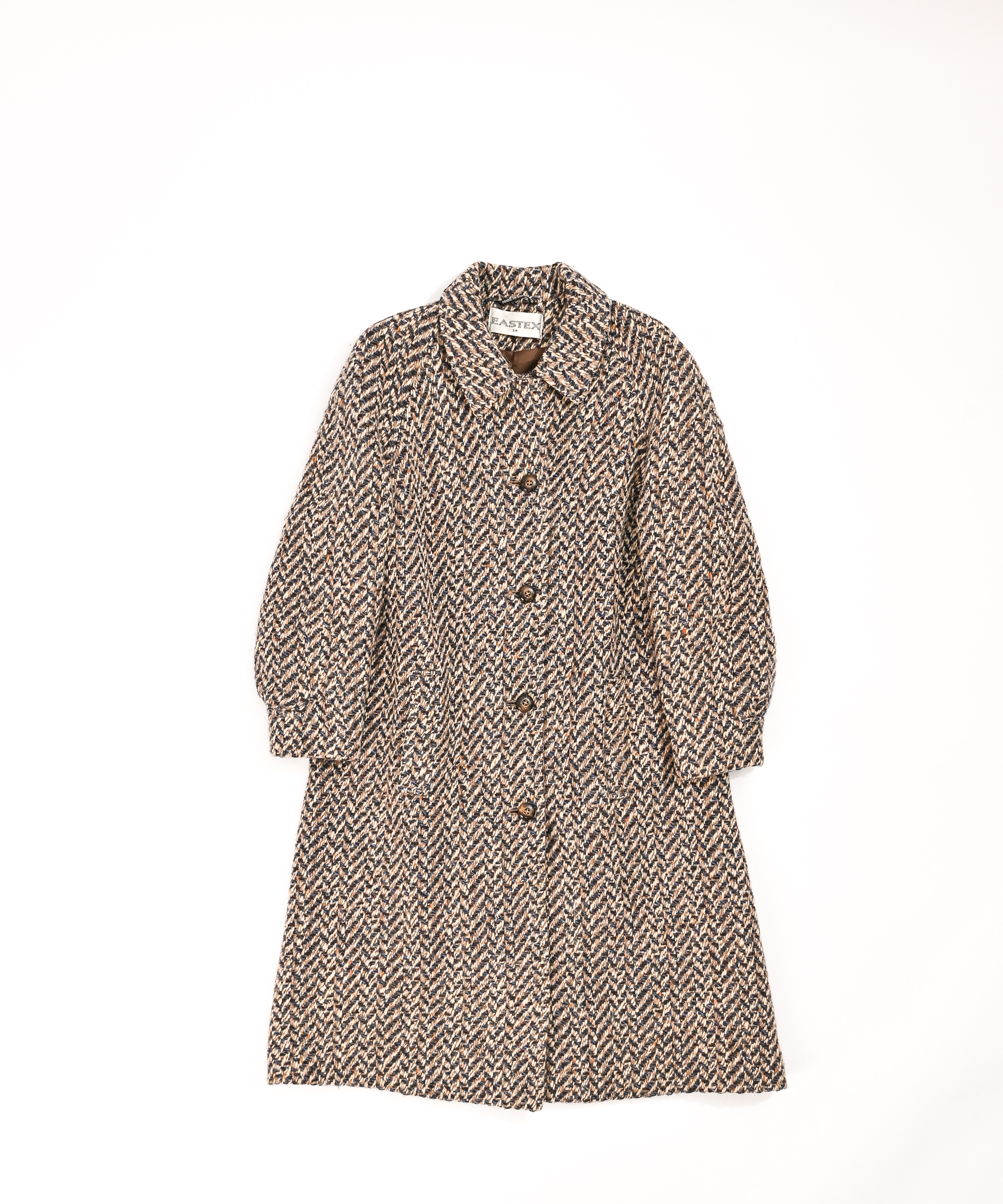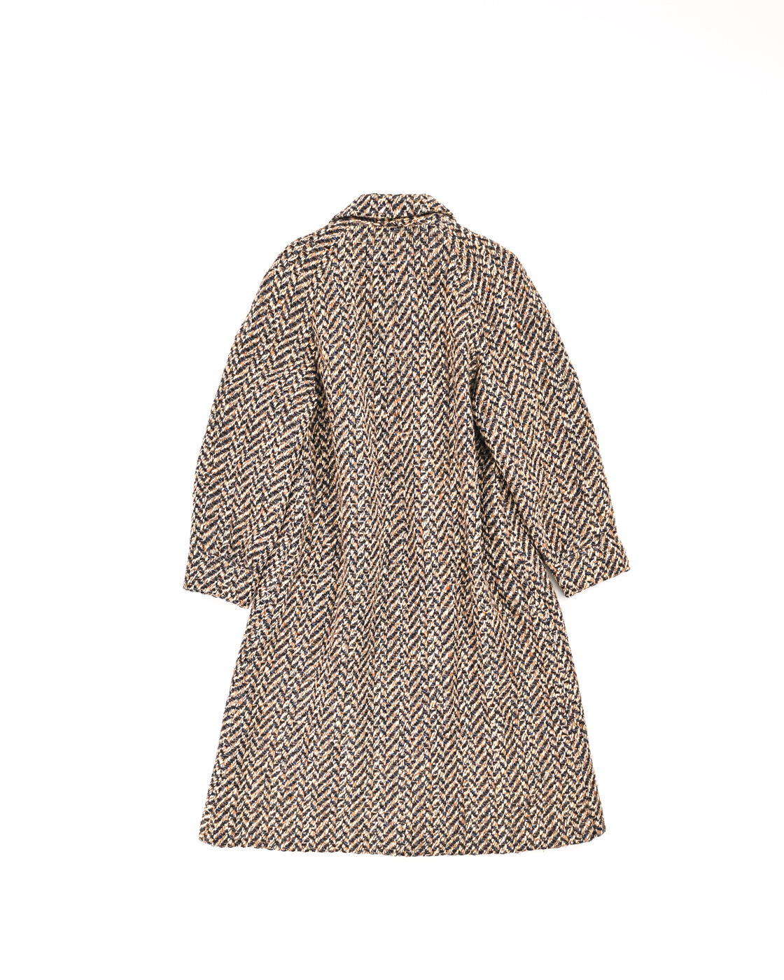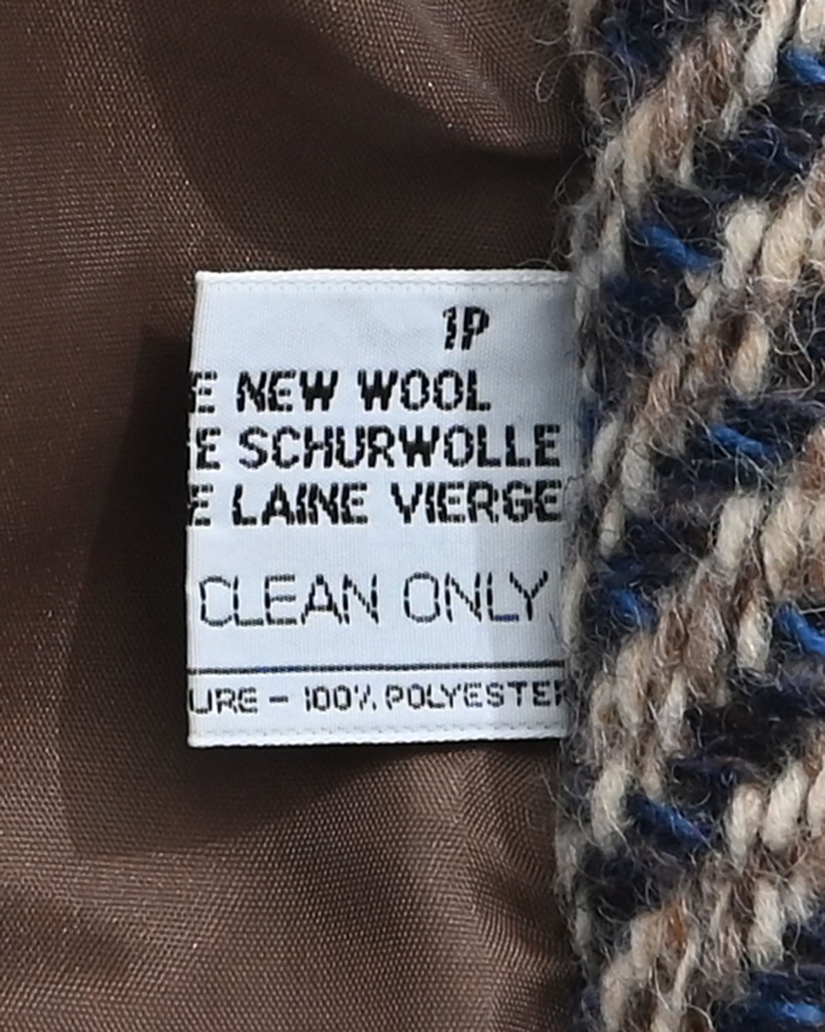 - Узор «ёлочка» в сочетании коричневых, бежевых и синих нитей создаёт глубокую текстуру и винтажный характер
