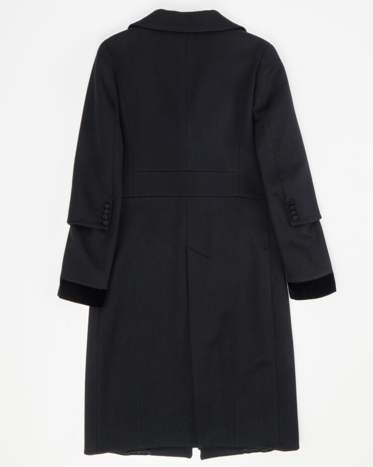 - Двубортная конструкция и удлинённый крой формируют выразительный образ