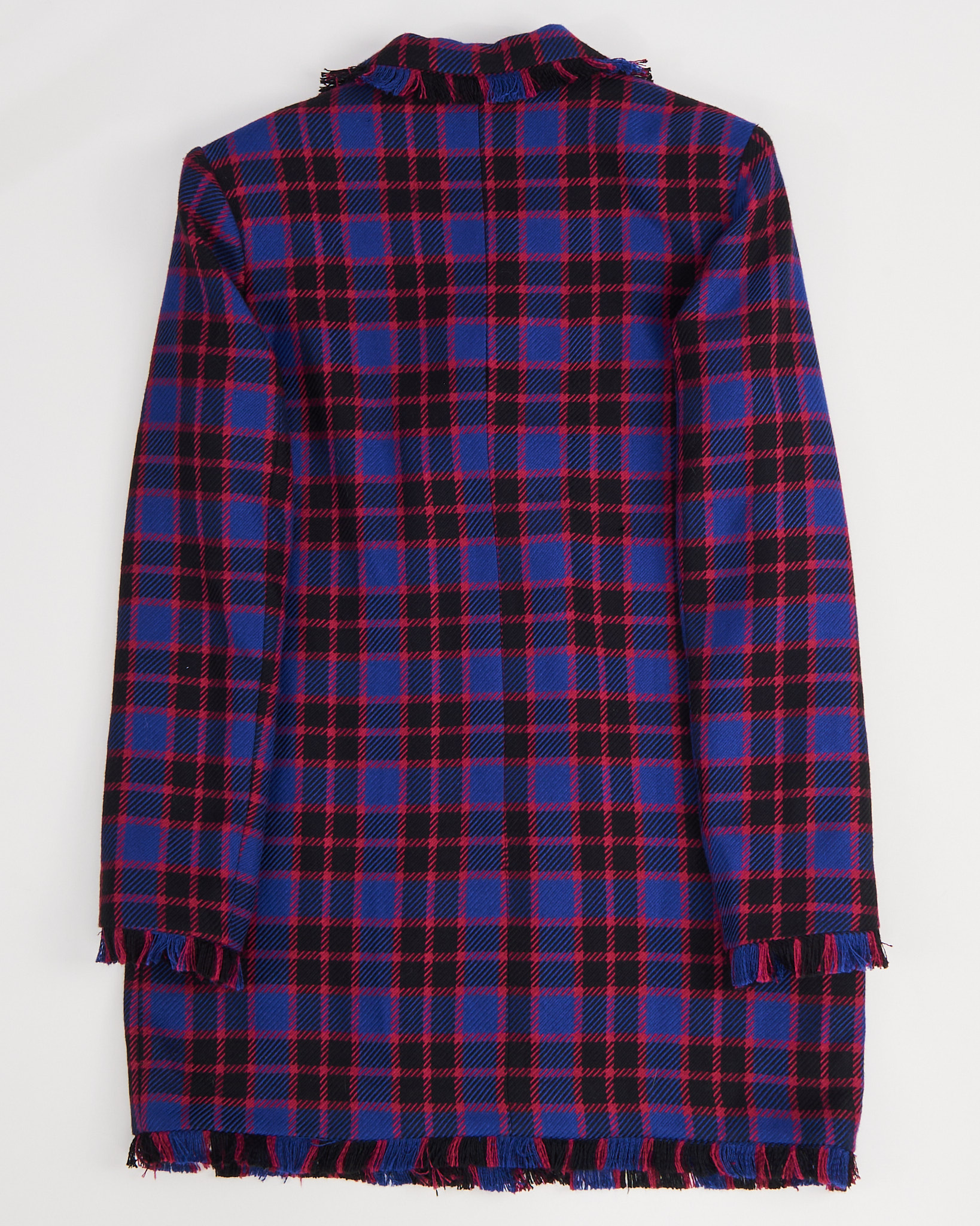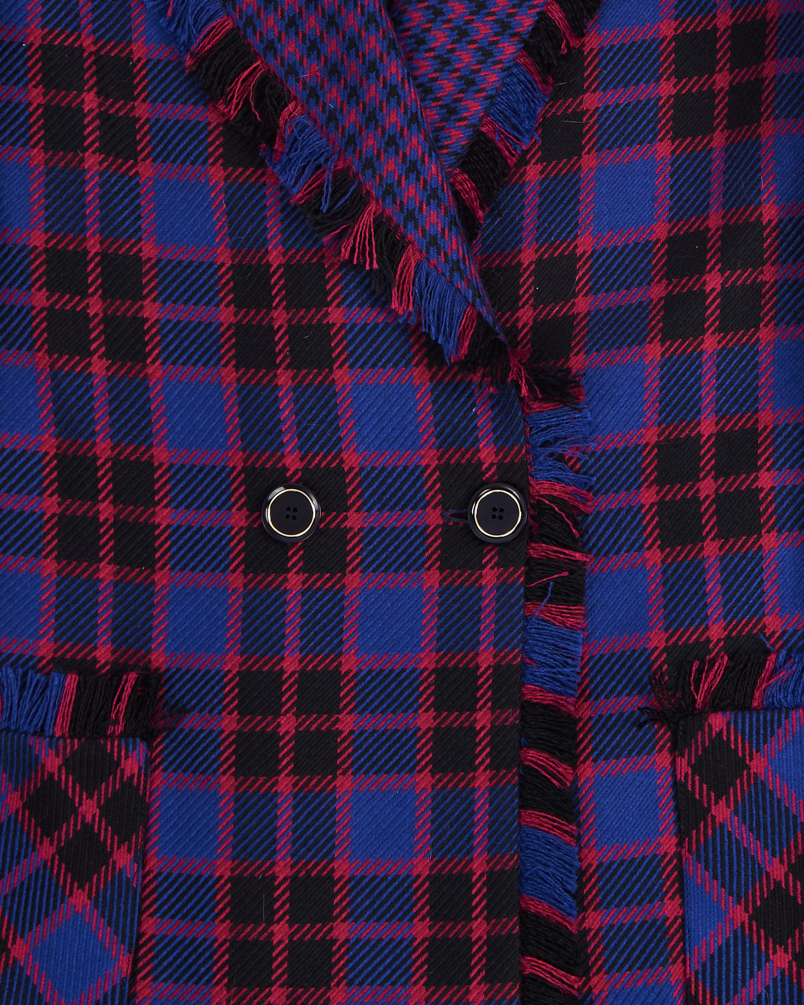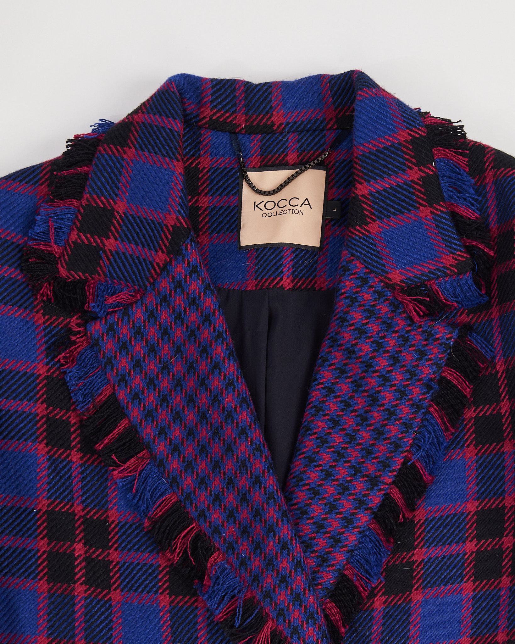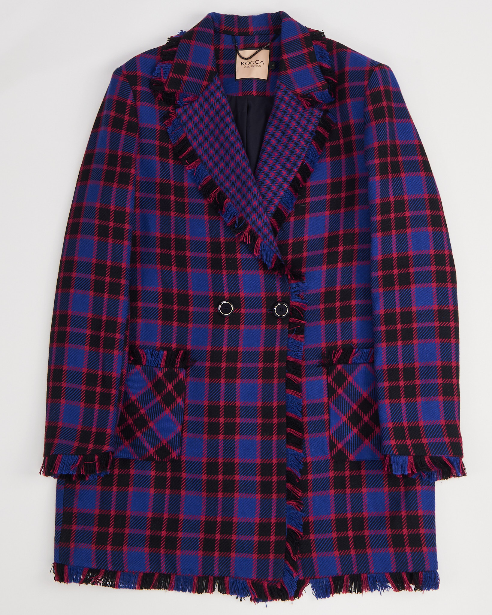 Пальто Kocca синего цвета с фиолетовой и черной клеткой. Ткань плотная с с фактурным переплетением. Двубортная застежка на пуговицы. Широкие лацканы с отделкой из бахромы. Два функциональных кармана. Низ и манжеты также оформлены бахромой.