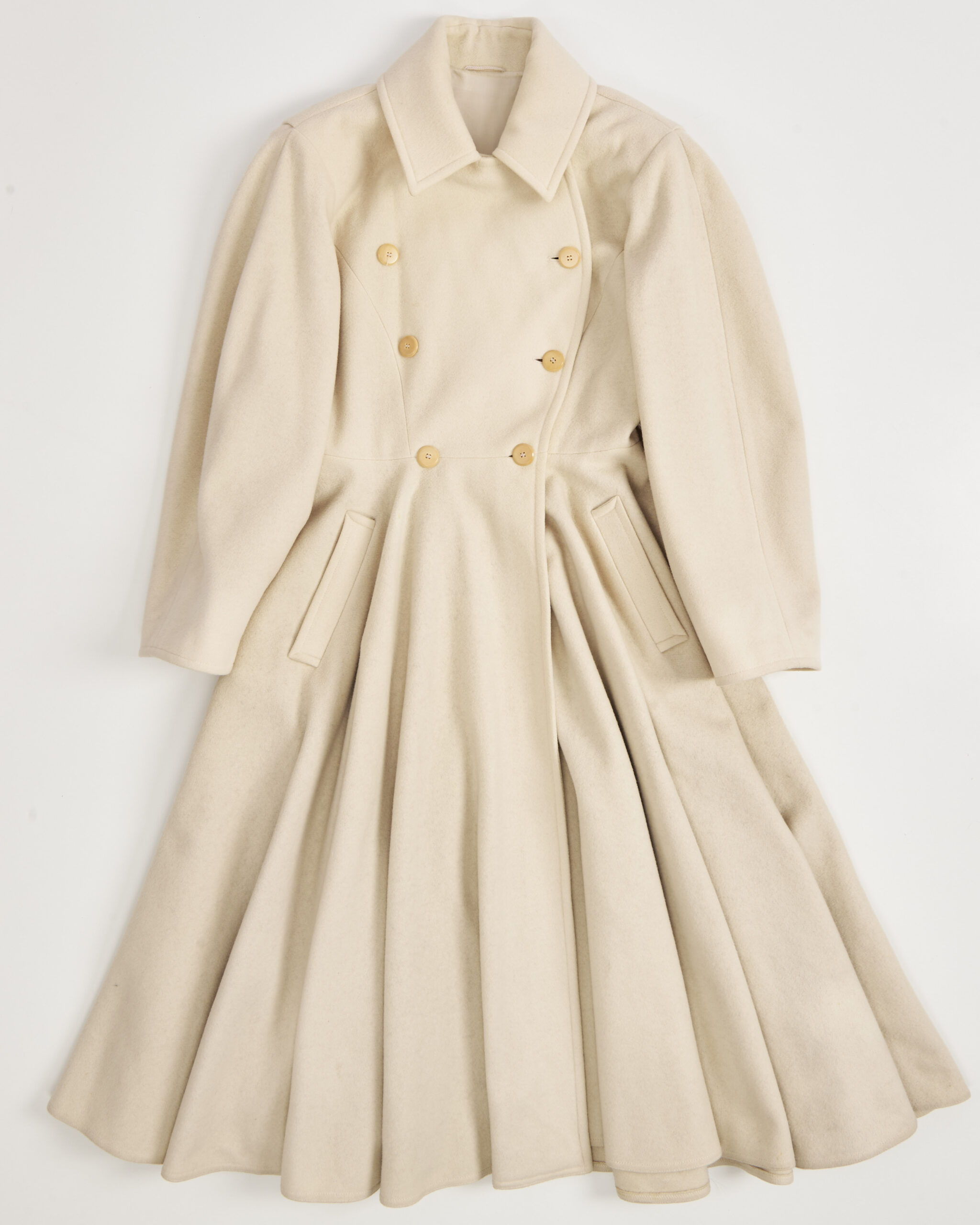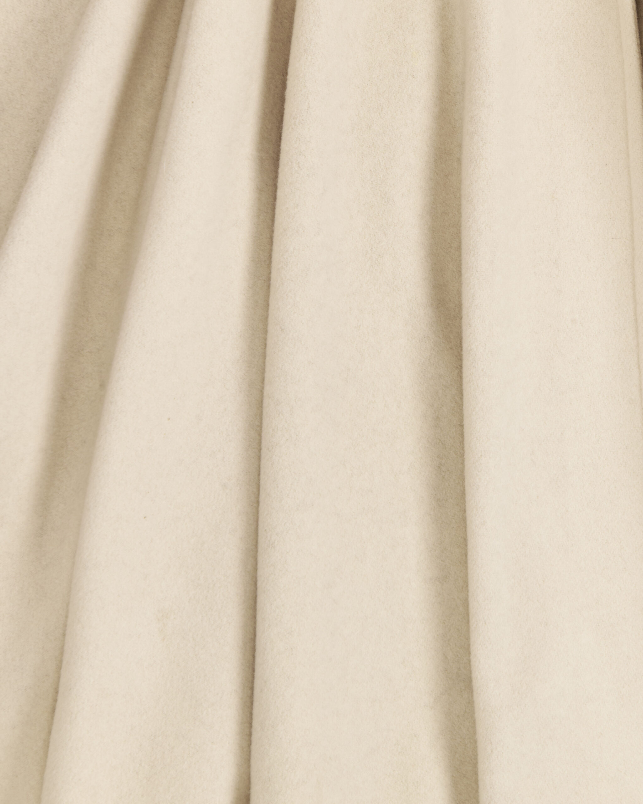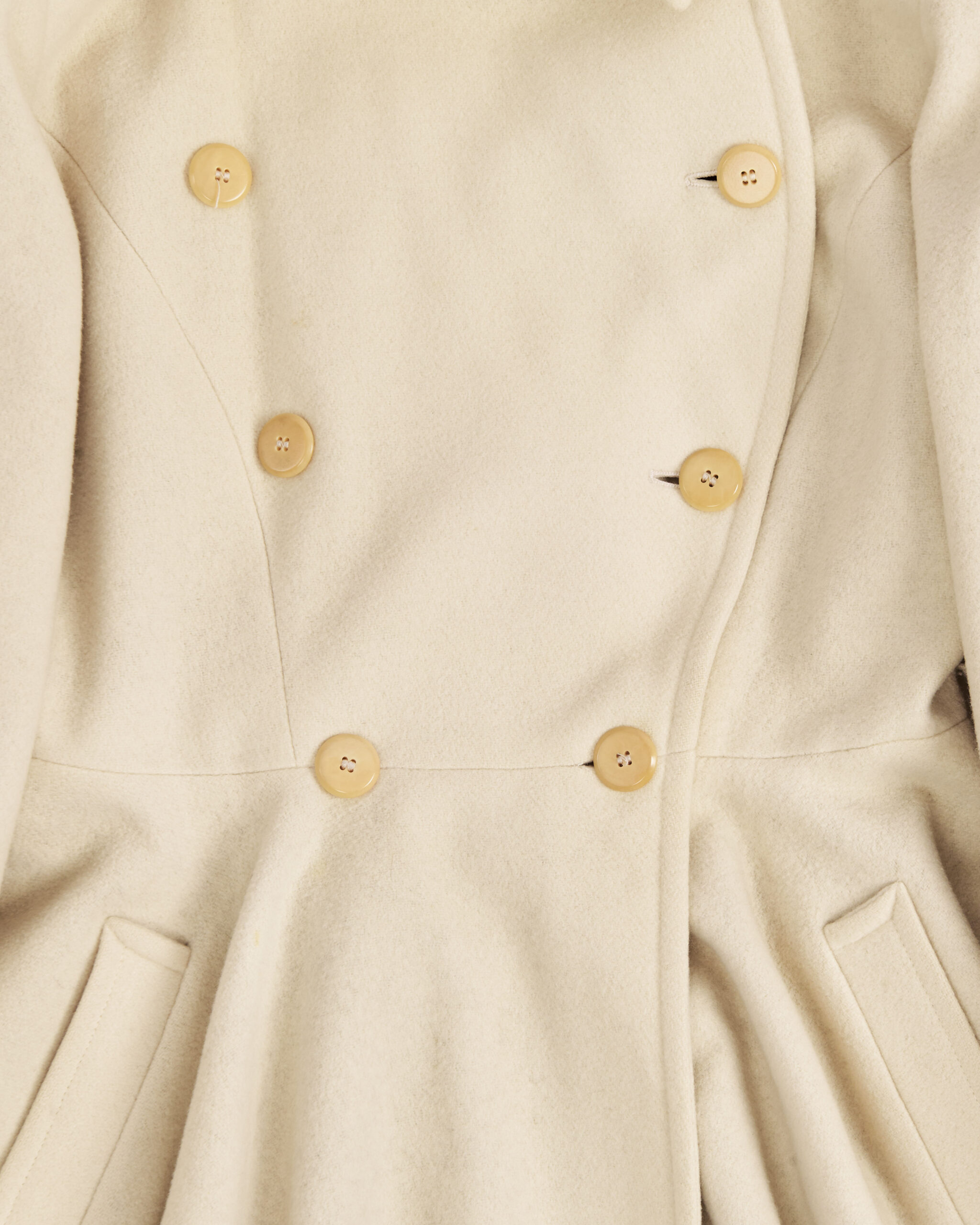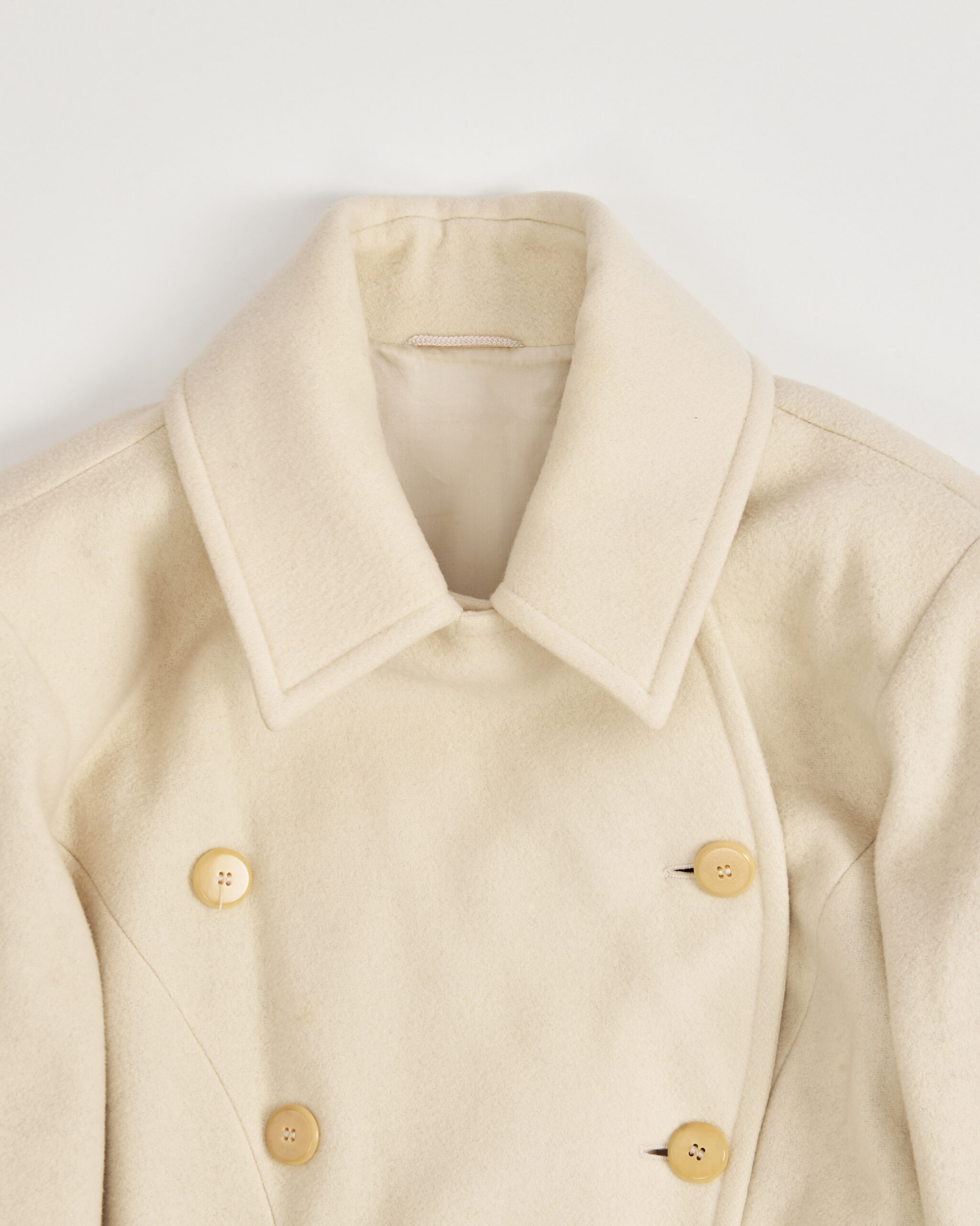 Пальто Sportmax из 100% шерсти в светло-кремовом оттенке. Материал мягкий и ровный на ощупь, с деликатным ворсом и приятной плотностью. Приталенный крой формирует чёткую линию силуэта, расклешённая юбка создаёт плавное движение при ходьбе. Двубортная застёжка и аккуратные карманы