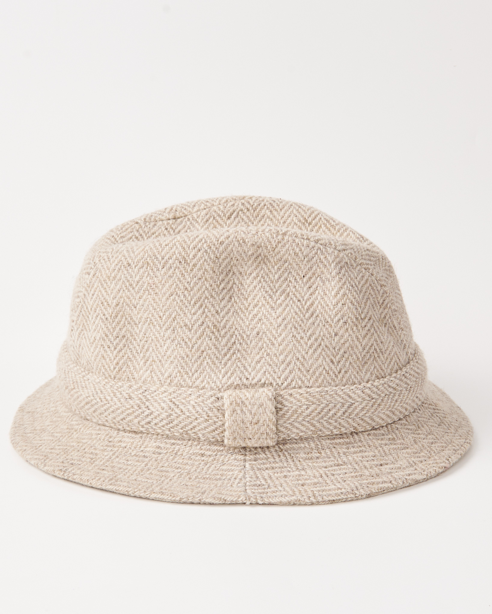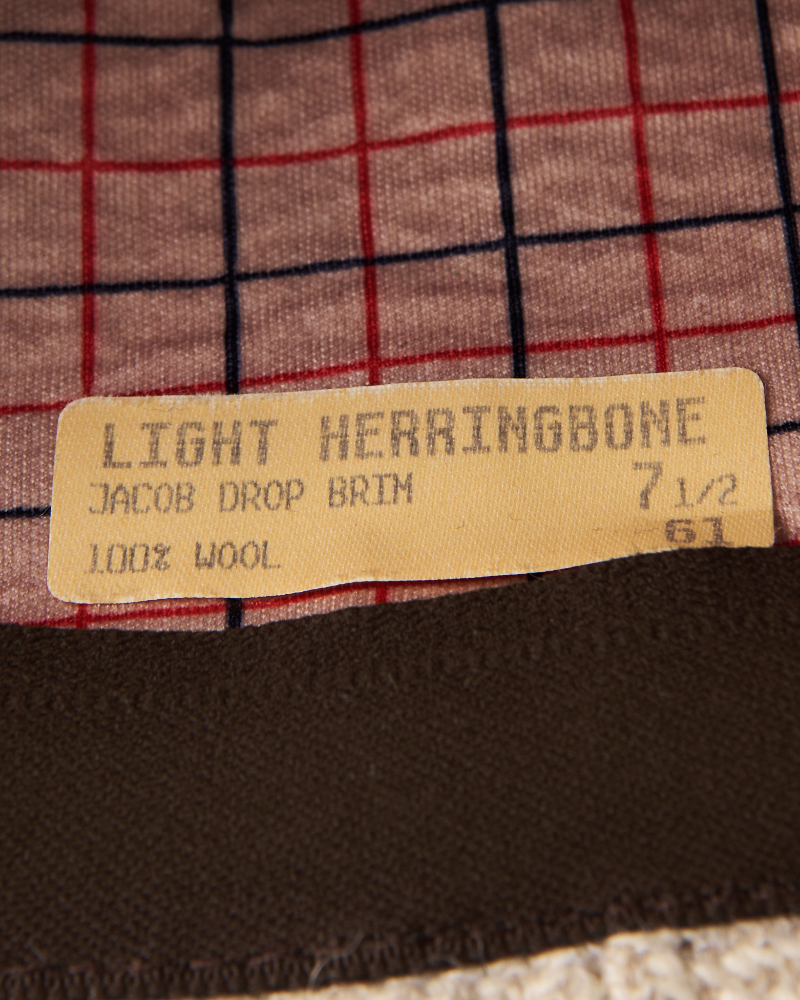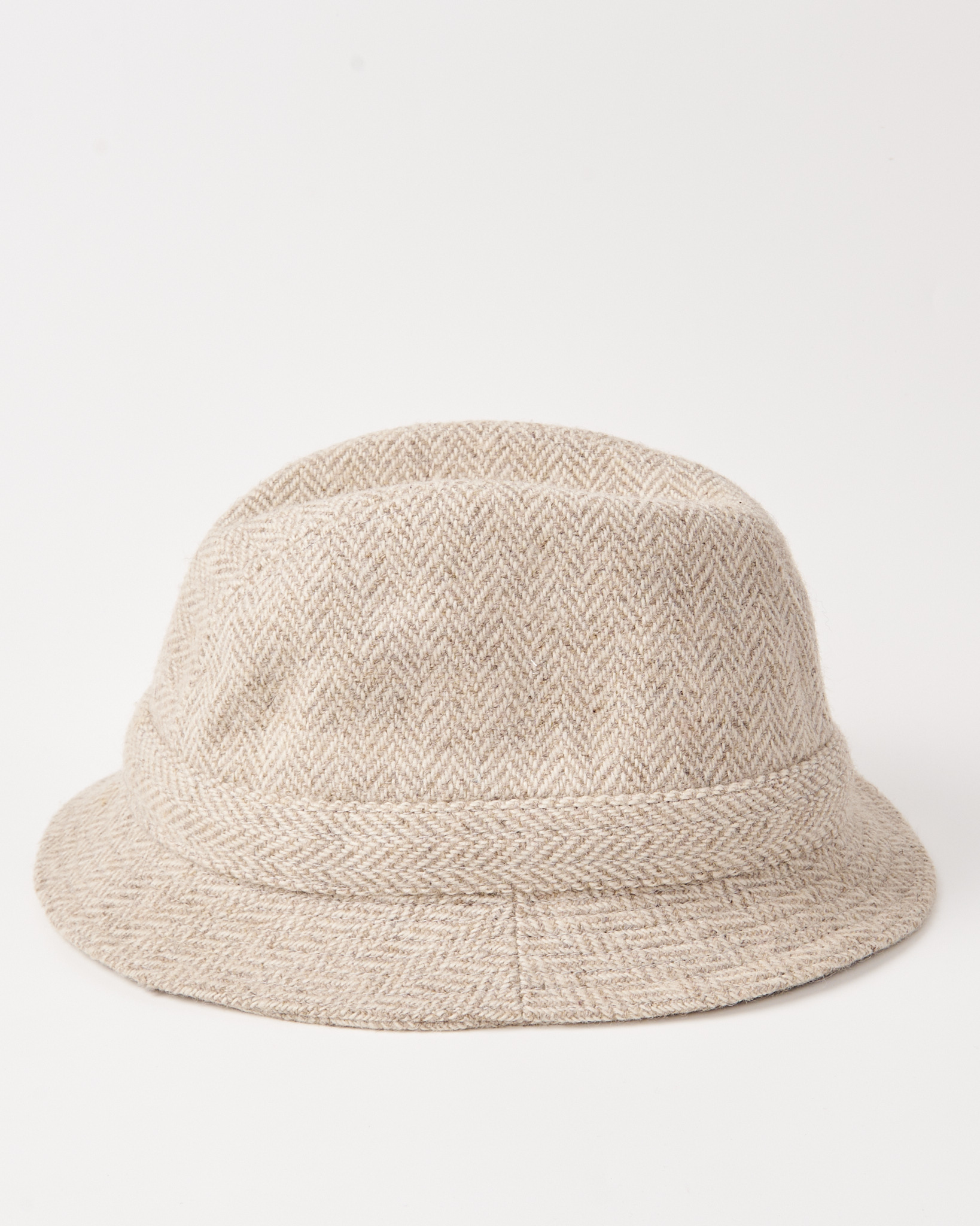 Панама из 100% шерсти светлого оттенка. Материал плотный, с фактурой «ёлочка». Посадка мягкая, форма аккуратно повторяет линию головы и не давит. Внутренняя подкладка в клетку.