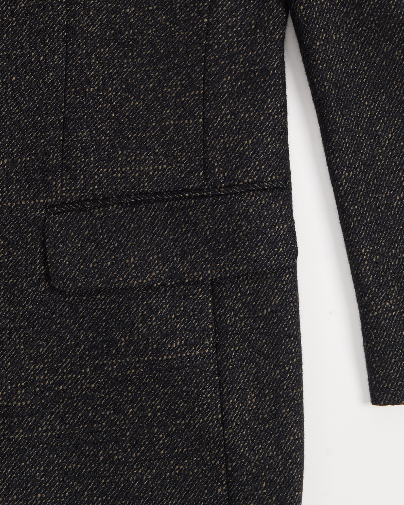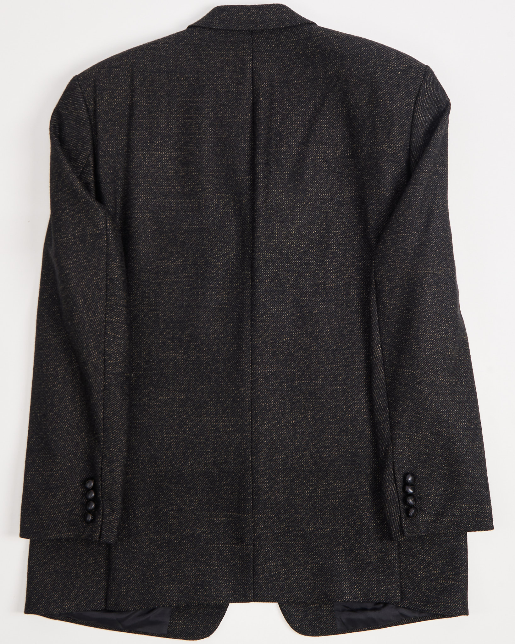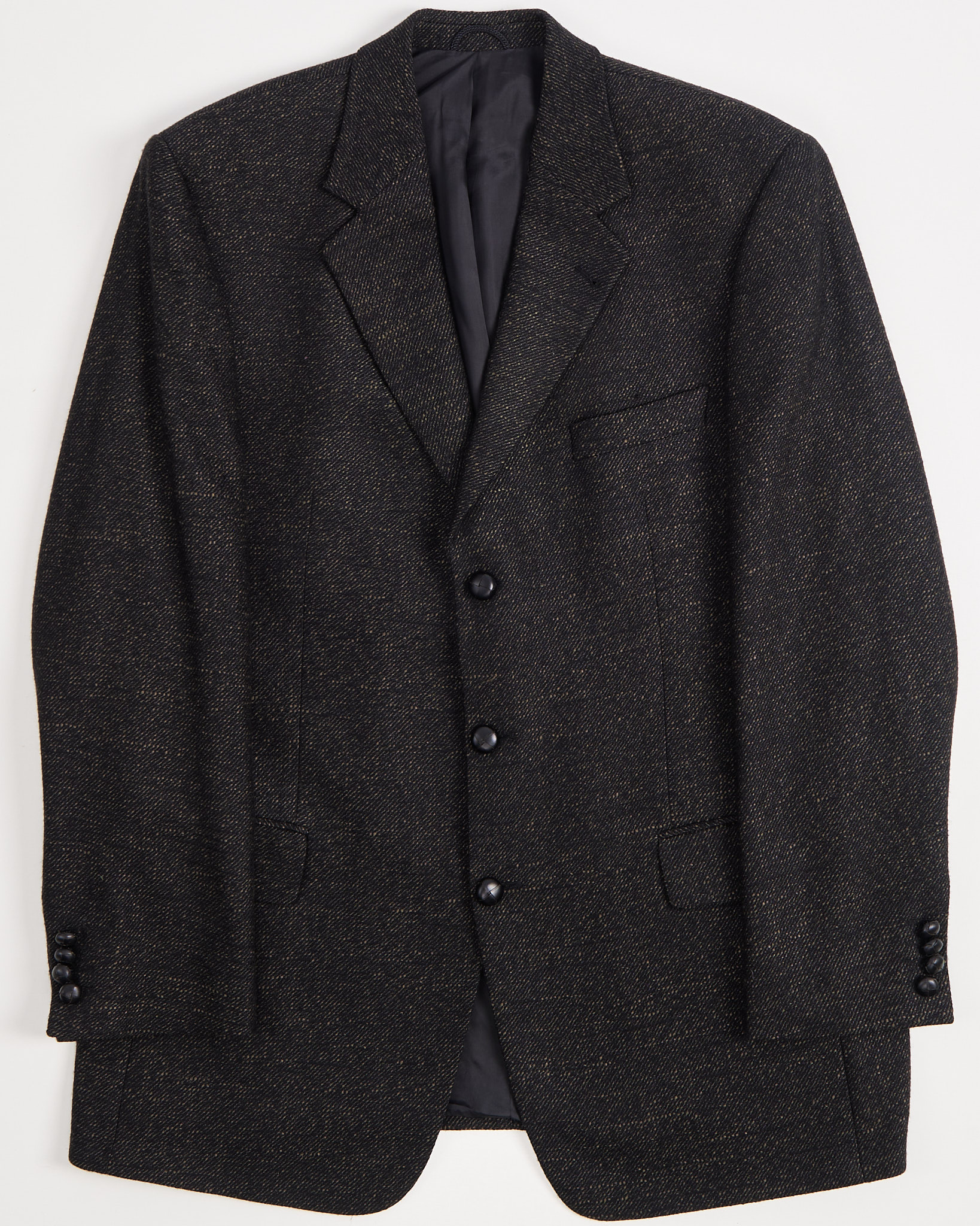 Стильный пиджак итальянского производства от бренда Bottoli (линия бренда Pierre Laffitte) из коллекции Lanificio di Vittorio Veneto. Модель черного цвета с рисунком в точку выполнена из шерстяной ткани премиального качества. Особенности: застежка на три пуговицы, декоративные пуговицы в стиле футбольных мячей, три внешних и четыре внутренних кармана, двусторонняя шлица сзади.