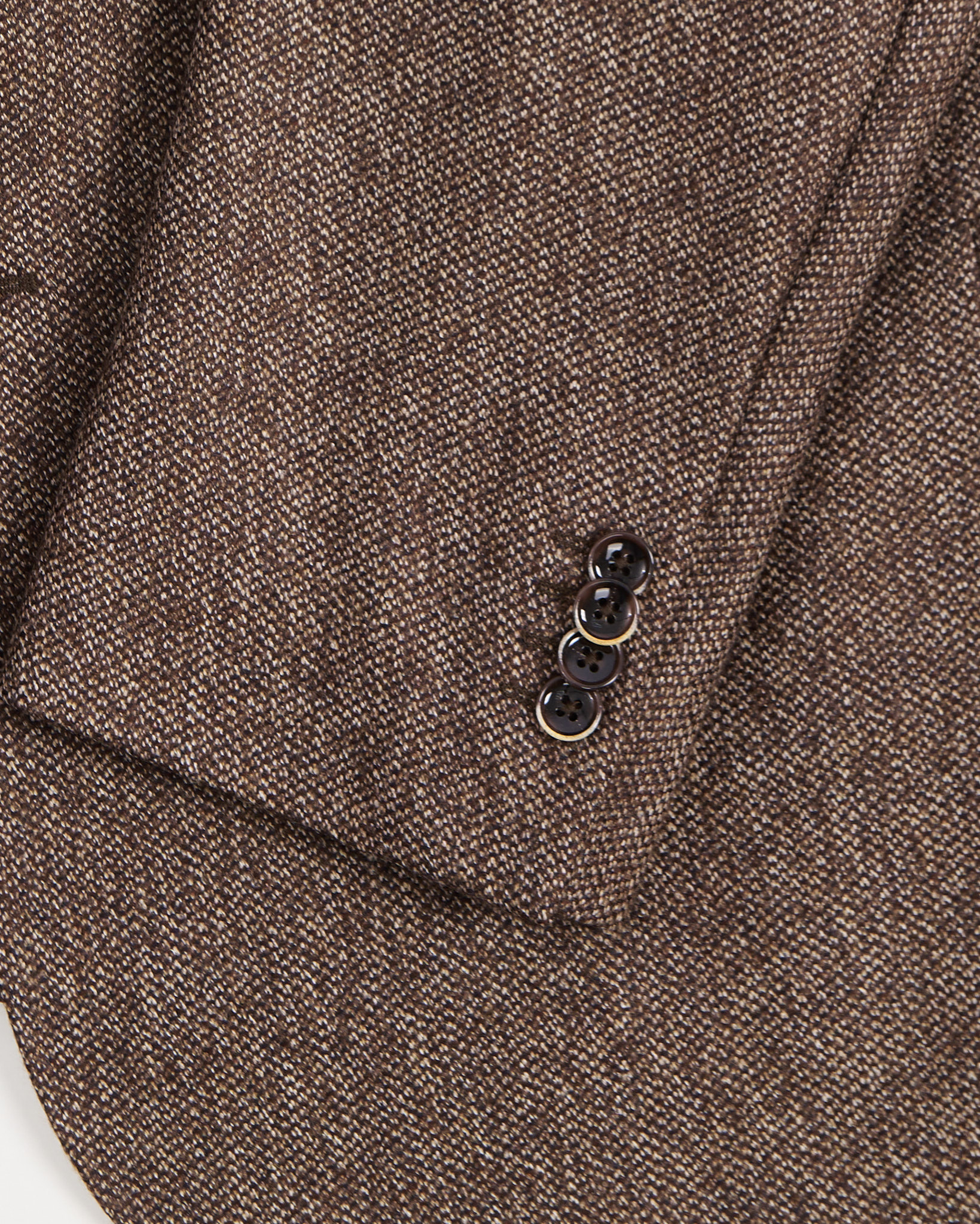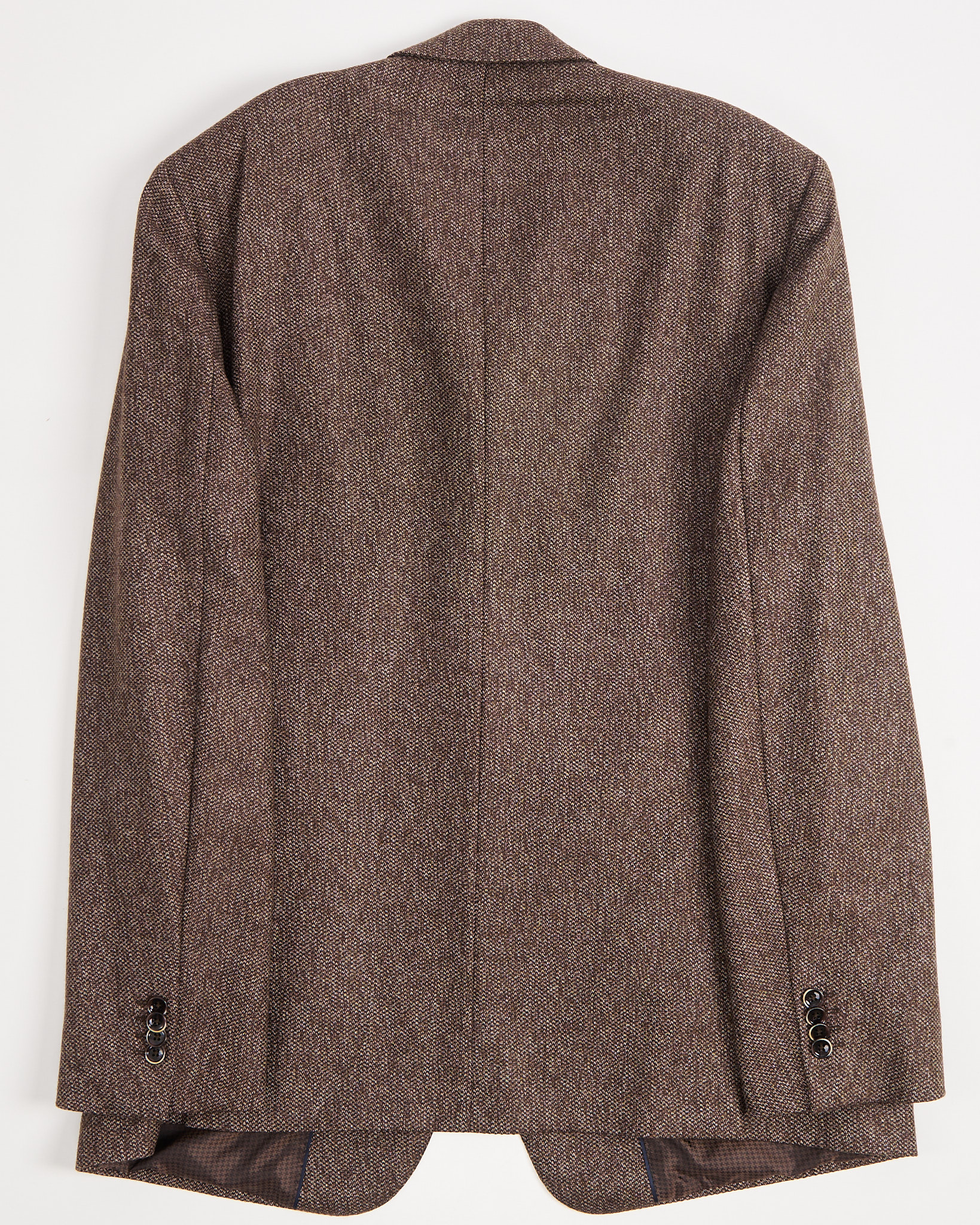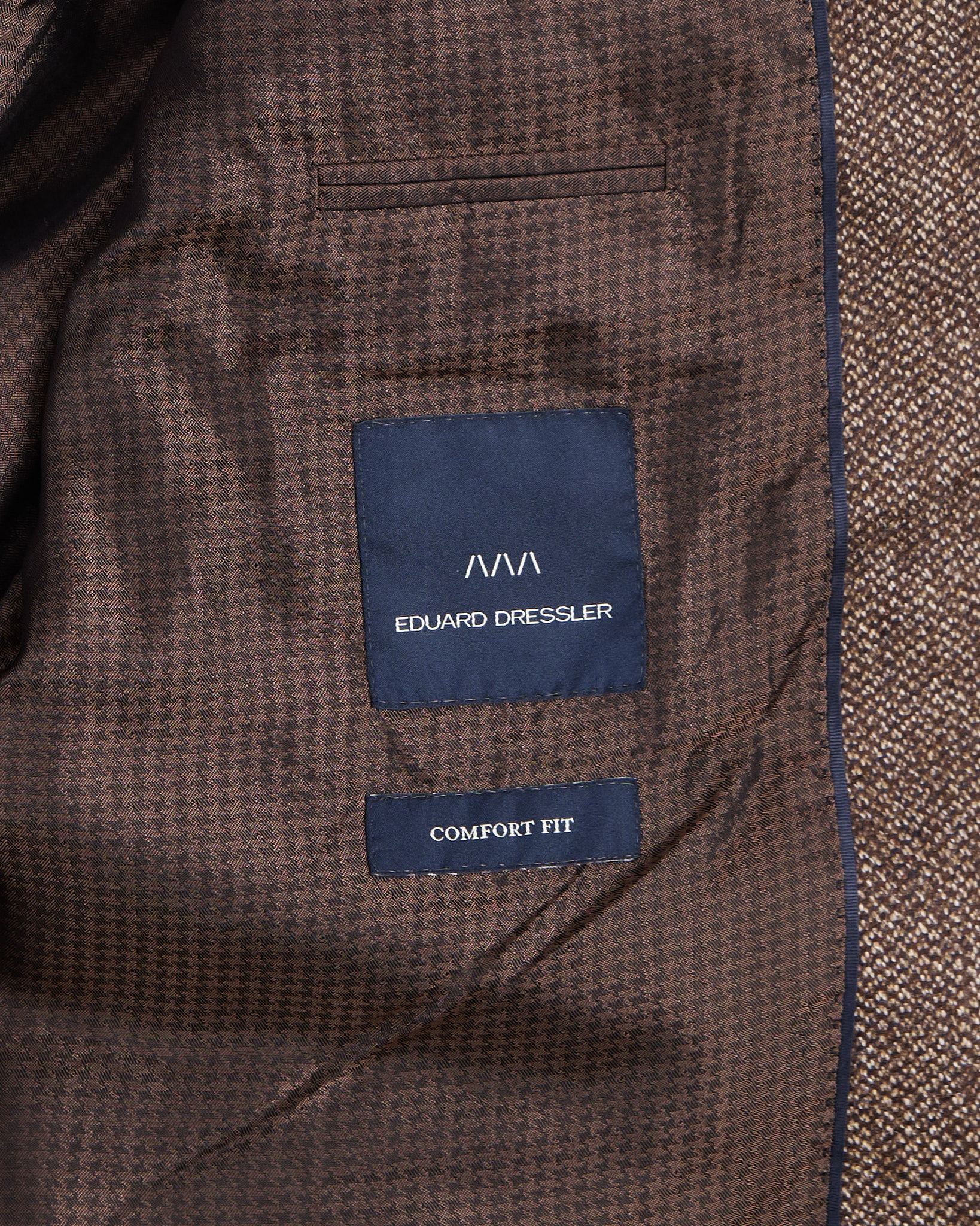 Элегантный пиджак с мужского плеча от немецкого бренда Eduard Dressler из тонкой чистой шерсти (100% wool). Модель цвета кофе с молоком с подкладкой из качественного купро (разновидность вискозы). Классический крой с застежкой на две пуговицы, тремя карманами, подплечниками и двусторонней шлицей сзади.