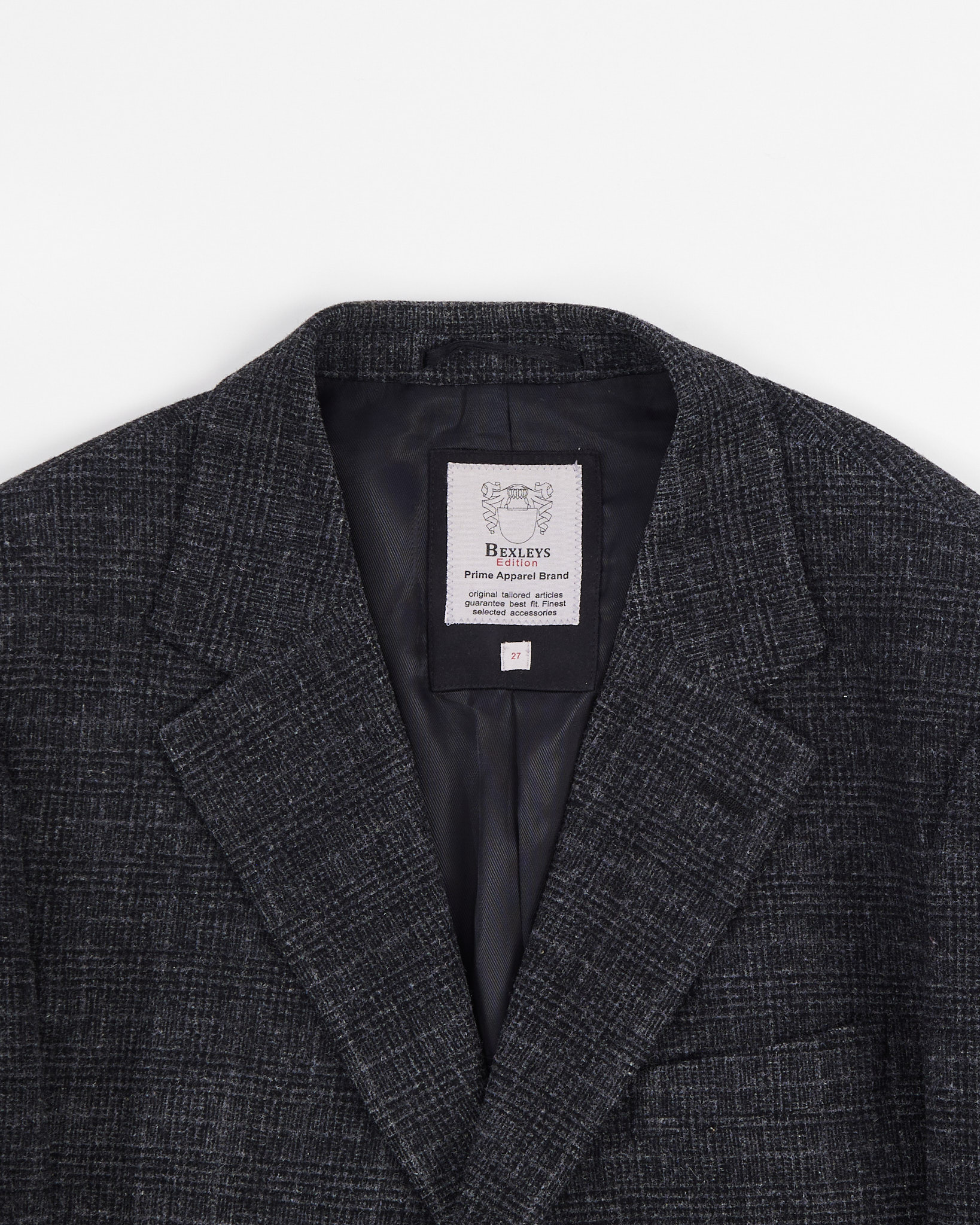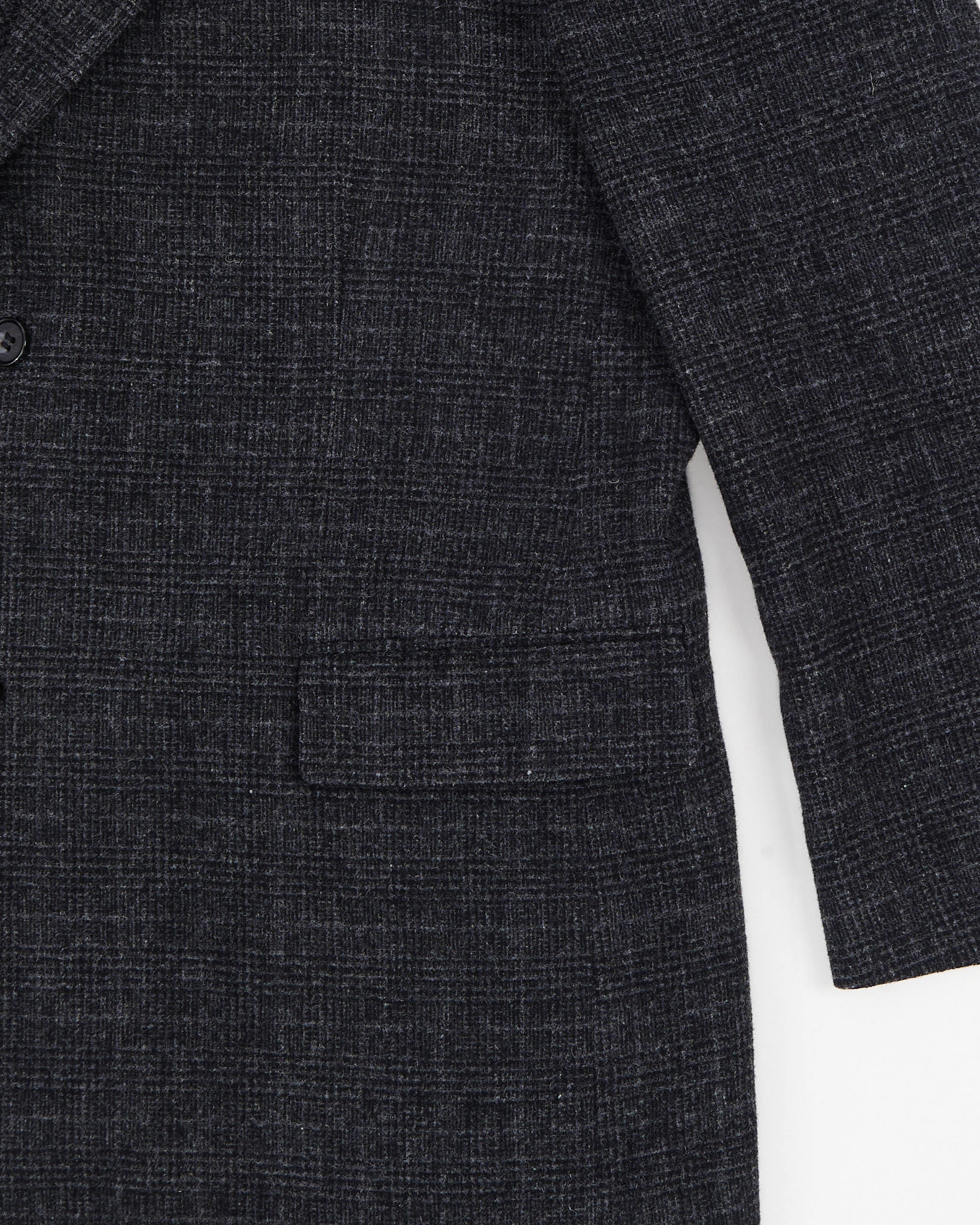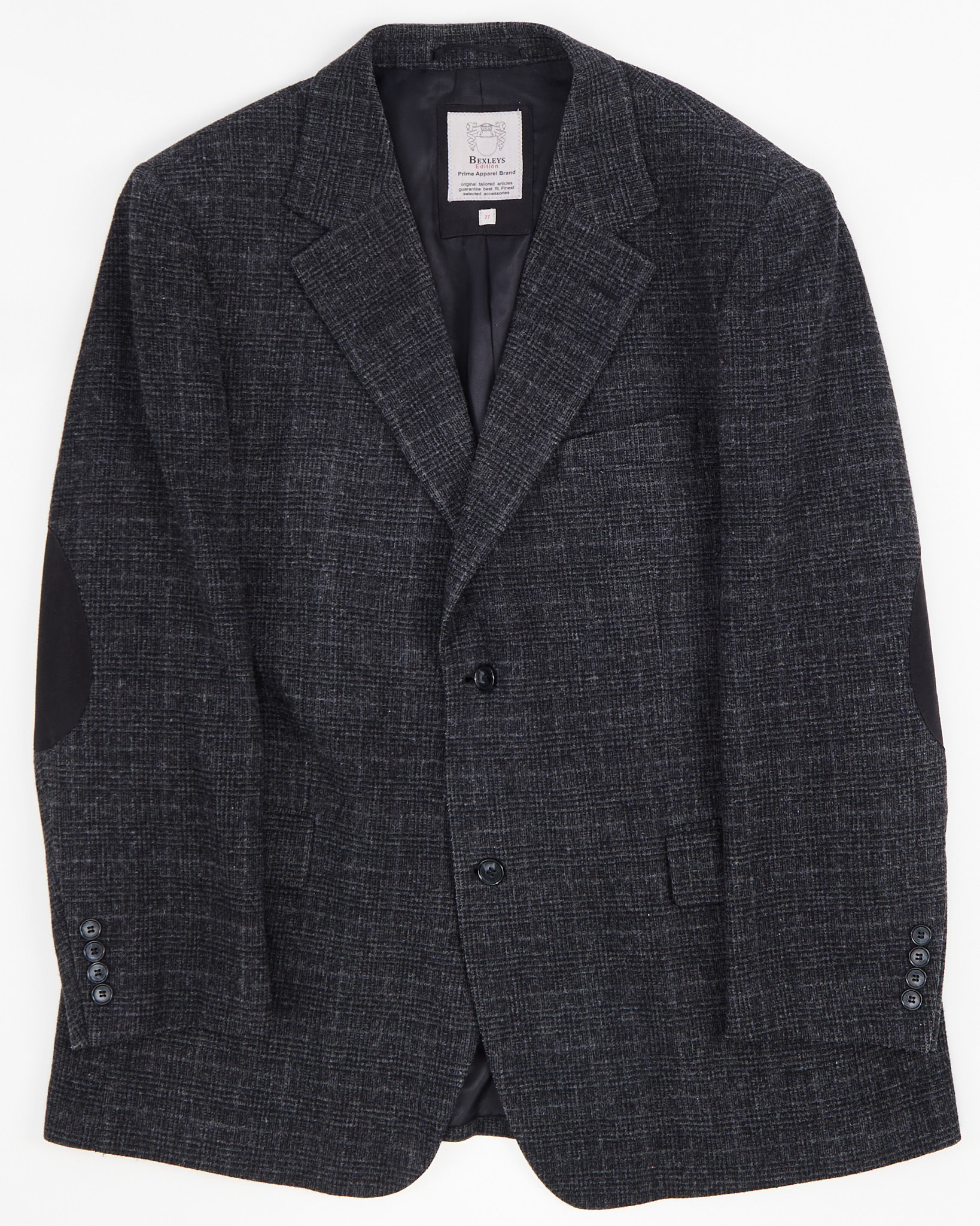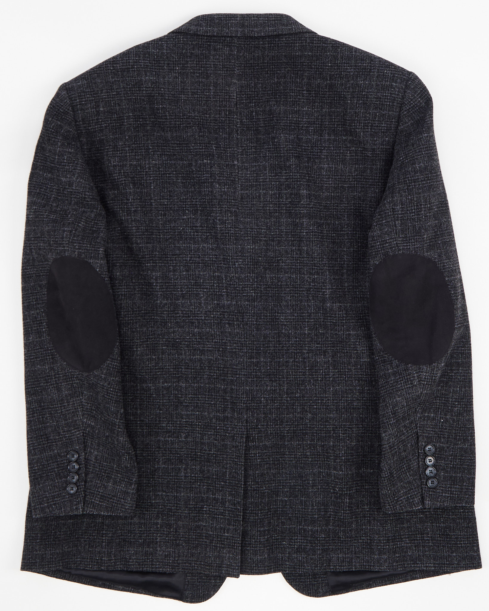 Темный графитовый цвет, узор в мелкую клетку. Классический крой с двумя пуговицами, карманы с клапанами и накладки на локтях в университетском стиле. Идеален на каждый день!