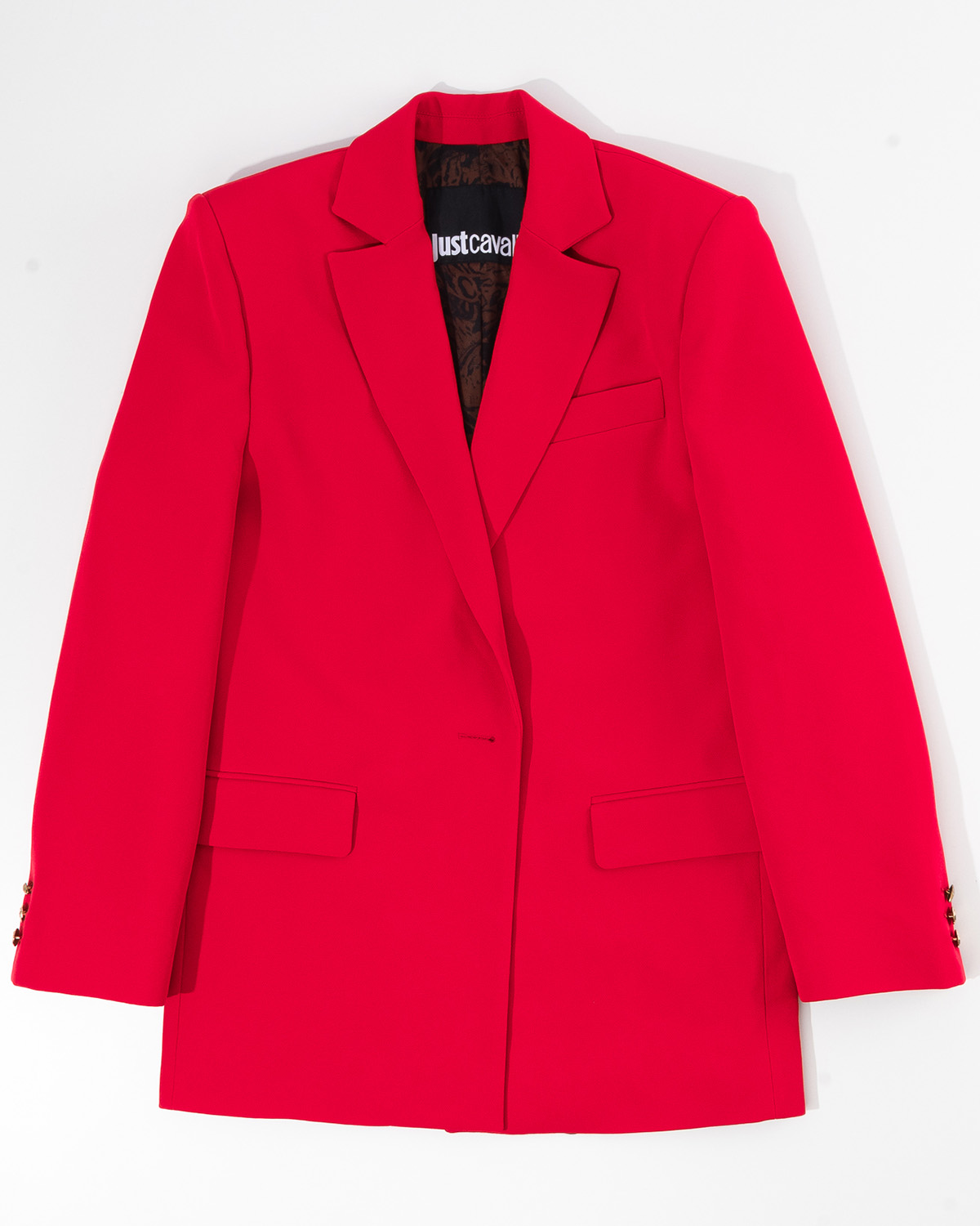 Жакет выделяет насыщенный красный цвет. Ткань плотная, гладкая, тактильно приятная. Посадка прямая, со структурированной линией плеч и четким силуэтом. Сделан в Италии