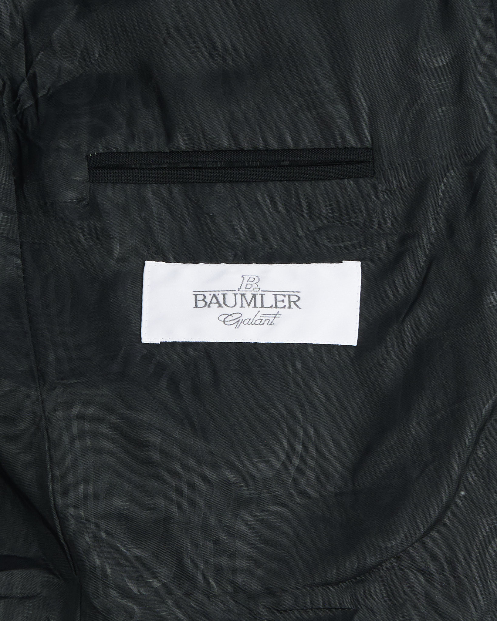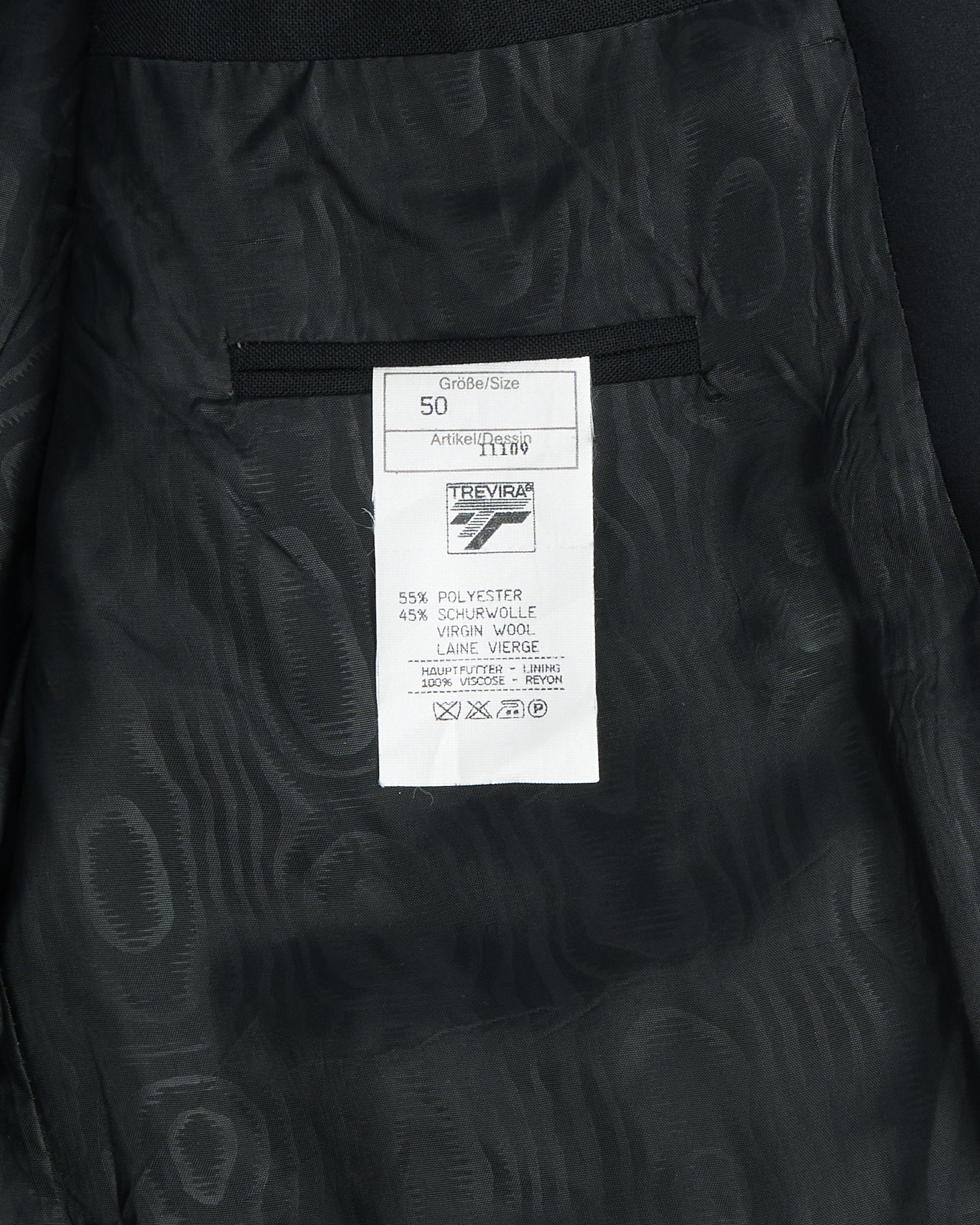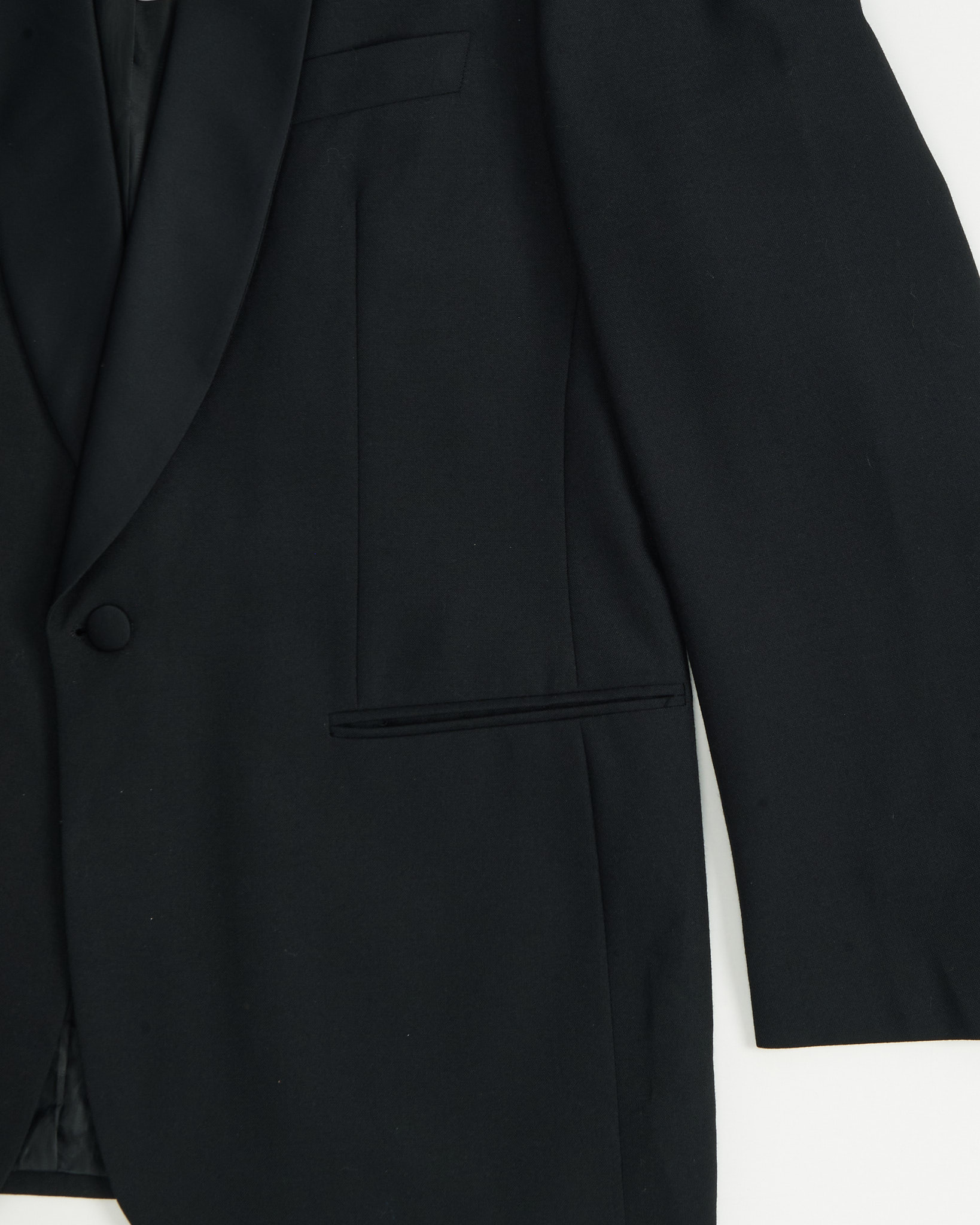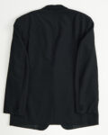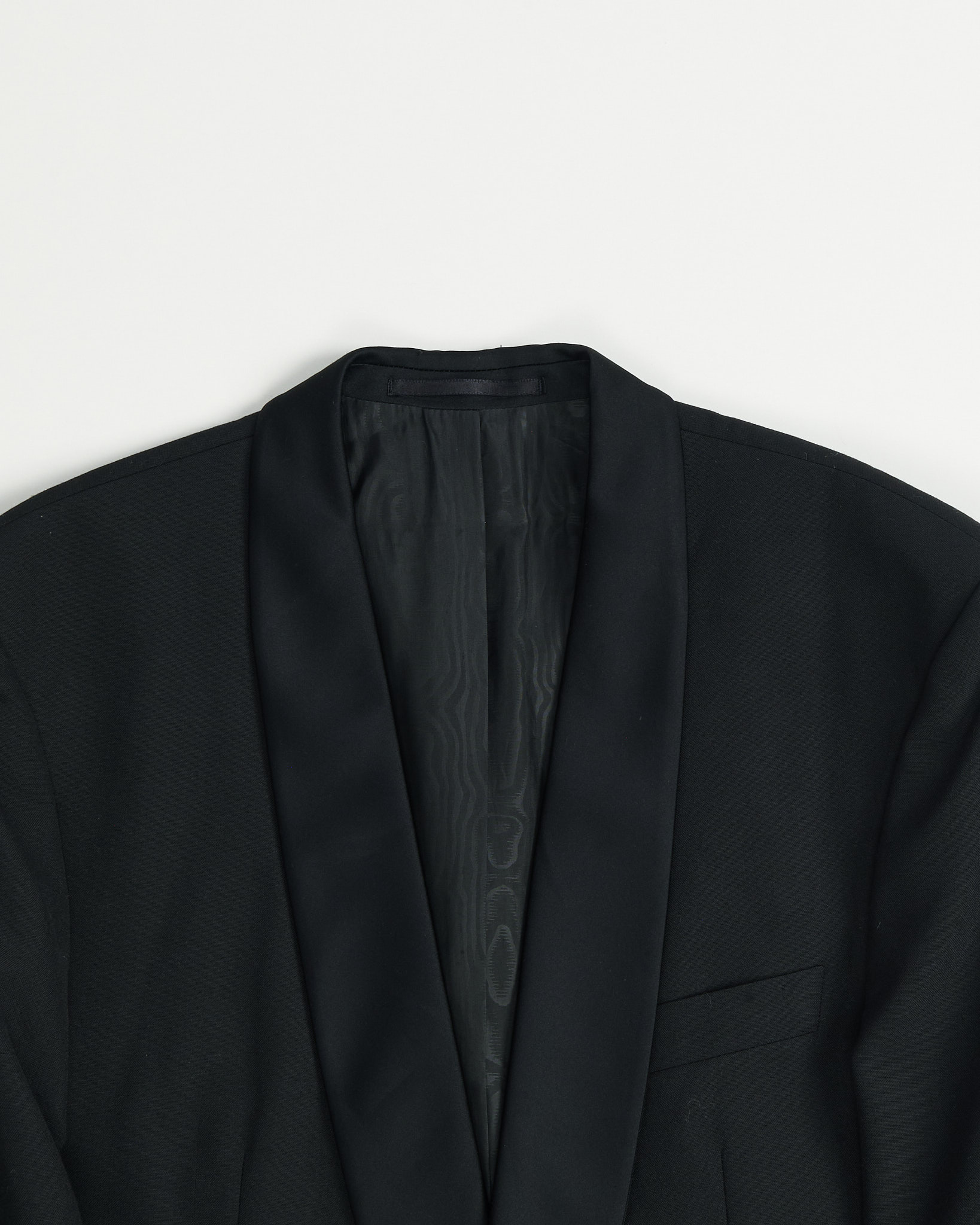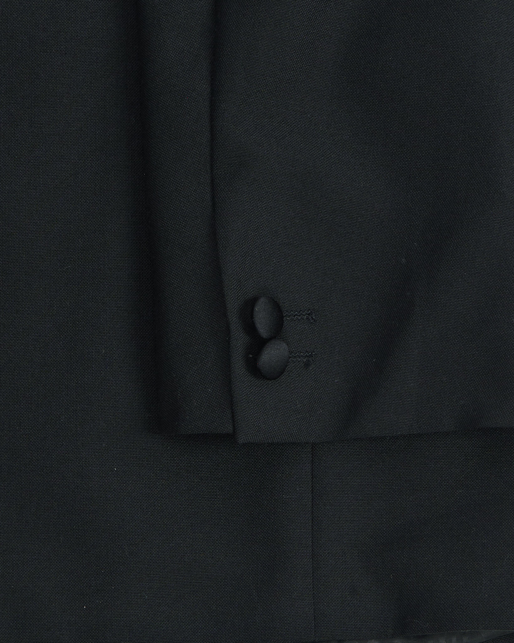Классический смокинговый пиджак с атласными лацканами. Посадка ближе к прямой, с акцентом на линию плеч и чистую вертикаль передней части. Атласные детали и обтянутые пуговицы придают акцент.