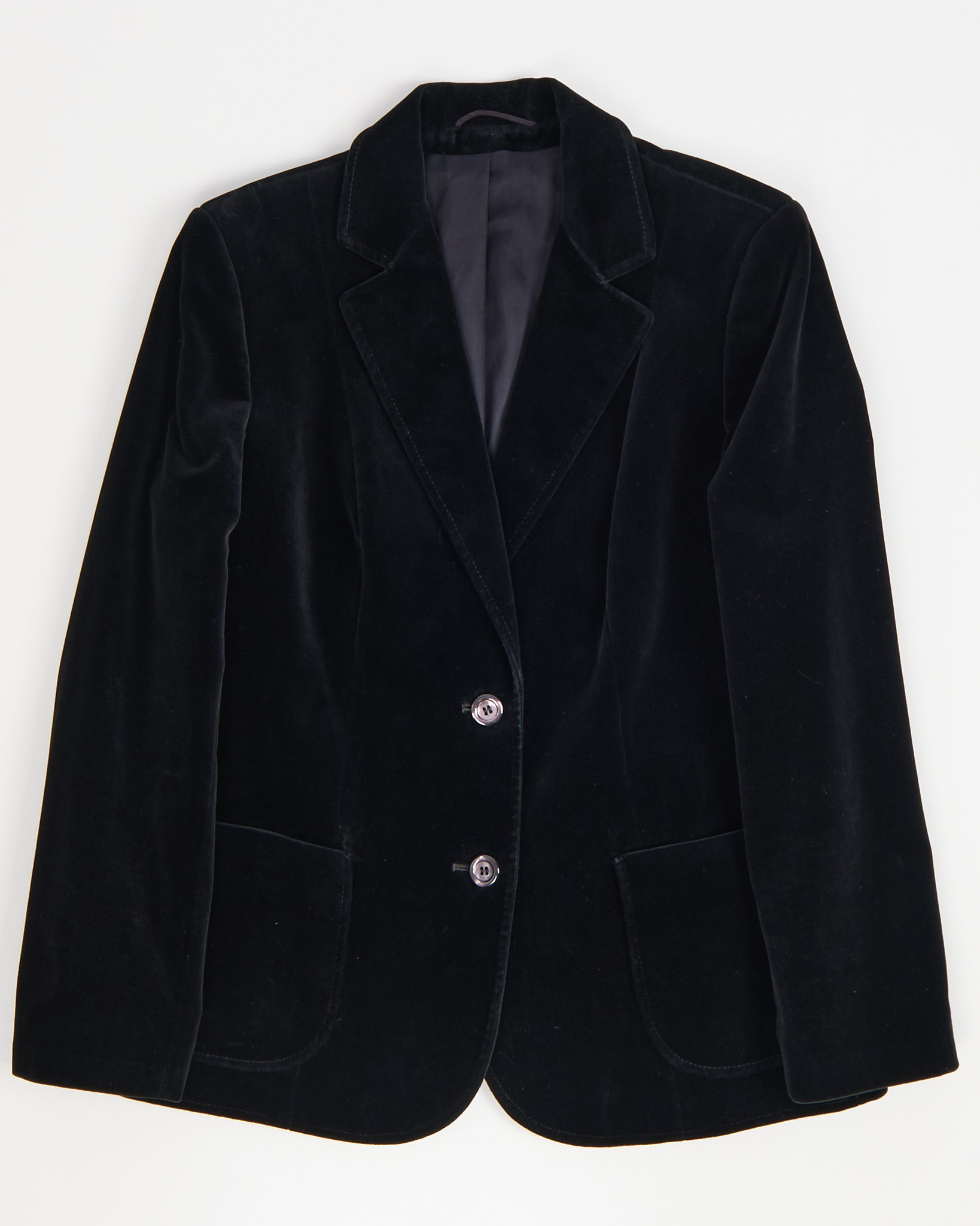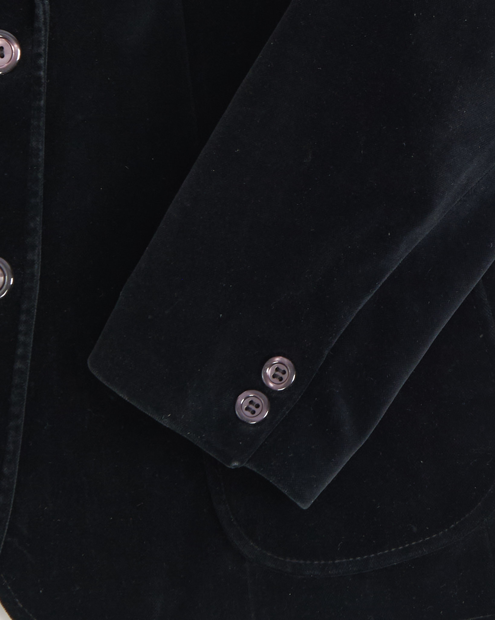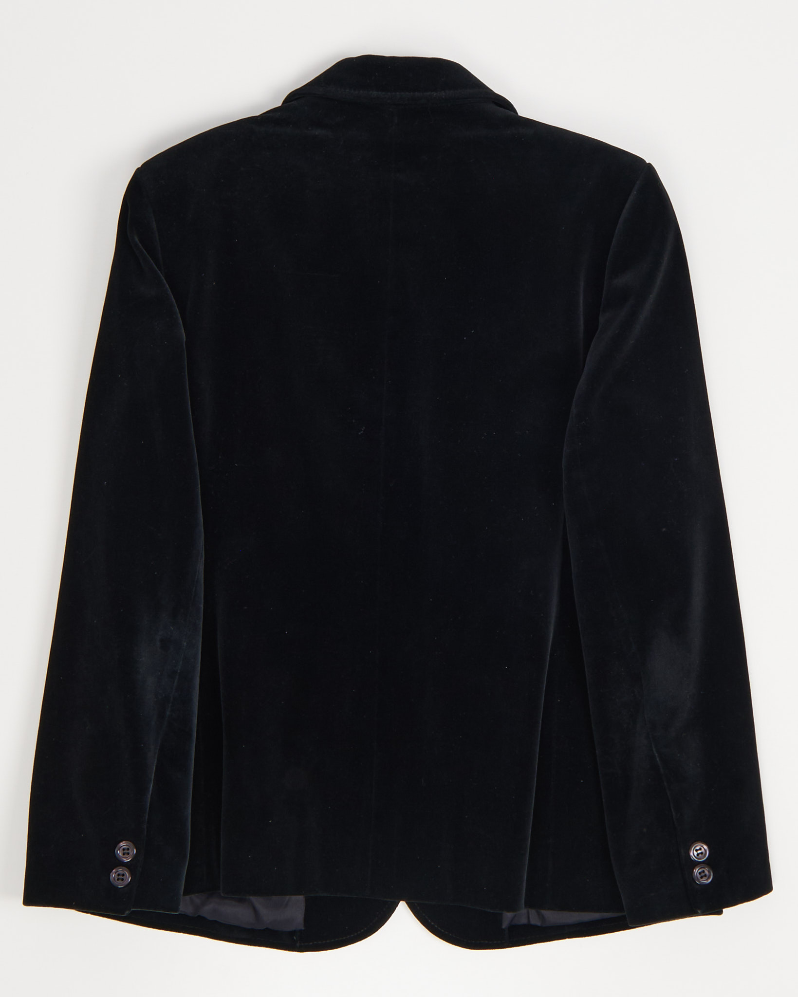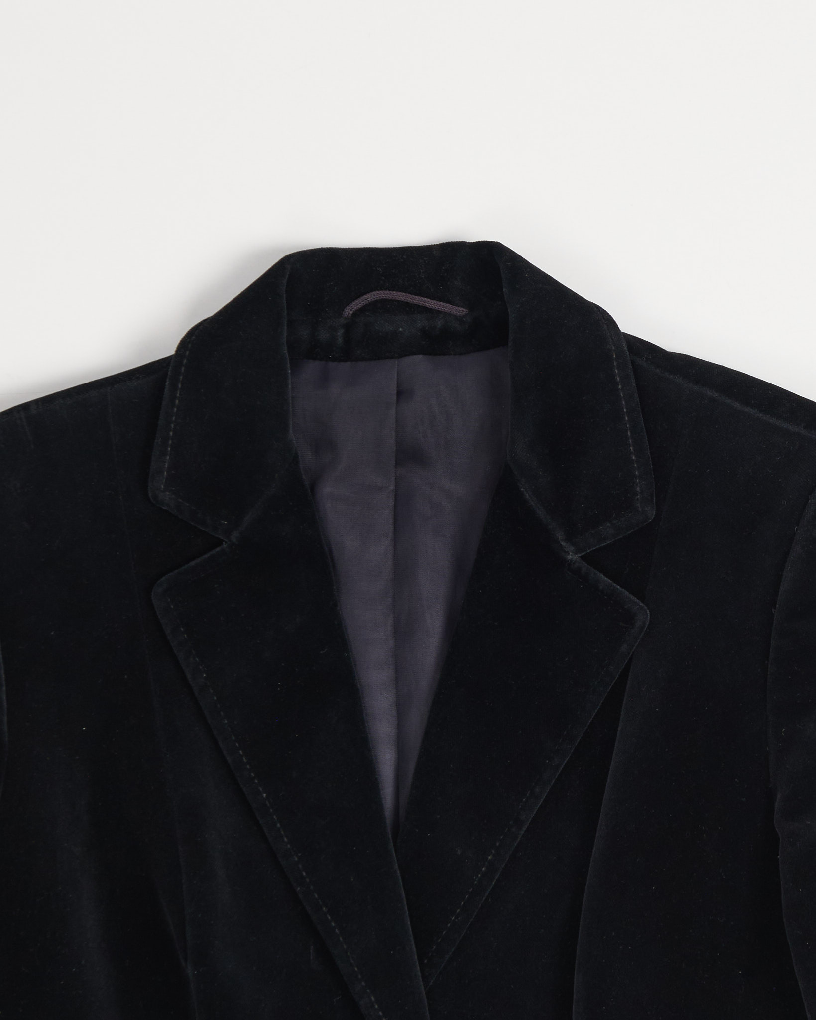 Жакет из мягкого бархата. Прямой крой с легким акцентом на плечах. Классический отложной воротник и застежка на две пуговицы. Накладные карманы.