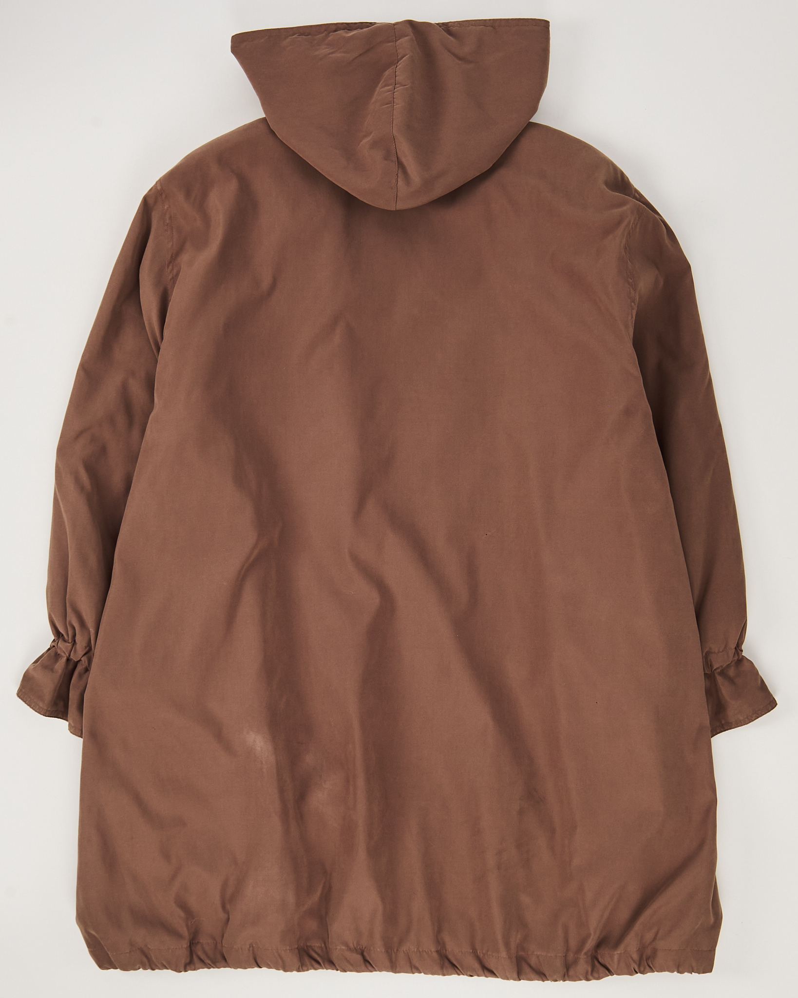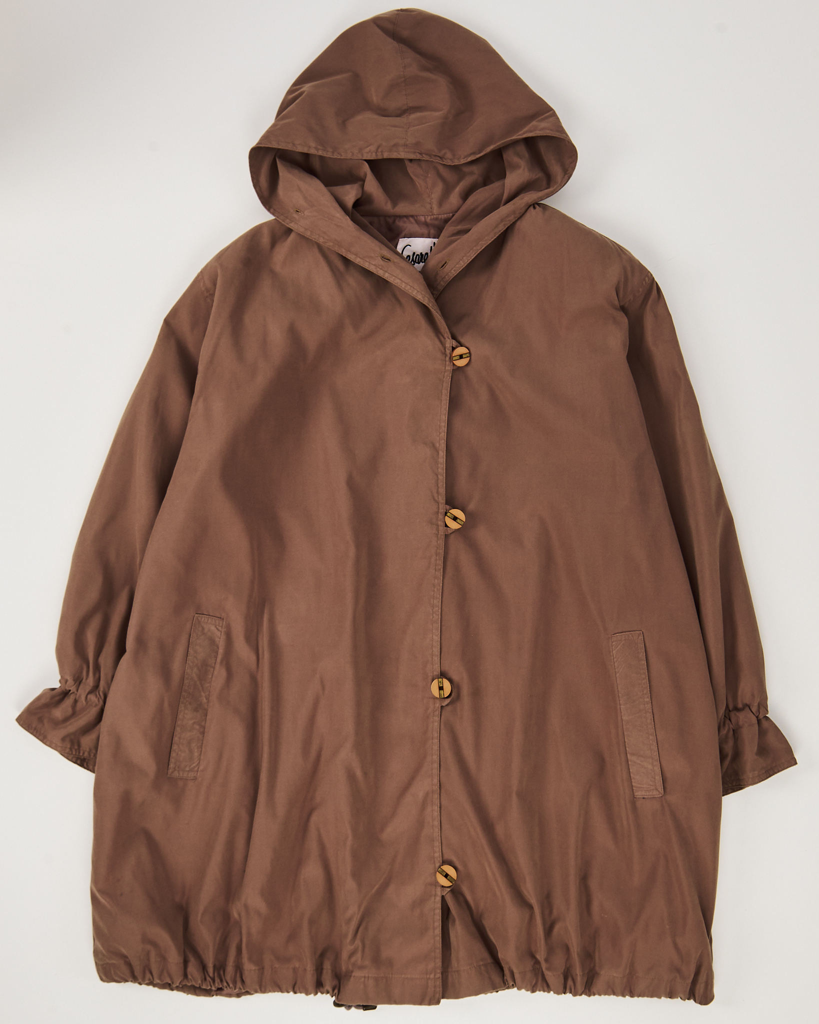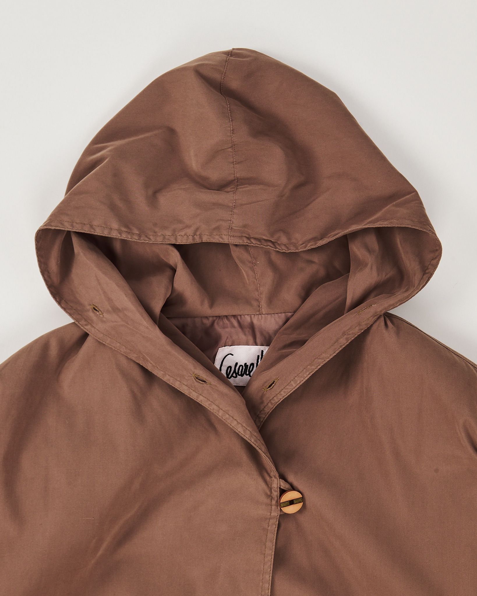 Плащ Cesare Visauto коричневого цвета. Материал гладкий, мягкий, с легким матовым эффектом, приятный на ощупь. Прямой силуэт, удобные подплечники, кулиска снизу и сборка на рукавах. Застежка на пуговицы, два боковых функциональных кармана, капюшон.