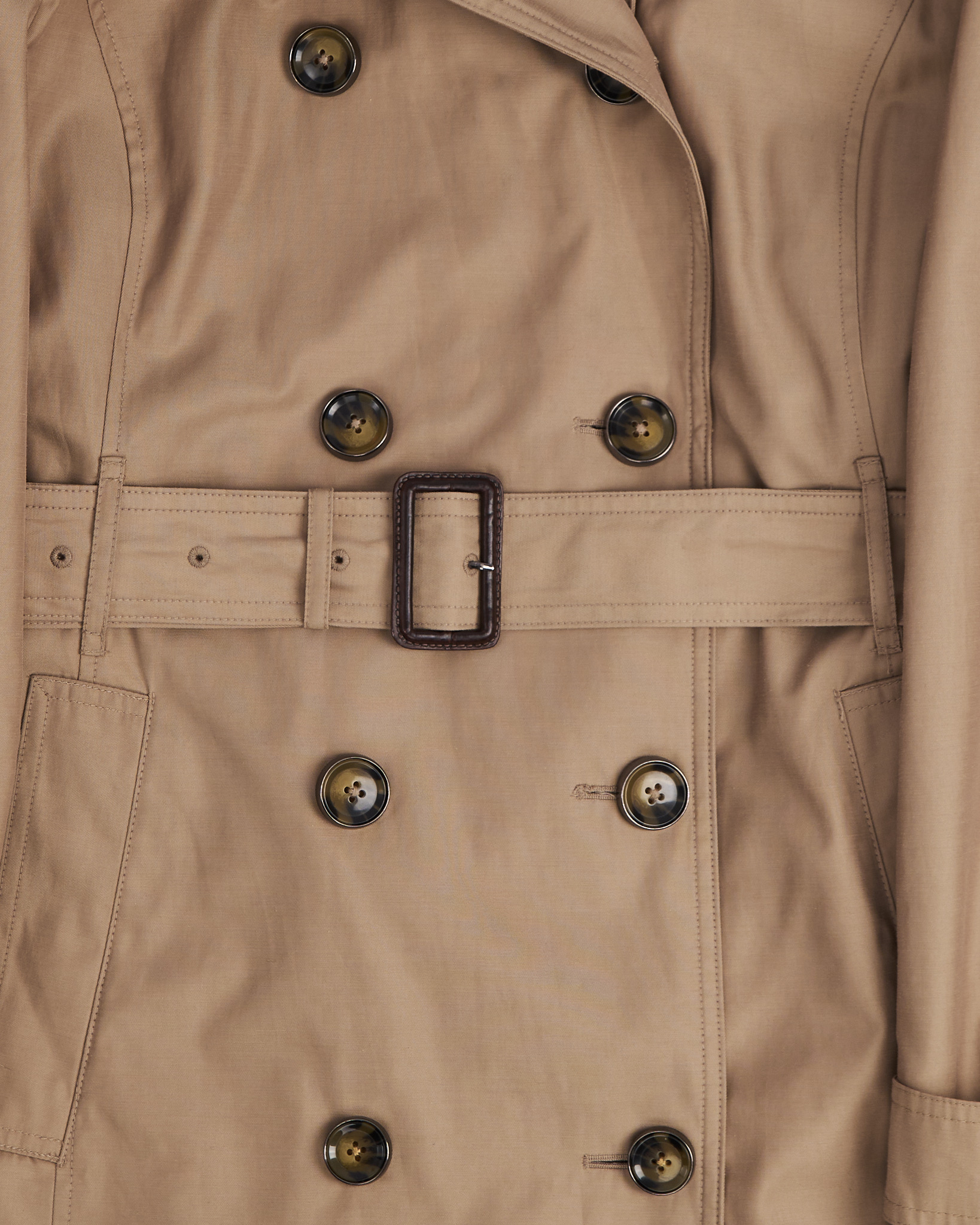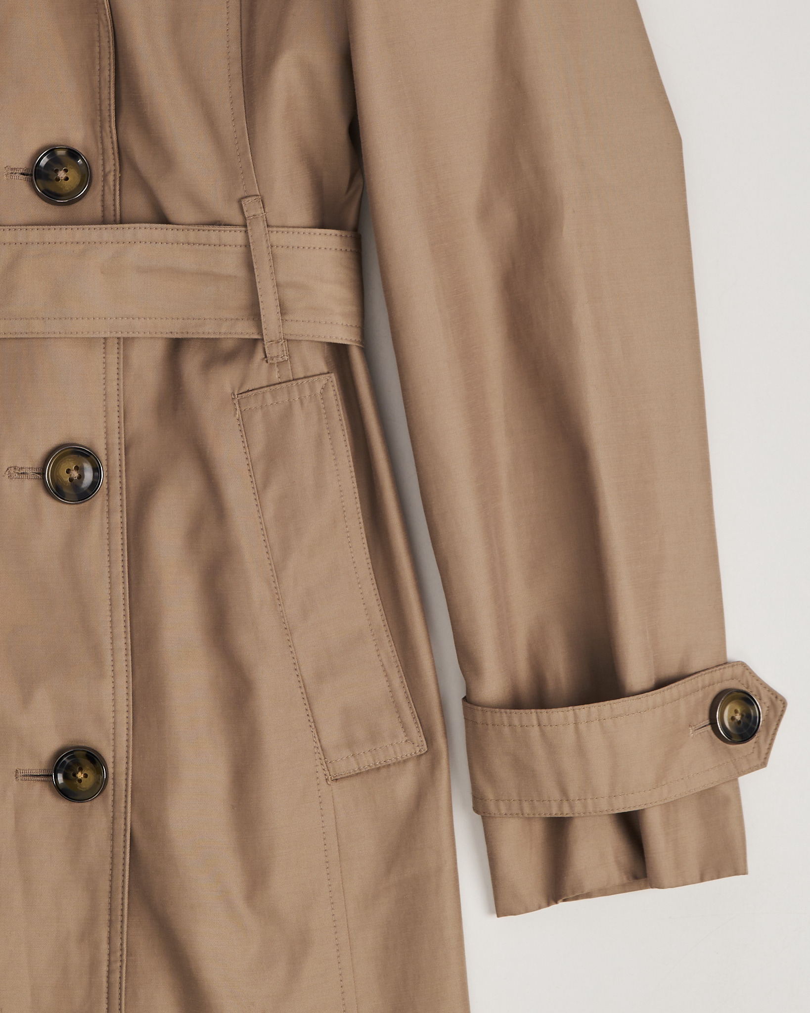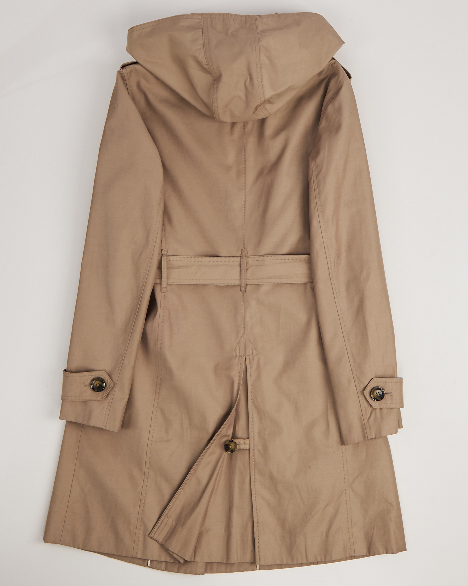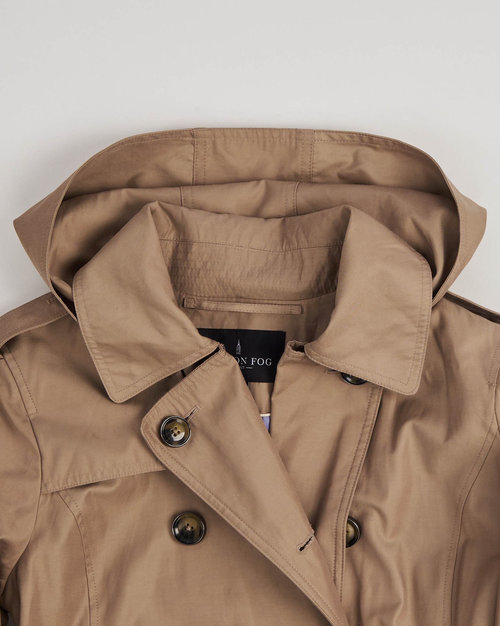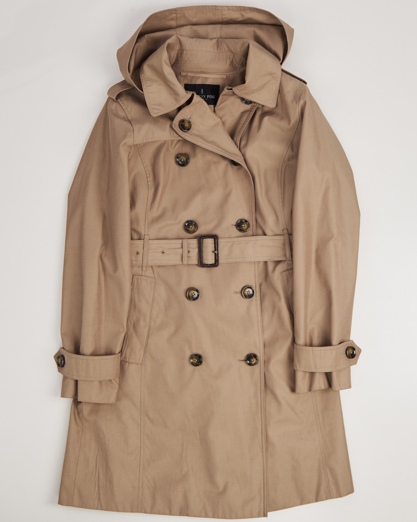 Плащ London Fog бежевого цвета. Приталенная посадка за счет пояса. Двубортная застежка на крупные пуговицы. Воротник с четкой линией. Капюшон скрытый в вороте. Пояс с прямоугольной пряжкой. На рукавах хлястики с пуговицами. Глубокие боковые карманы.