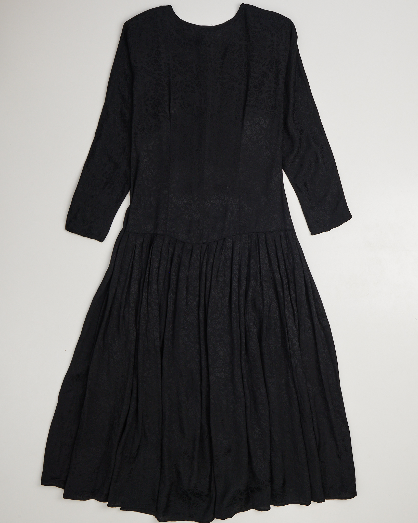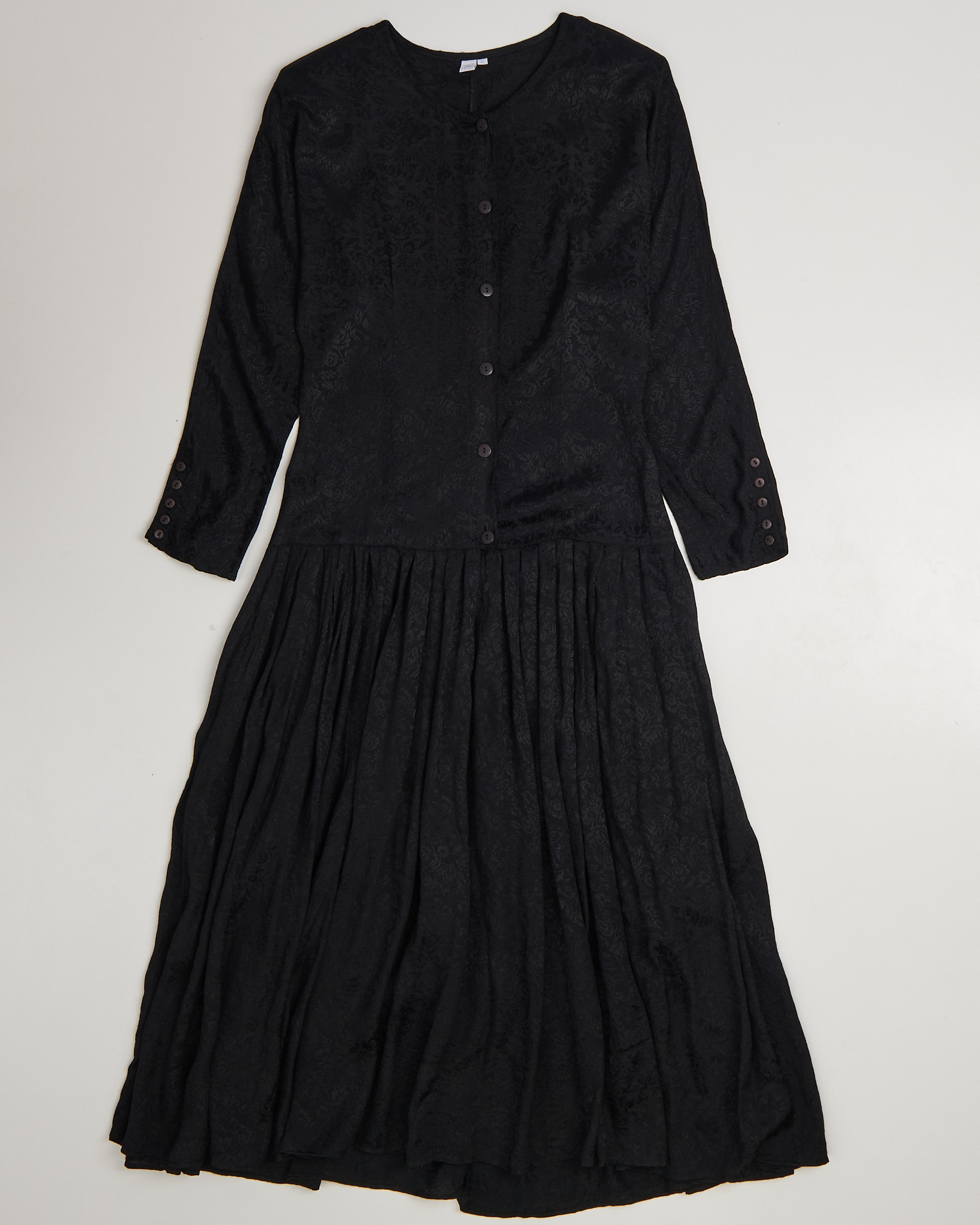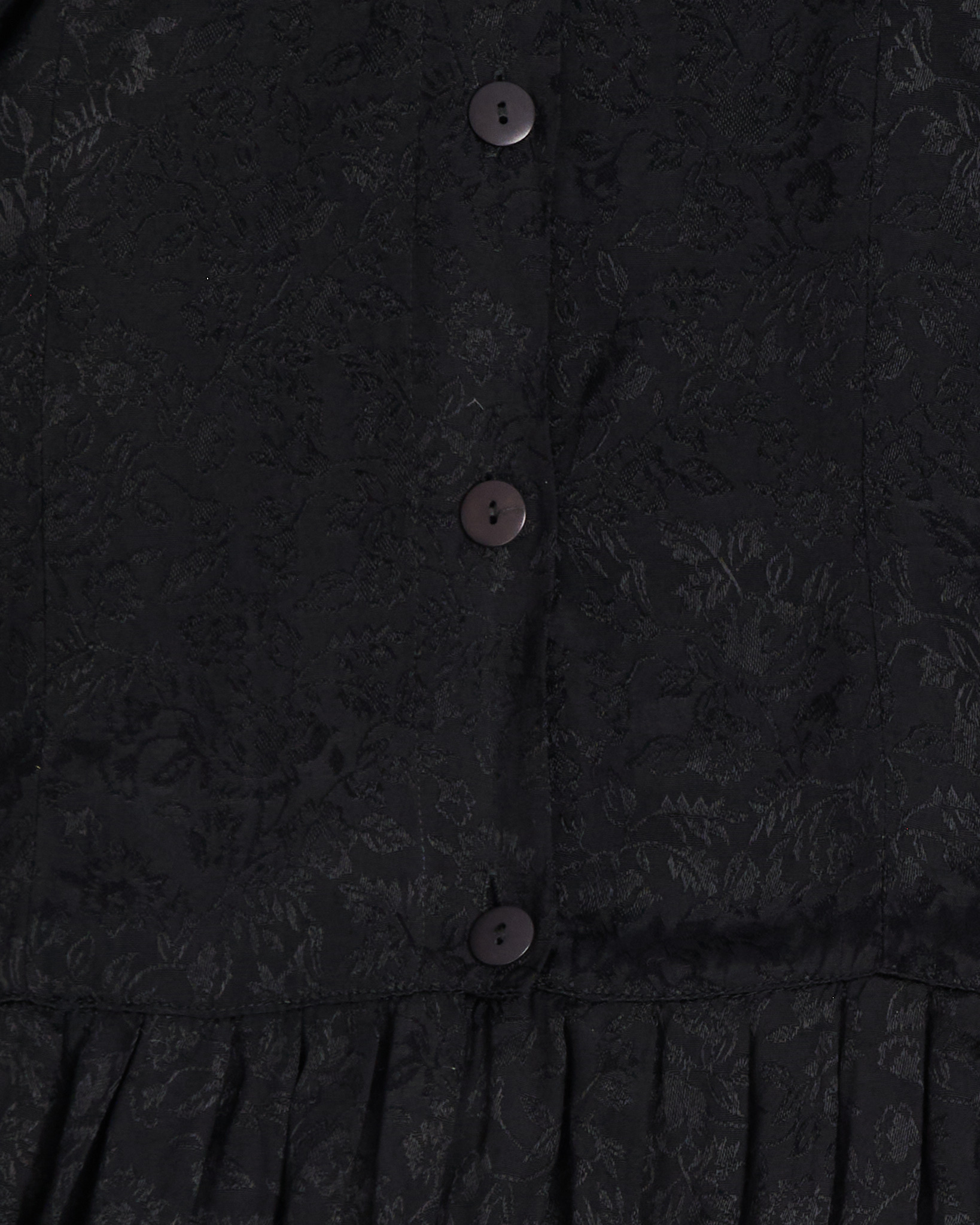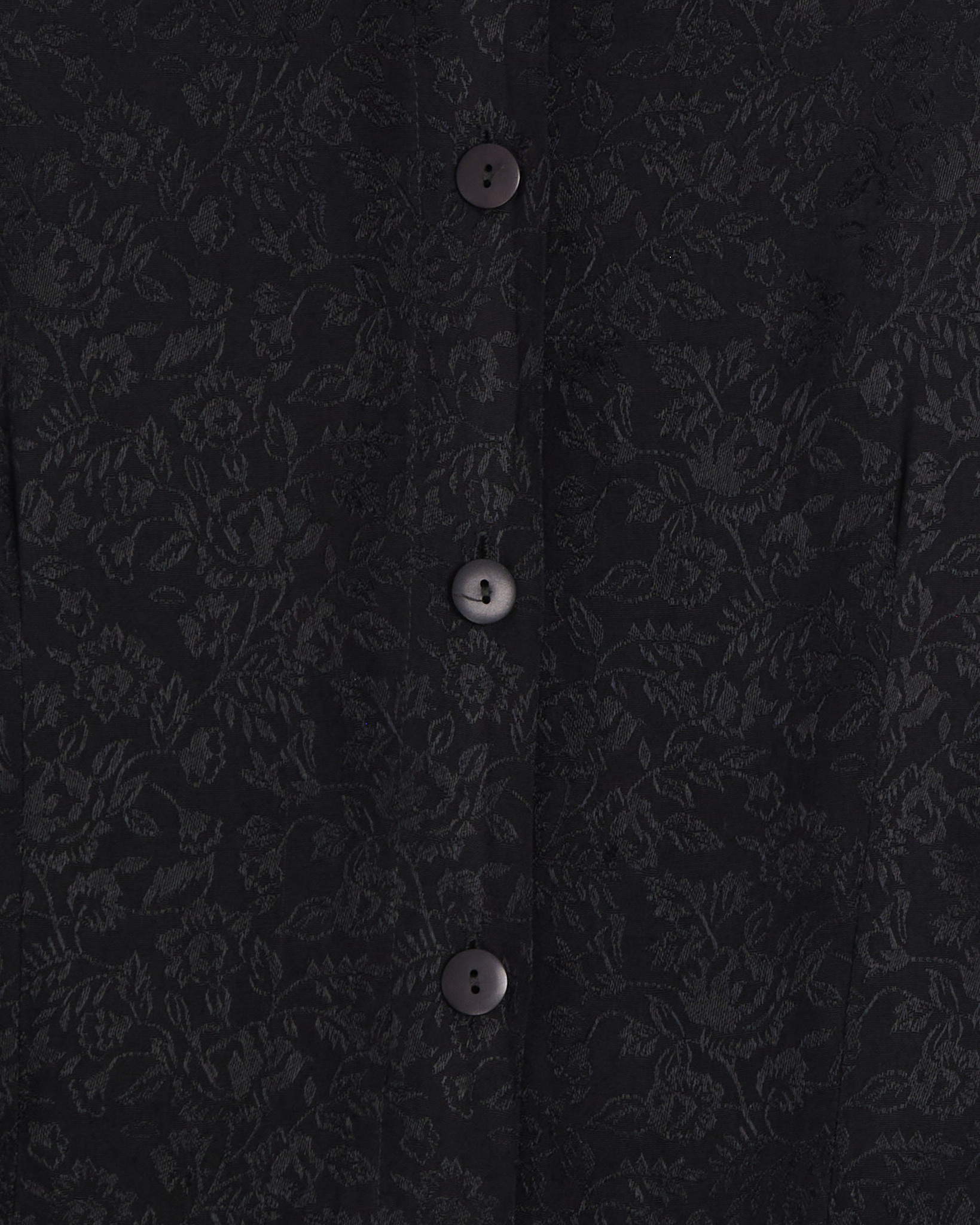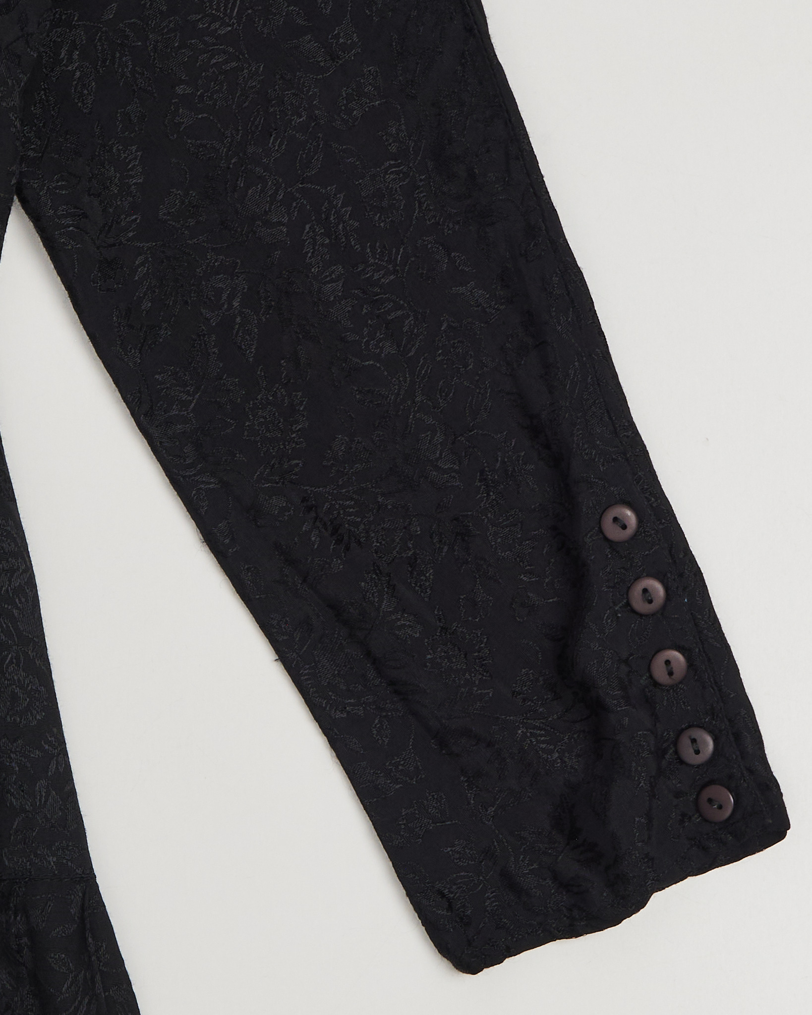 Платье с узором по всей поверхности, полуприталенной посадки с акцентом на линии талии и расширением к низу. Центральная застёжка на пуговицах и аккуратные пуговицы на манжетах.