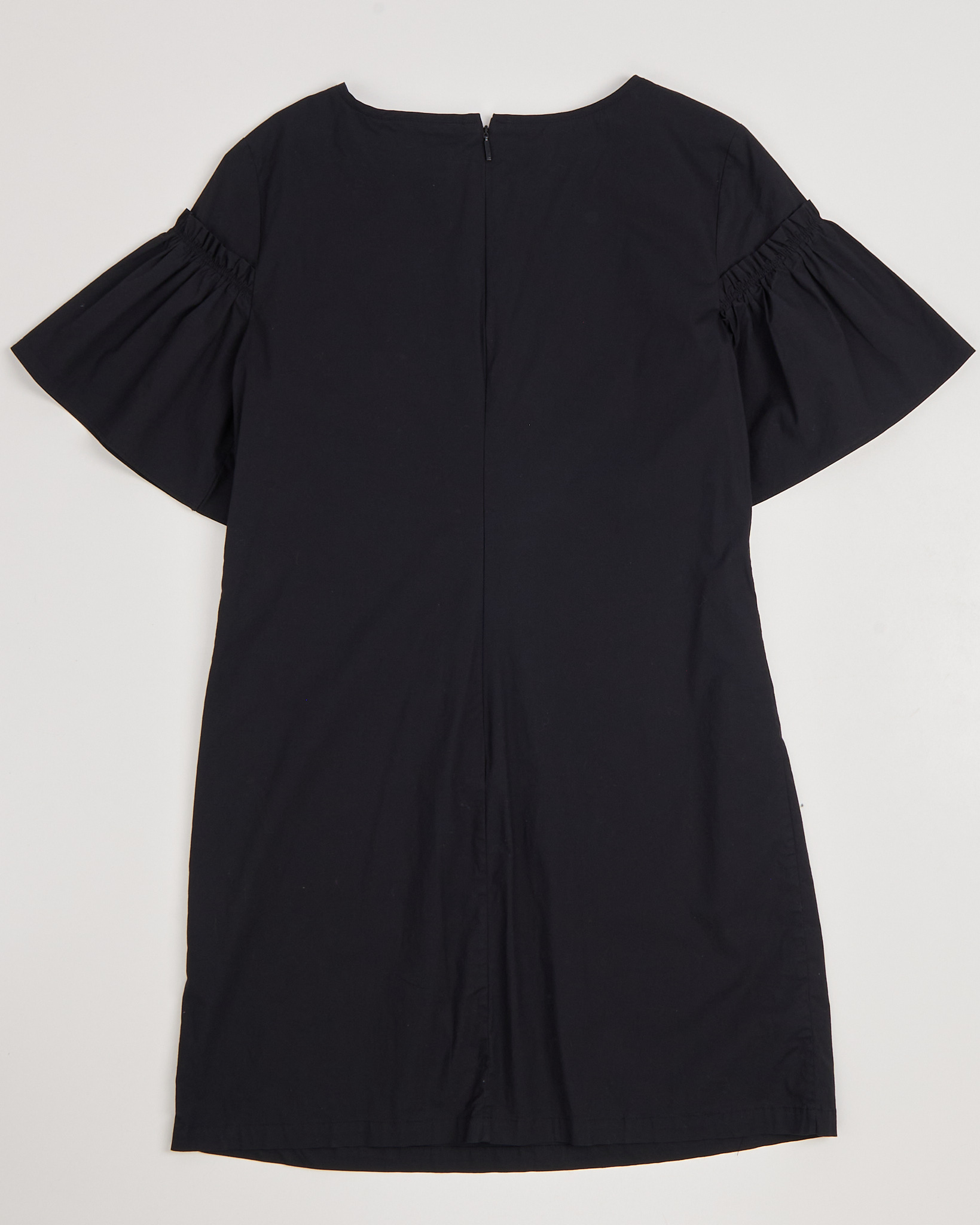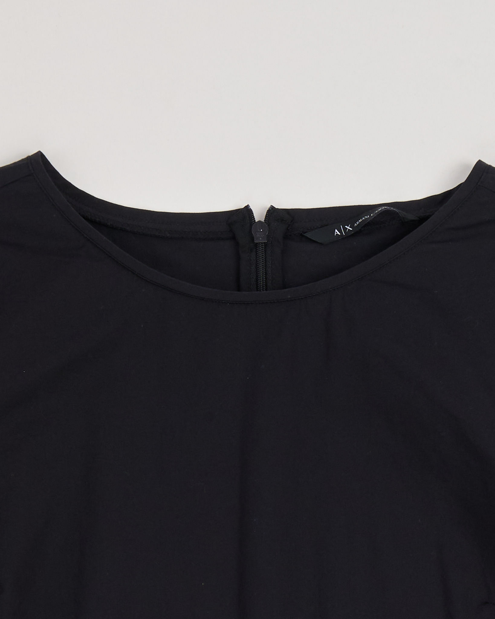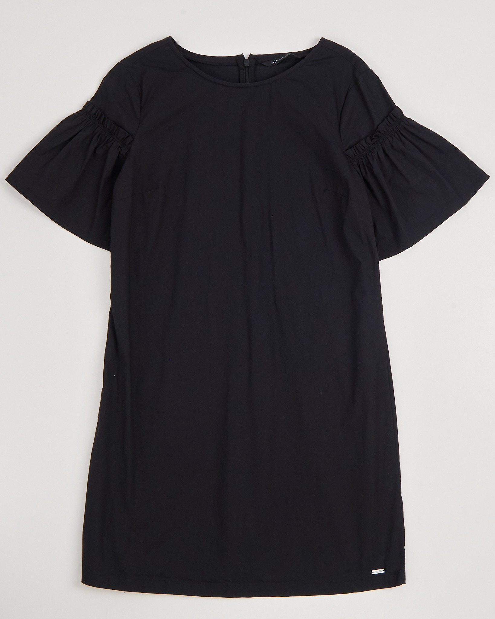 Платье Armani Exchange черного цвета. Свободная посадка. Рукава со сборкой по линии плеч. На спине расположена застежка на молнии. Низ дополнен небольшой брендированной вставкой.