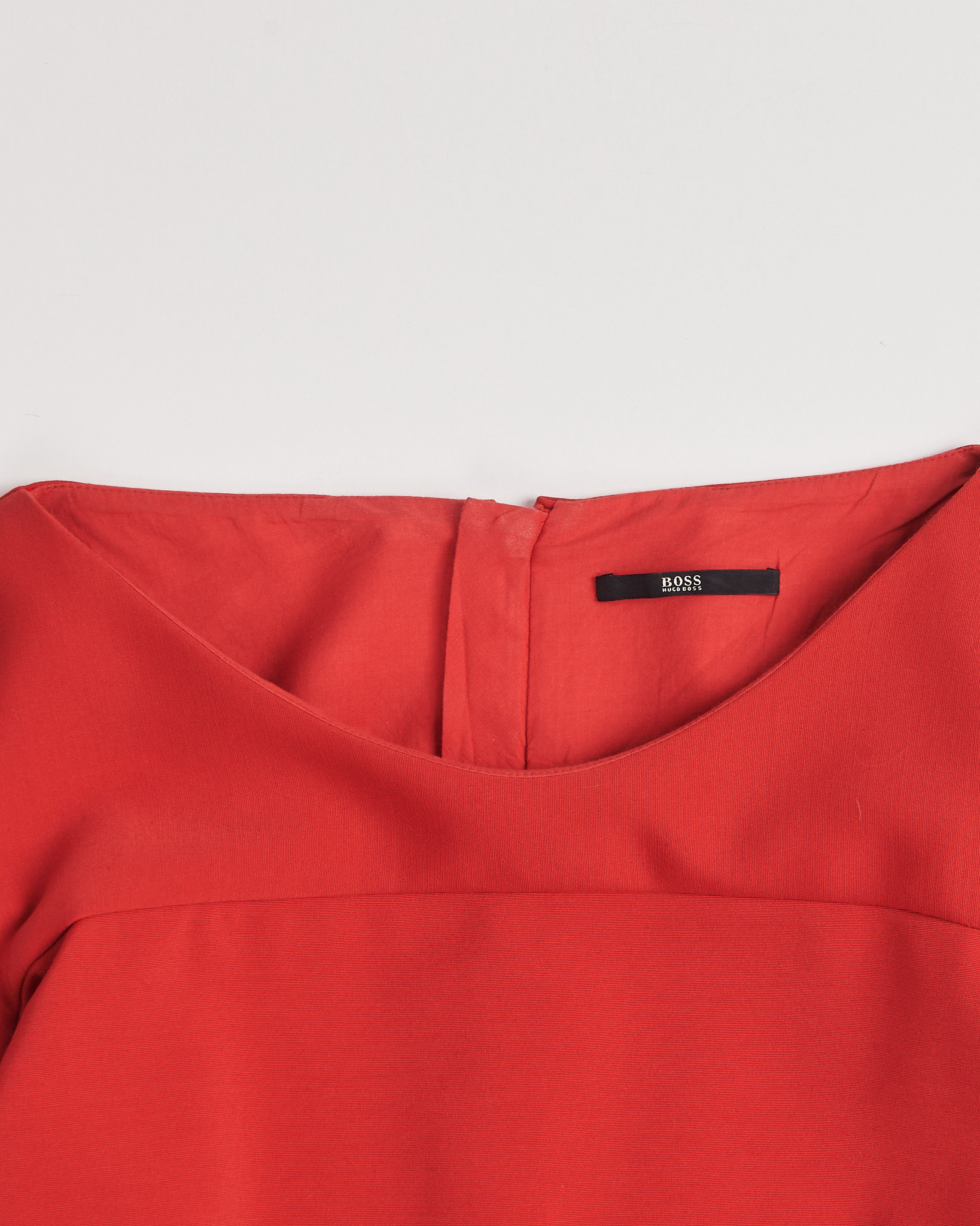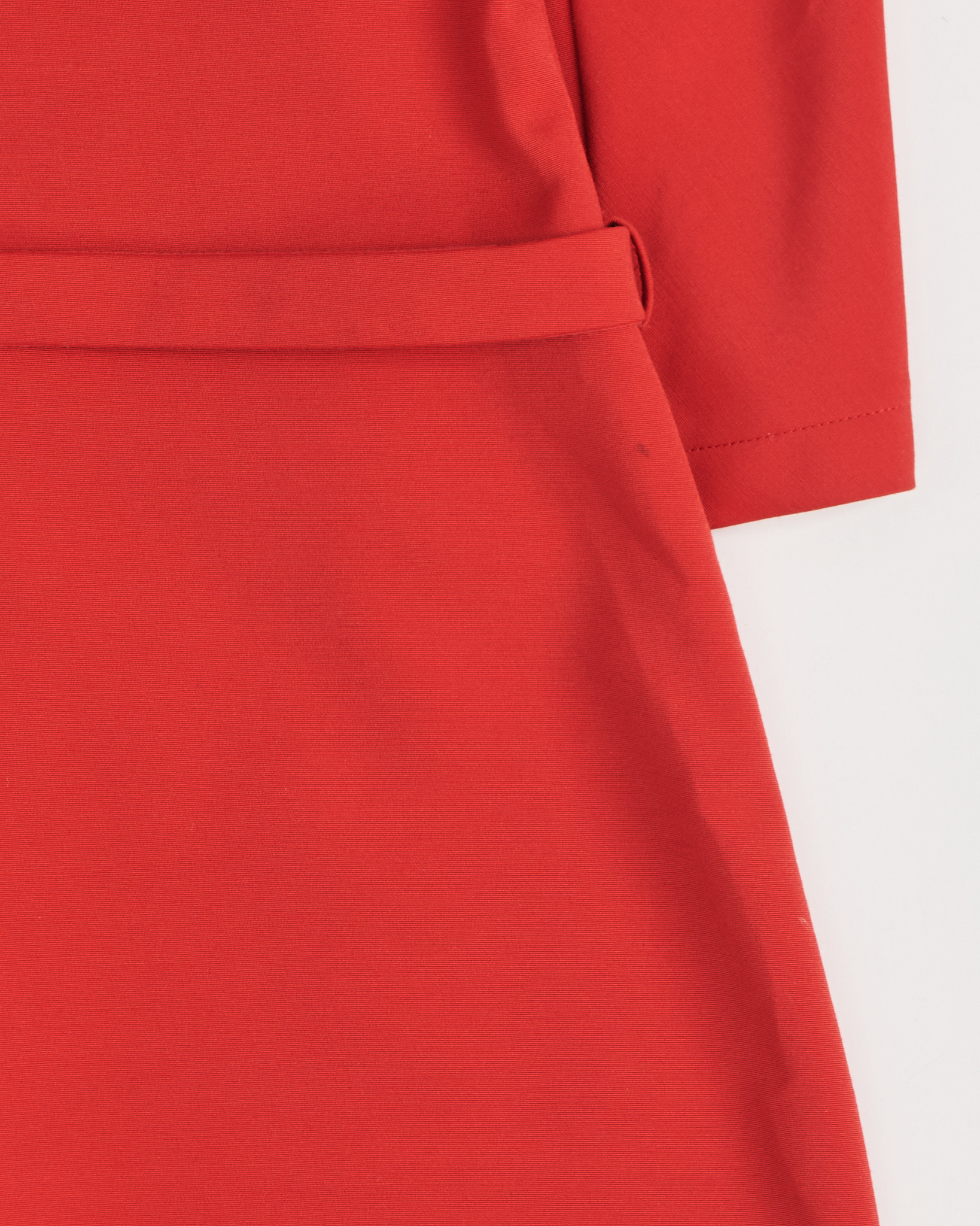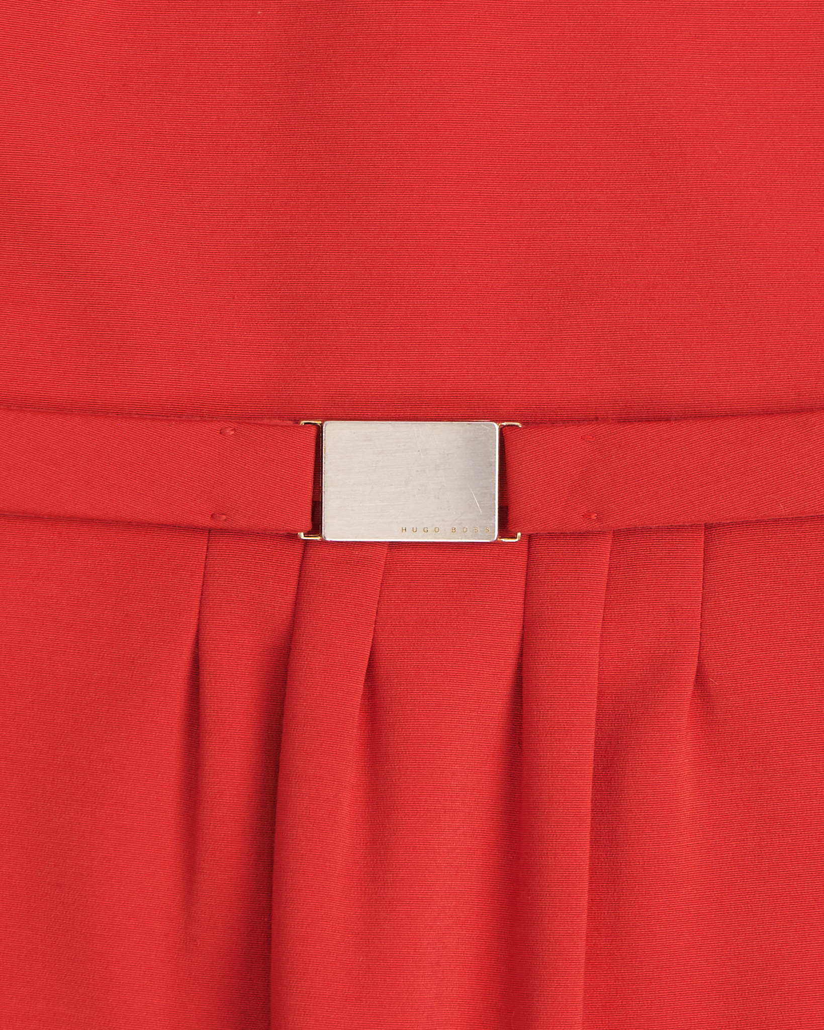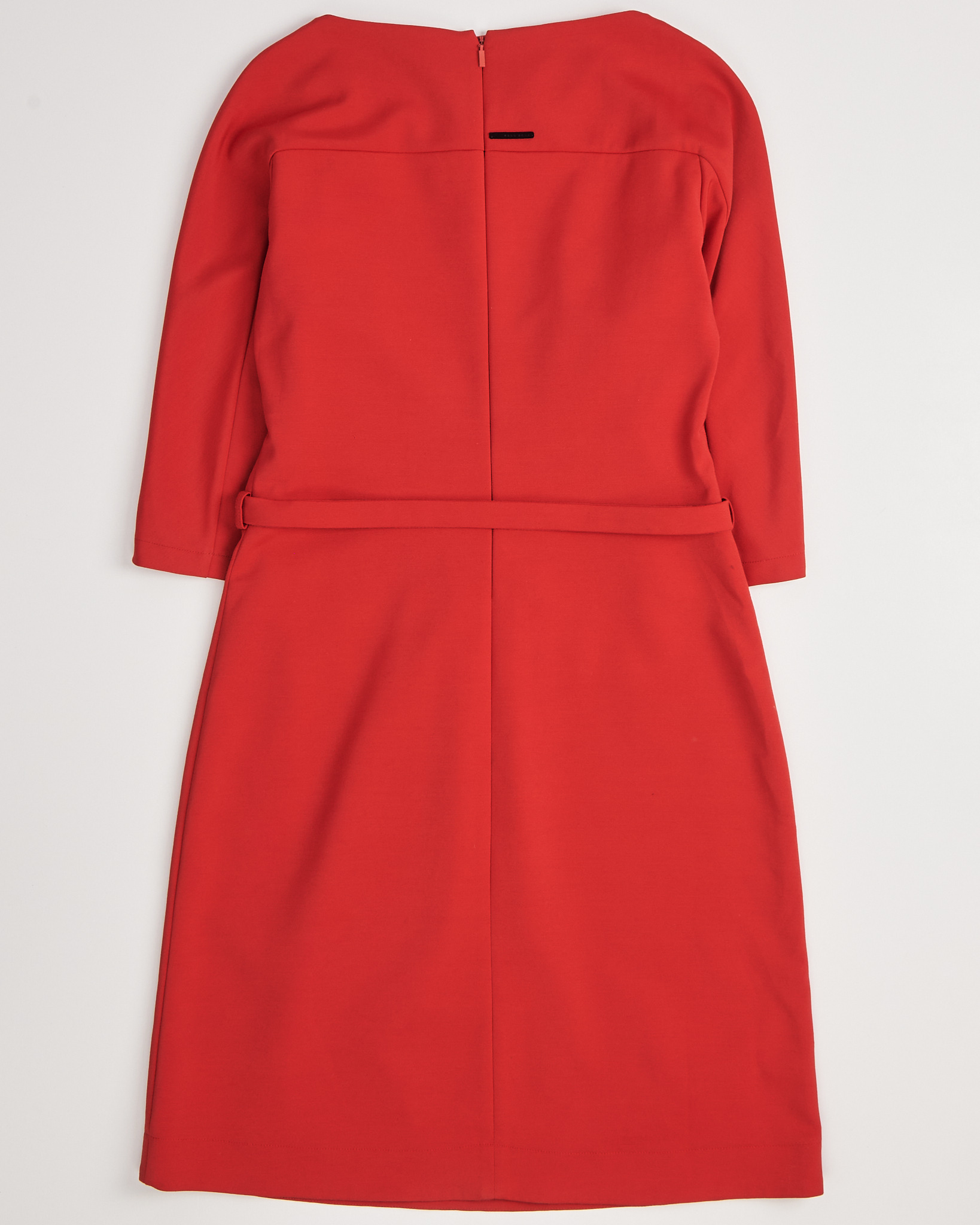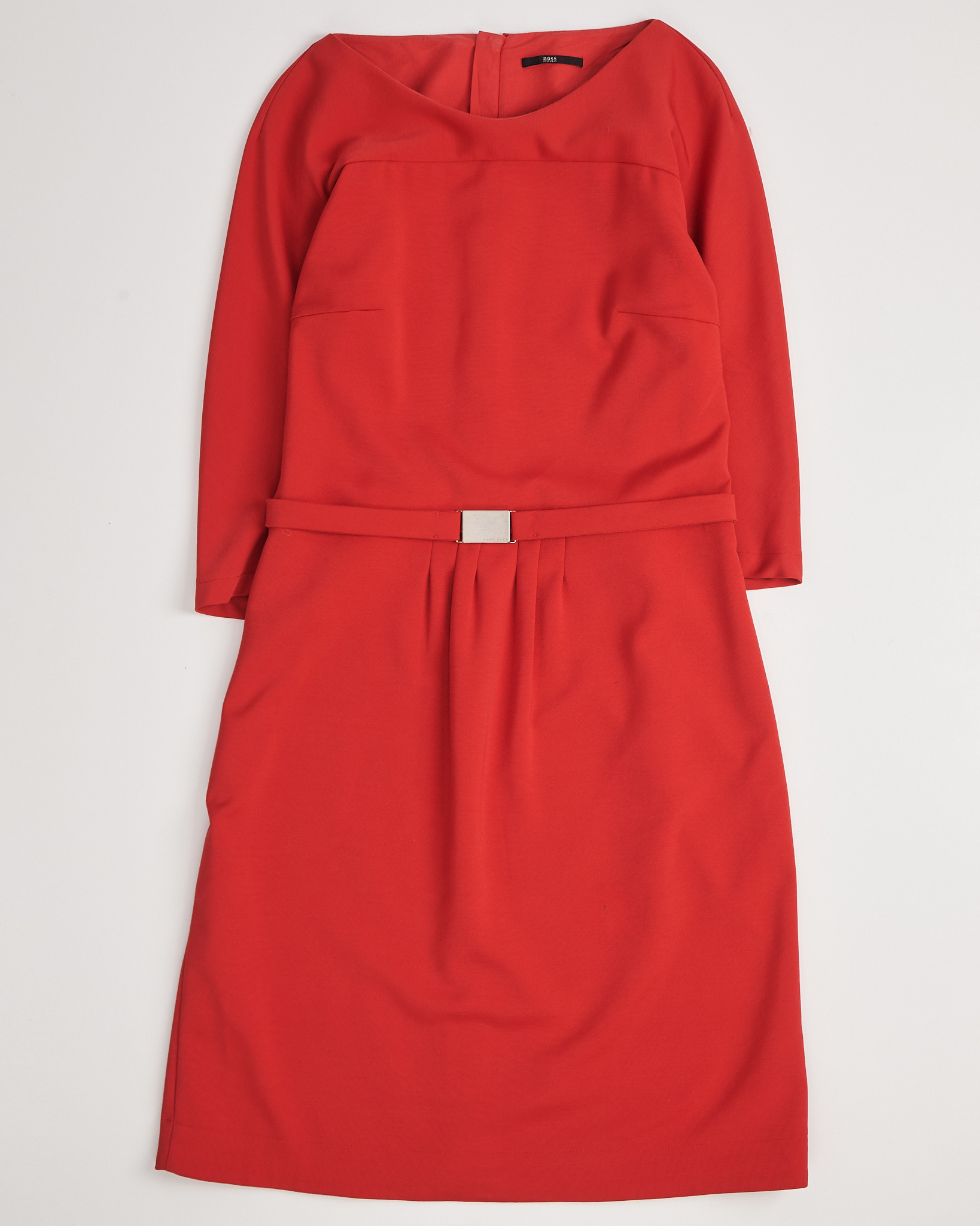 Платье прямого силуэта, длина миди. Акцент на талии - поясом с металлической пряжкой, гравировка логотипа. Укороченный рукав. Небольшая плиссировка на юбке.