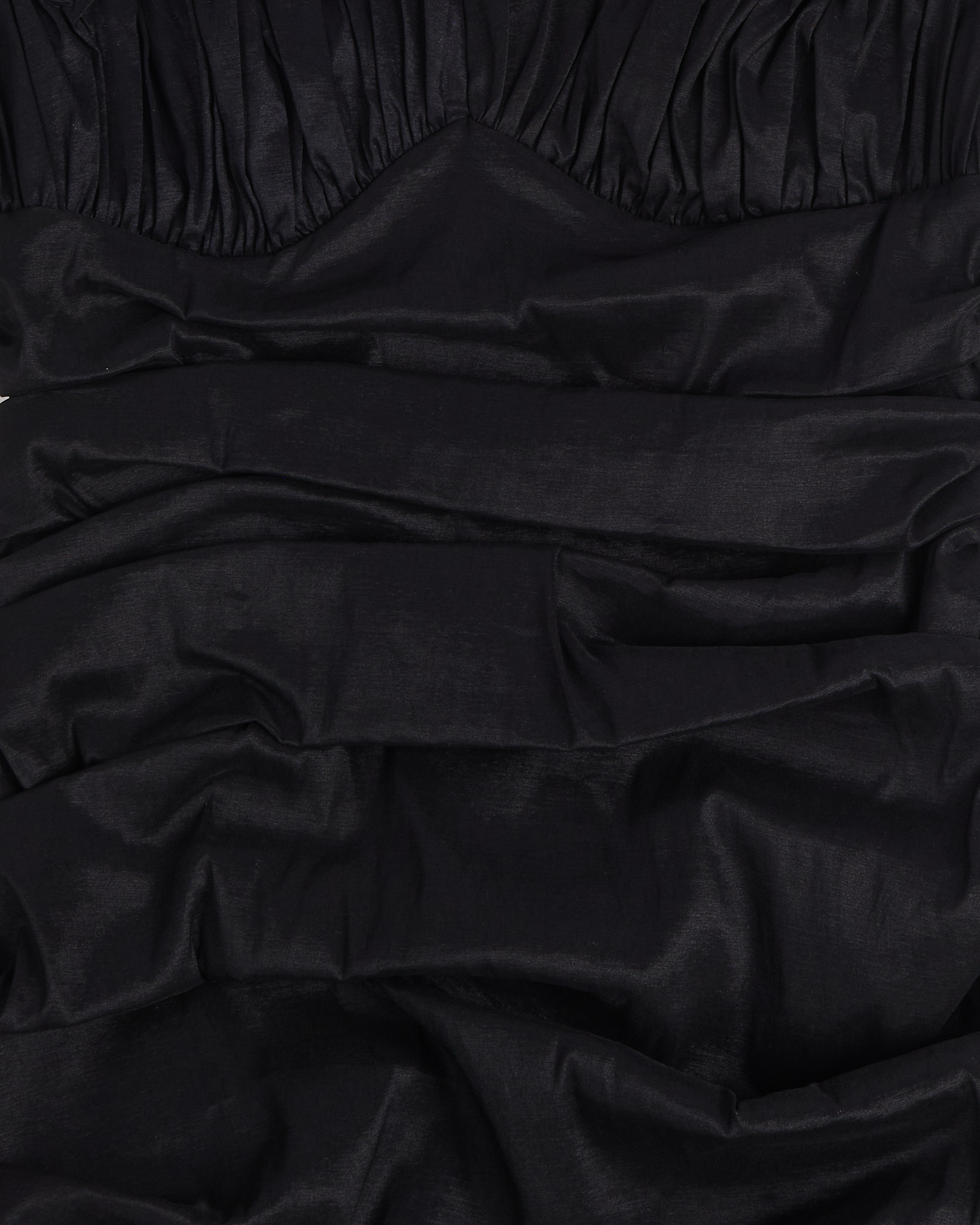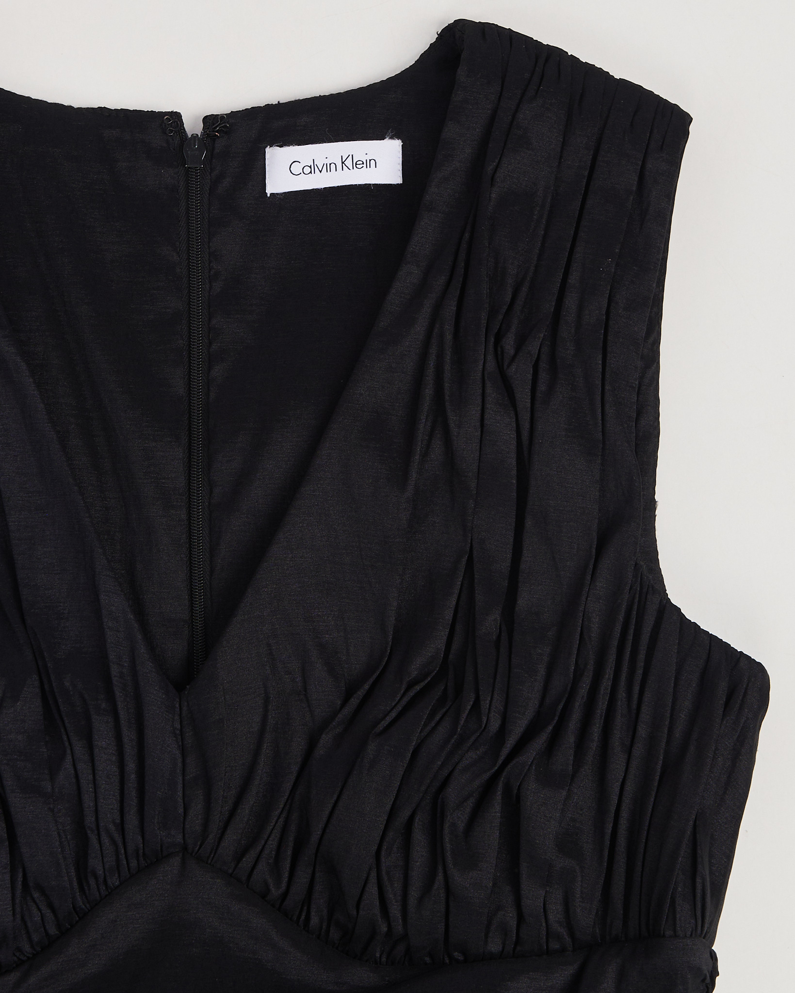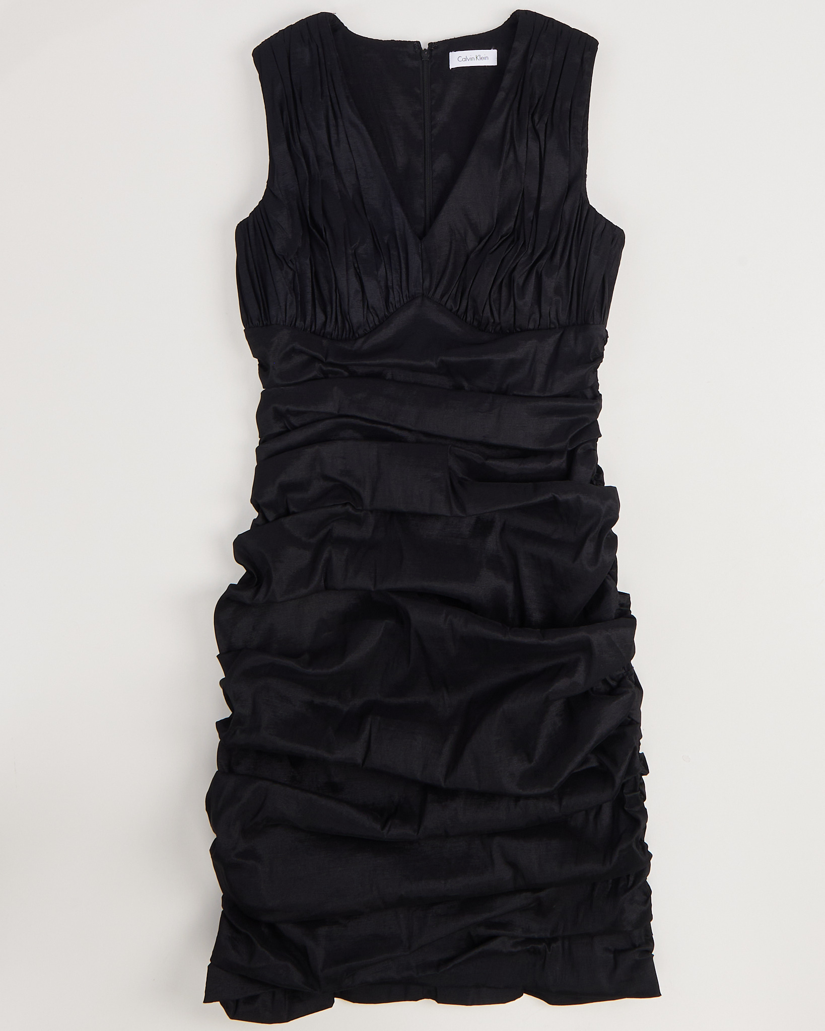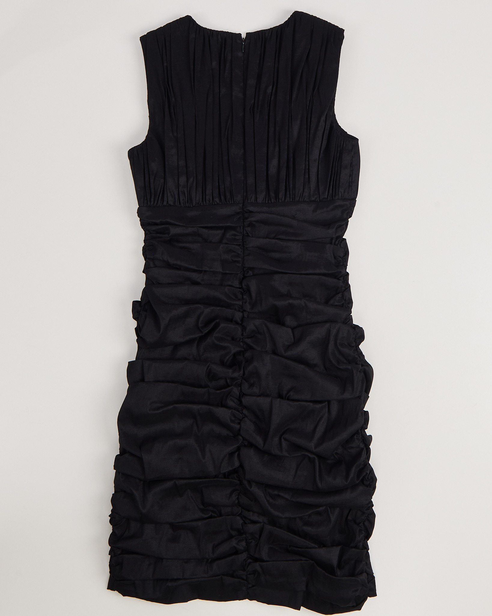 Платье из плотной ткани с жатой фактурой. Приталенный крой, легкий блеск, акцентный вырез на груди, удобная застежка на молнию.
