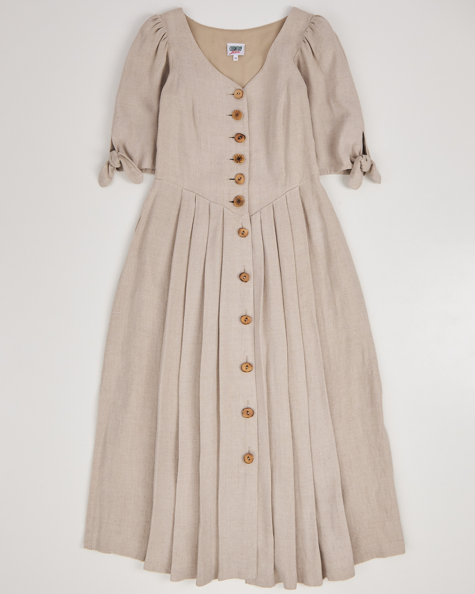 Платье из легкой ткани в бежевом цвете. Плиссированная юбка и с завязками на рукавах. Деревянные пуговицы вдоль передней части.