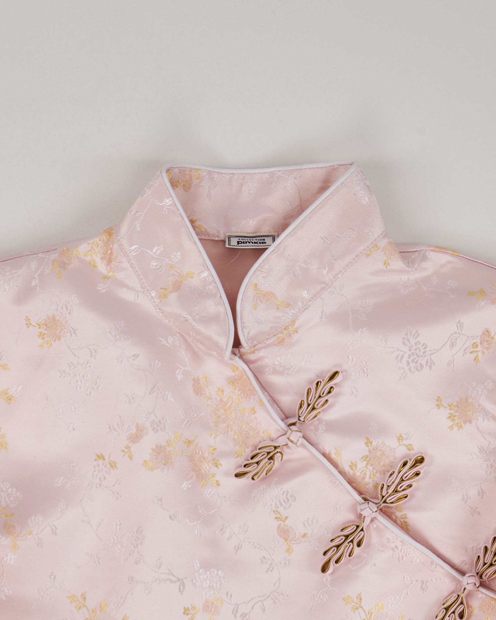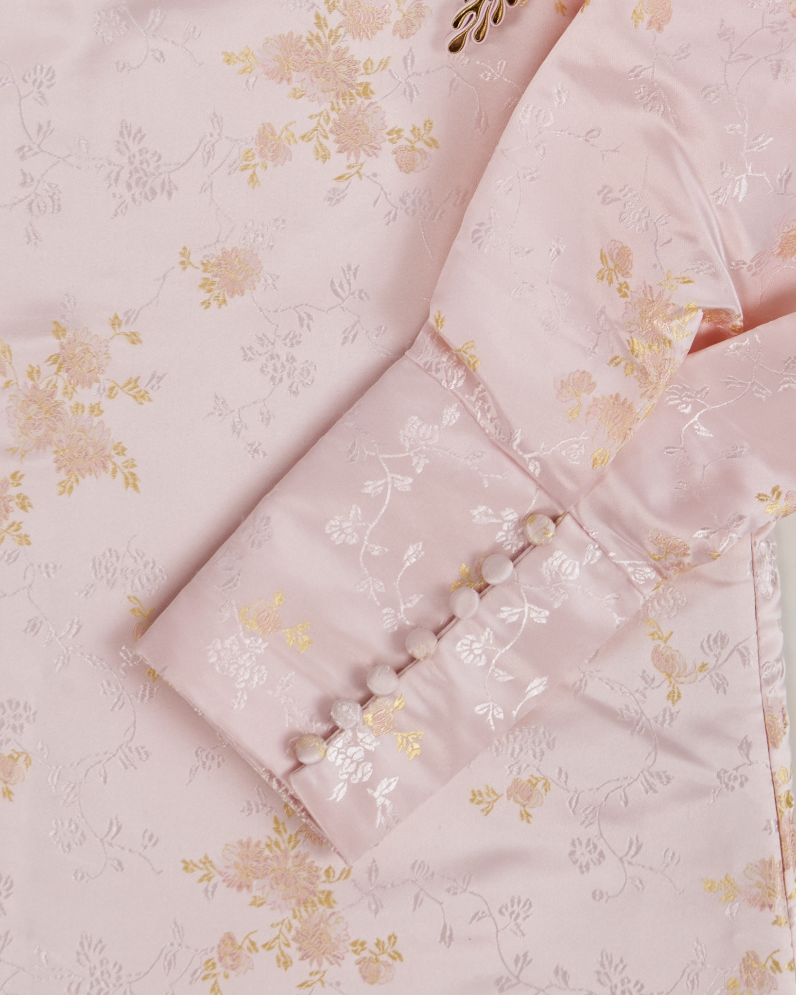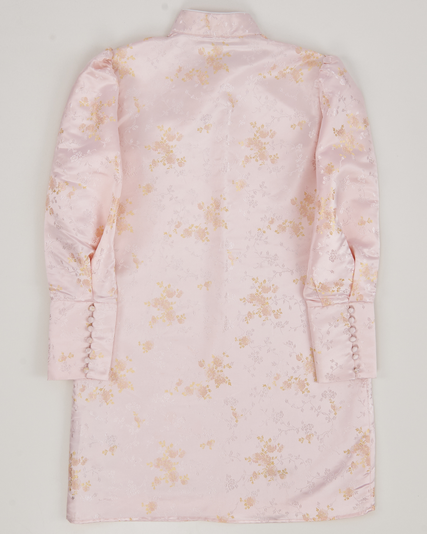 Платье из гладкой ткани нежно розового цвета с шелковистым блеском. Прямой силуэт, линия плеч собранная, посадка уверенная. Косая застежка и высокий воротник и тонкий цветочный рисунок.