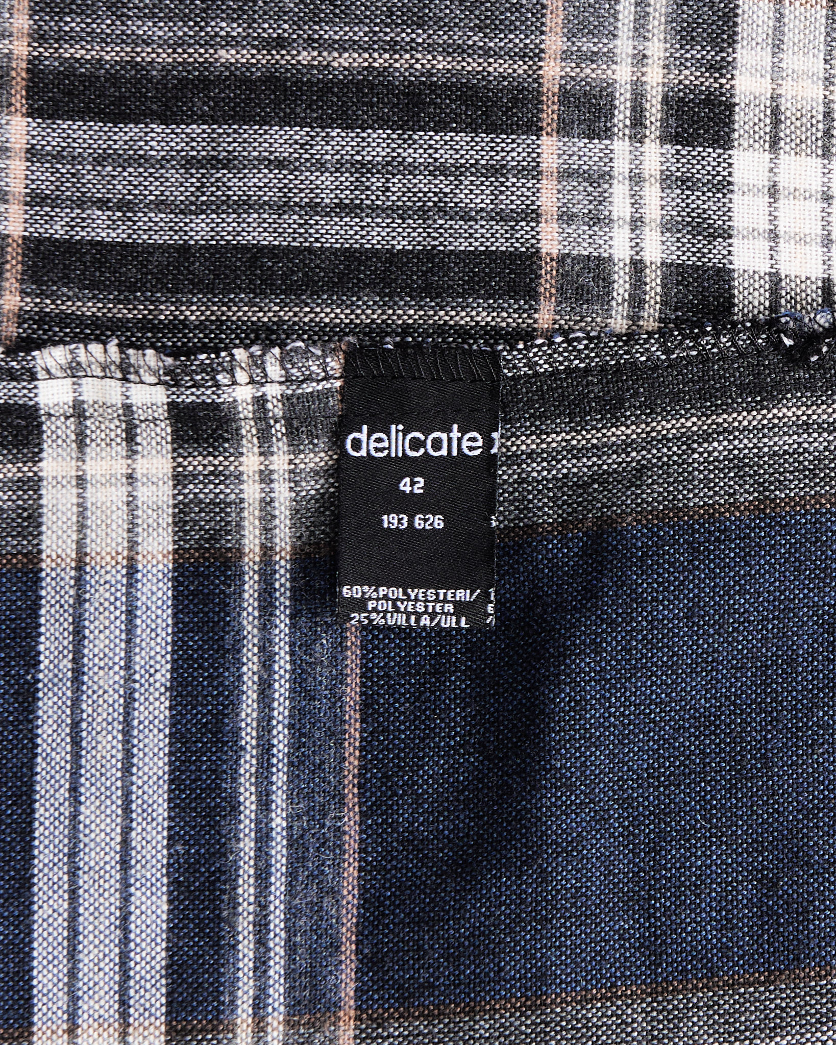 Платье выполнено из 60% полиэстера и 25 % шерсти, 15% искусственного волокна.Прямой верх и расклёшенная юбка формируют аккуратную посадку по фигуре, пояс подчёркивает талию и позволяет регулировать объём.Клетчатый рисунок выглядит собранно и графично, за счёт чего вещь смотрится цельно и продуманно.