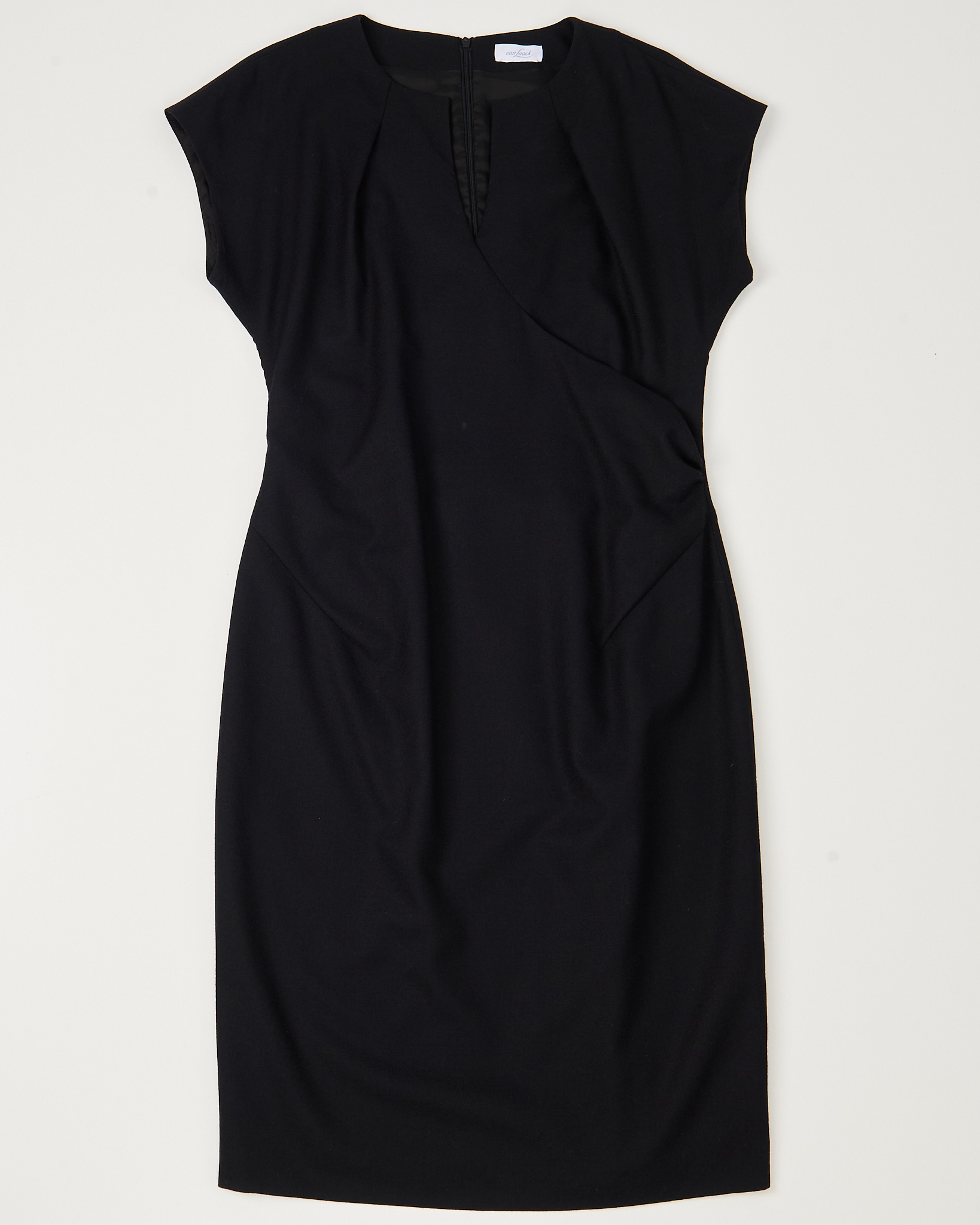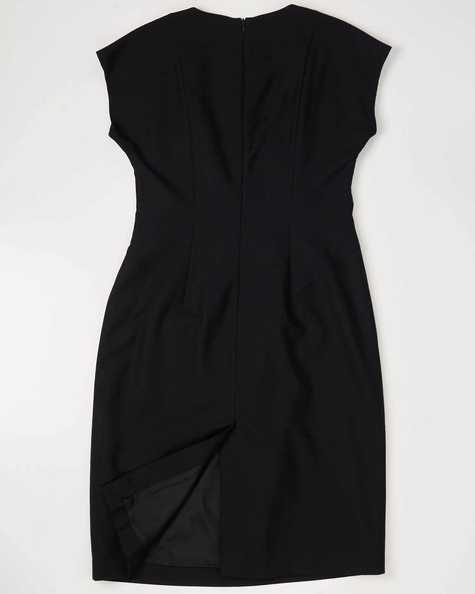 Классическое черное платье от Van Laack. Приталенный силуэт, длина миди, короткие цельнокроеные рукава, сзади застёжка-молния и шлица по центру. Нестареющая классика в футляре.