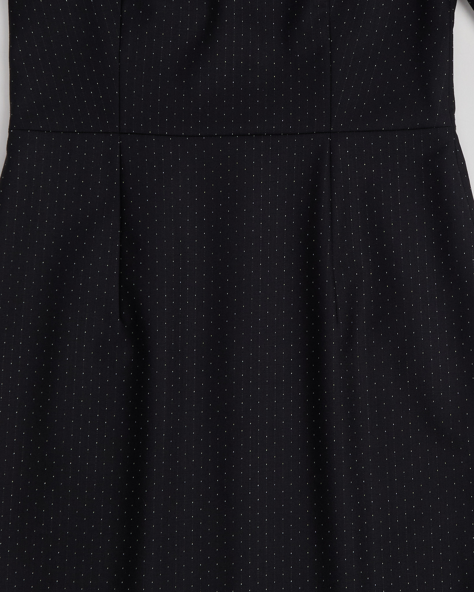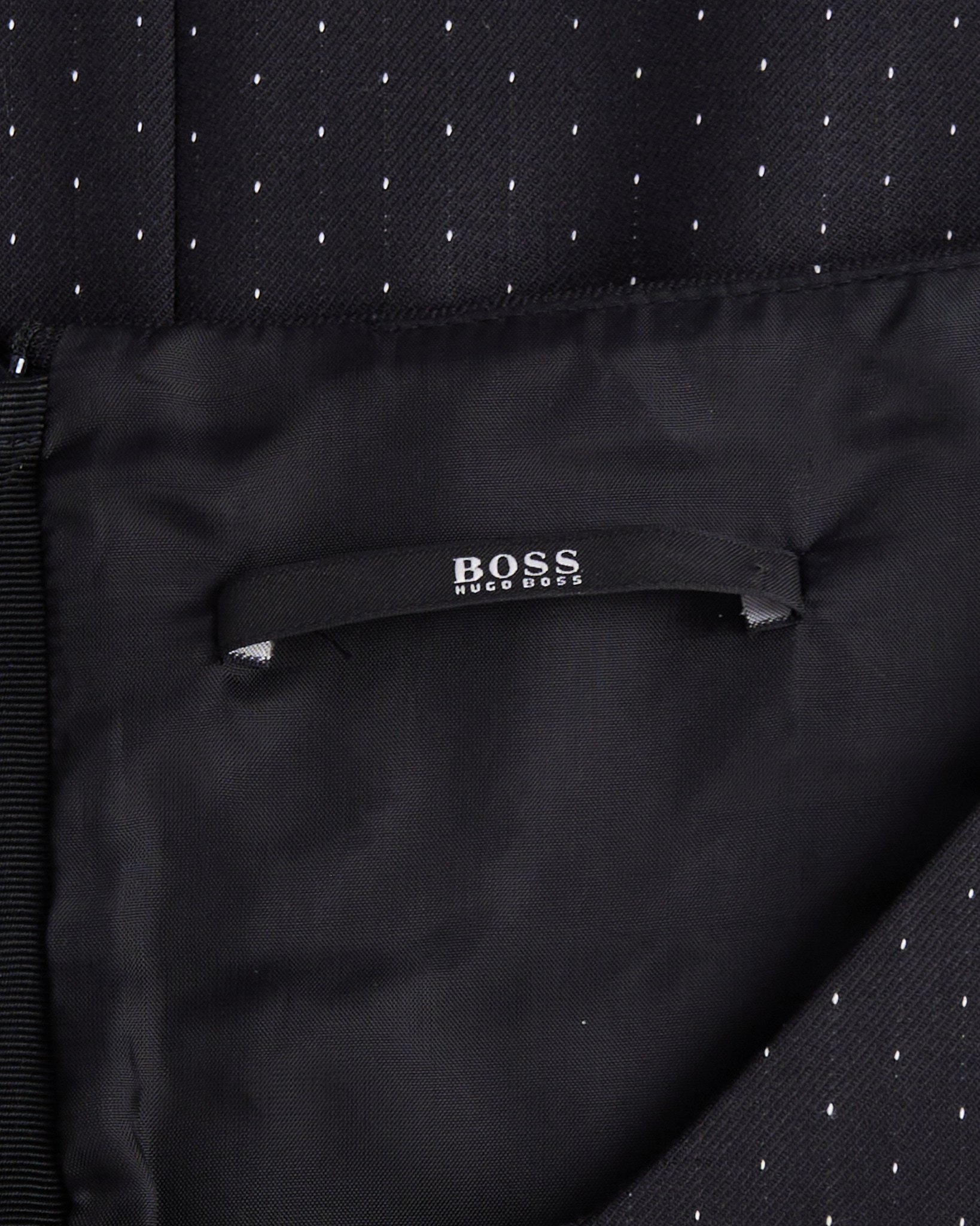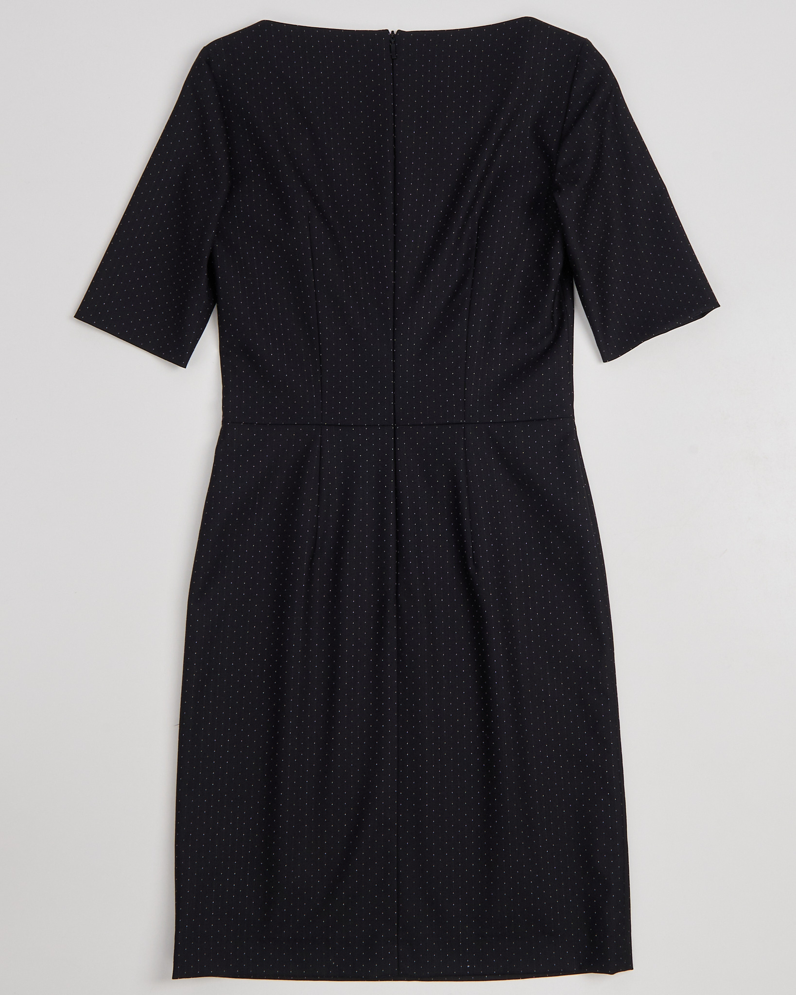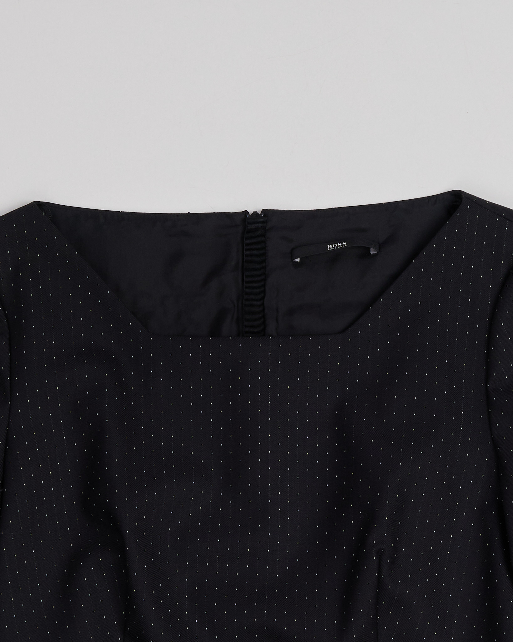 Платье Hugo Boss черного цвета с тонким точечным рисунком. Прямой силуэт. Линия талии подчеркнута швом. Квадратный вырез. Сзади расположена потайная молния.