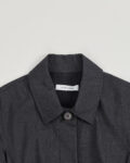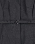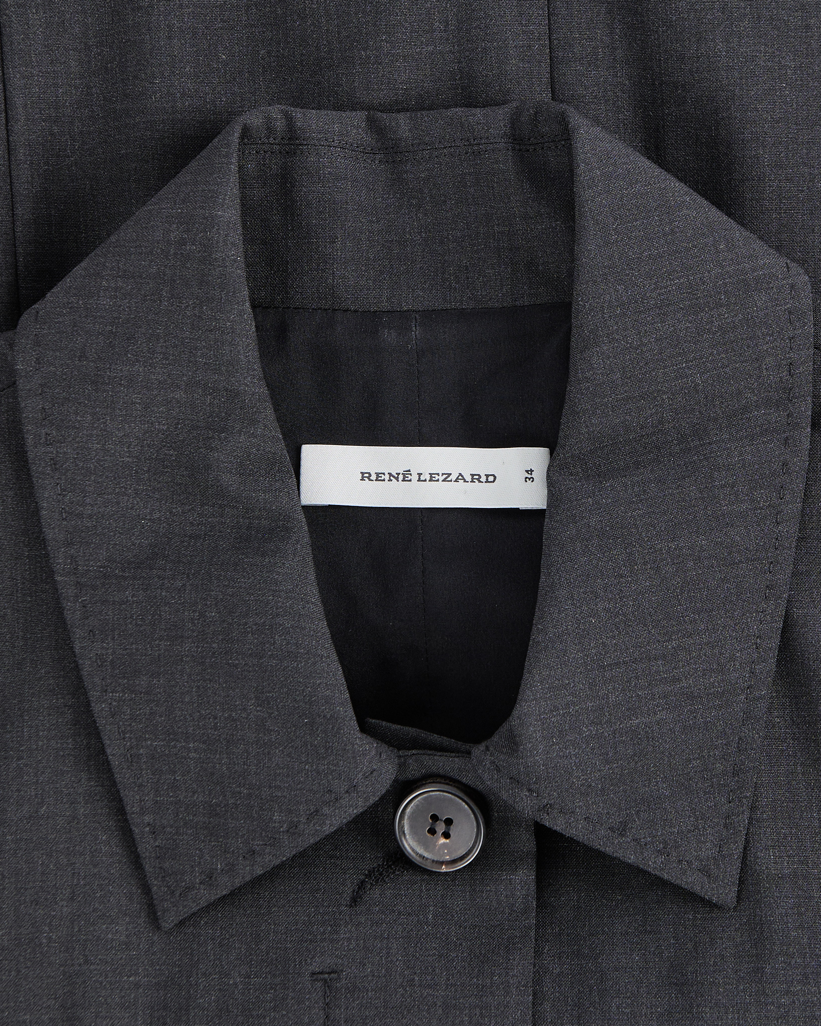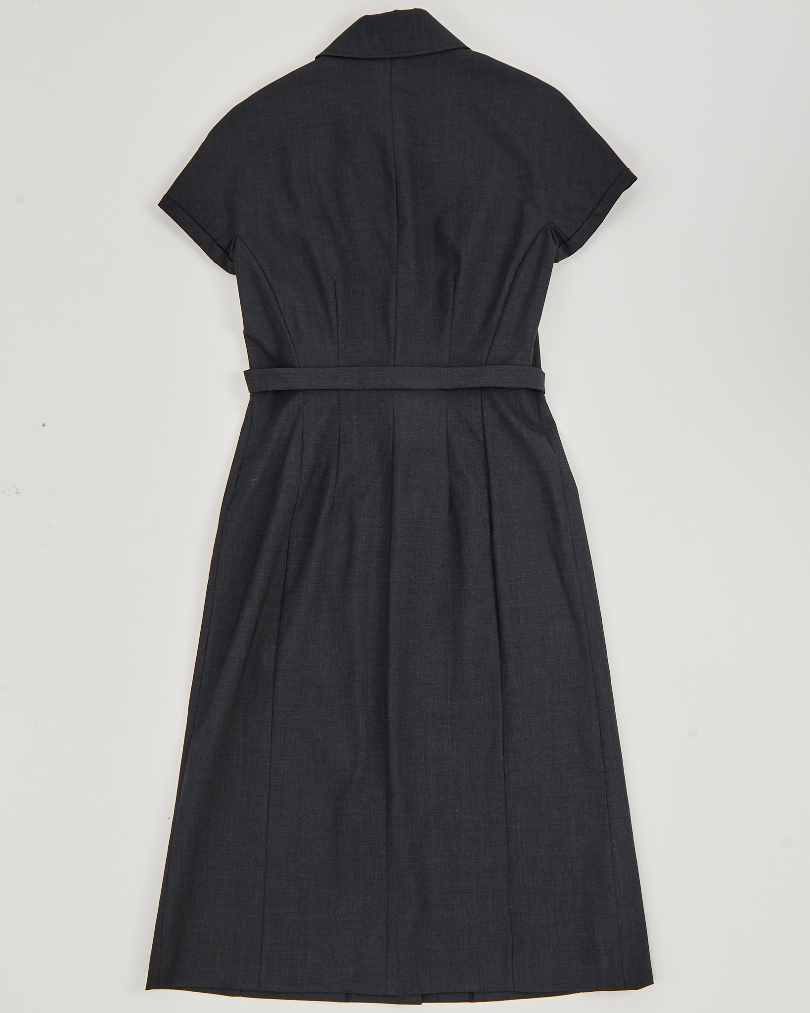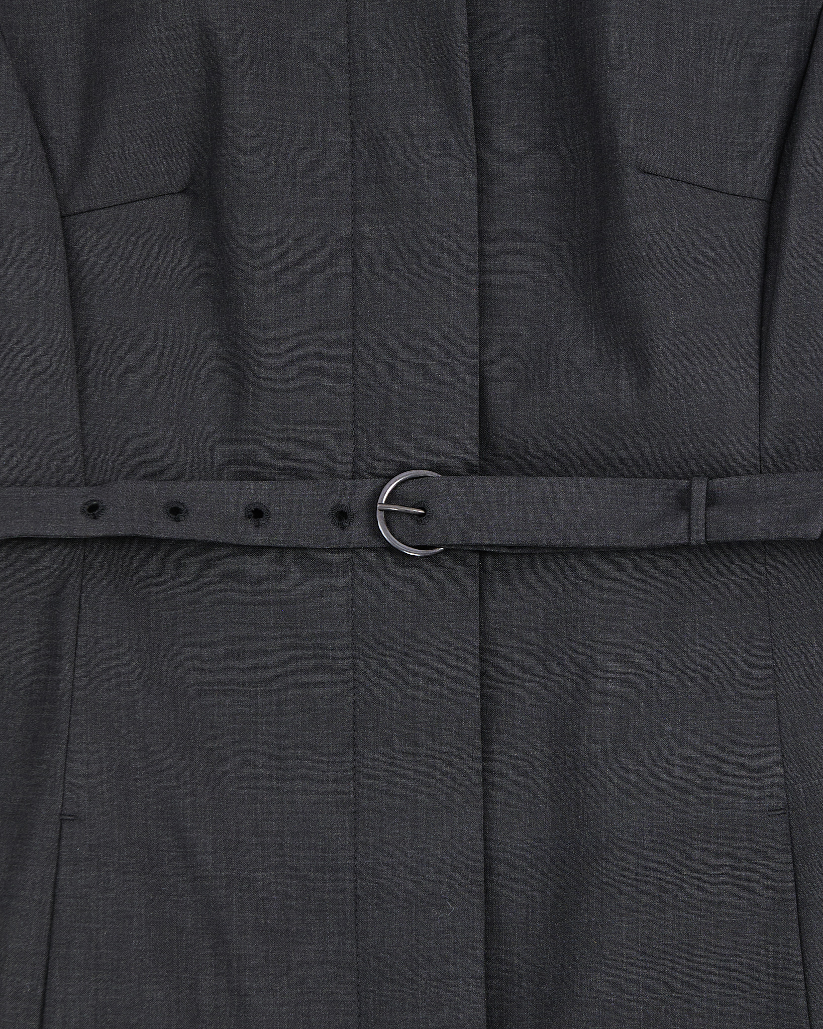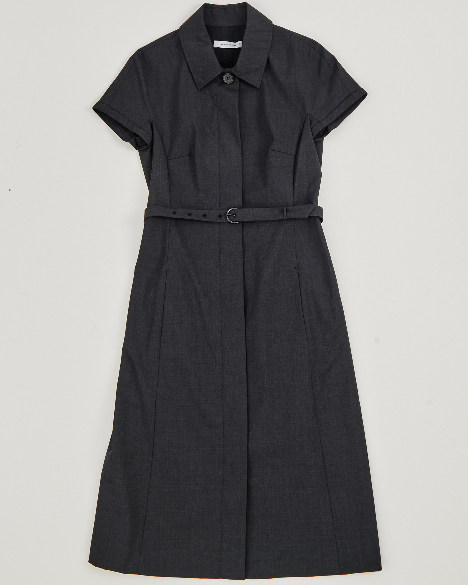 Платье René Lezard из шерсти. Приталенный крой с поясом, удобная скрытая застежка на пуговицы. Глубокий графитовый оттенок, рукав реглан, аккуратный воротник.