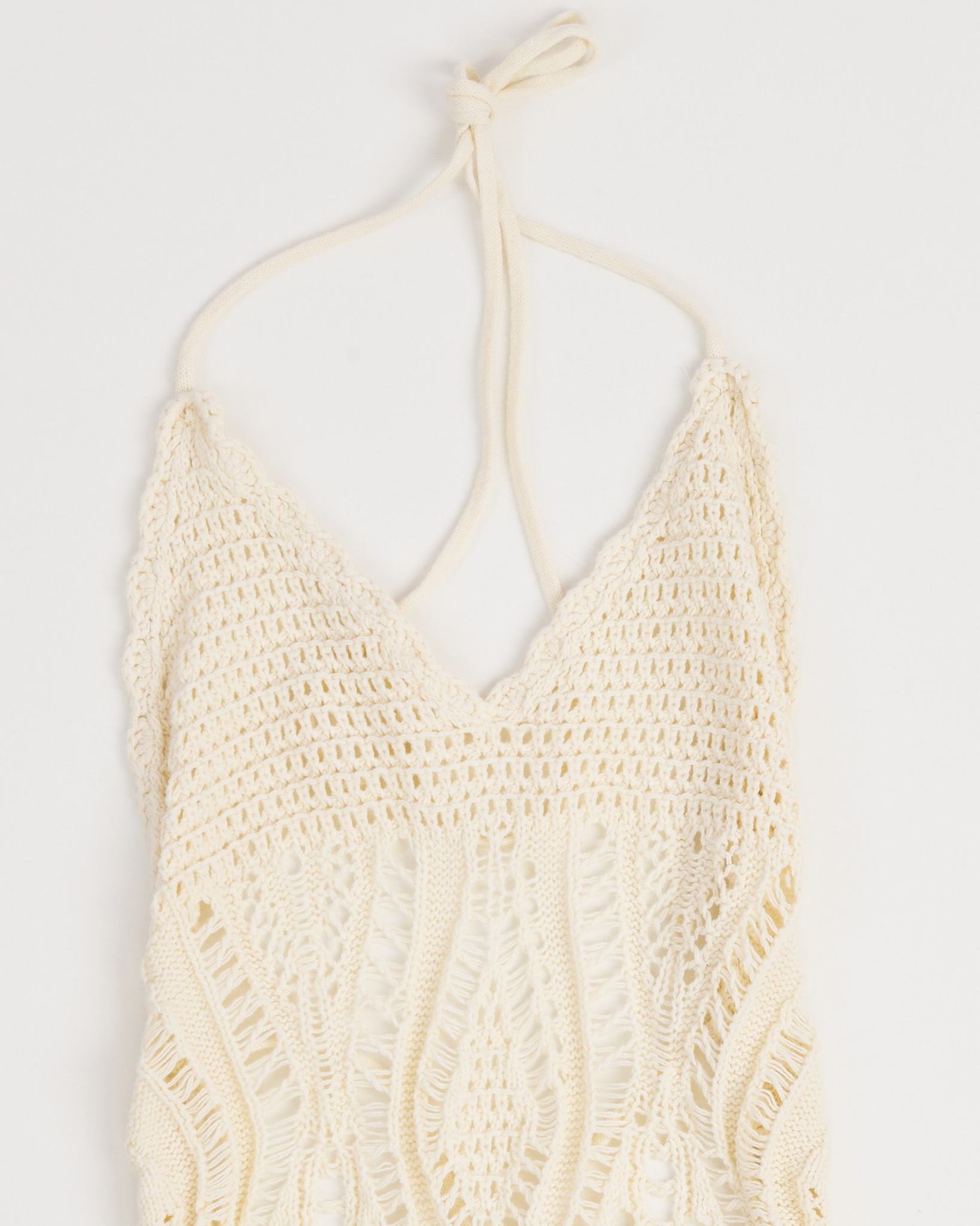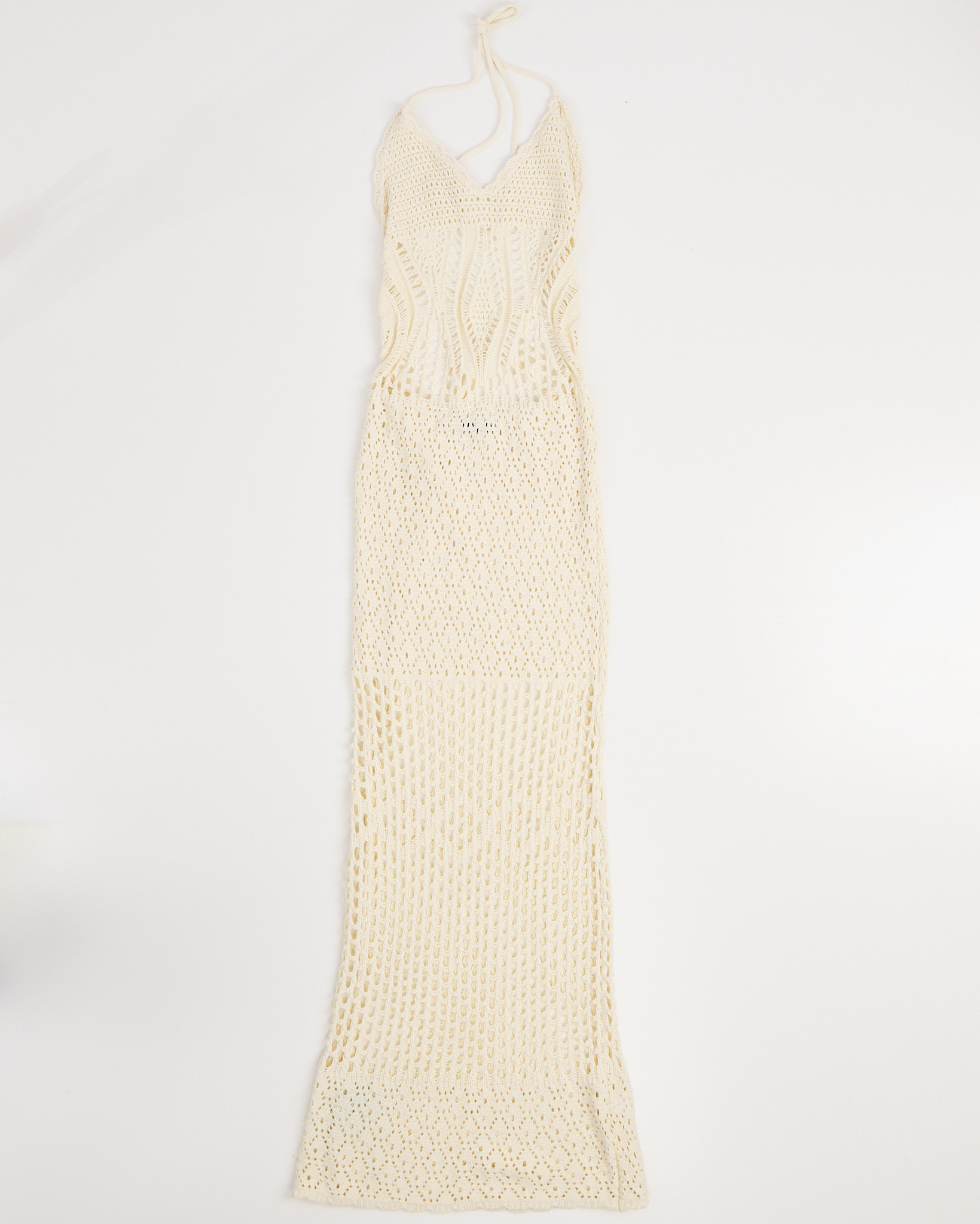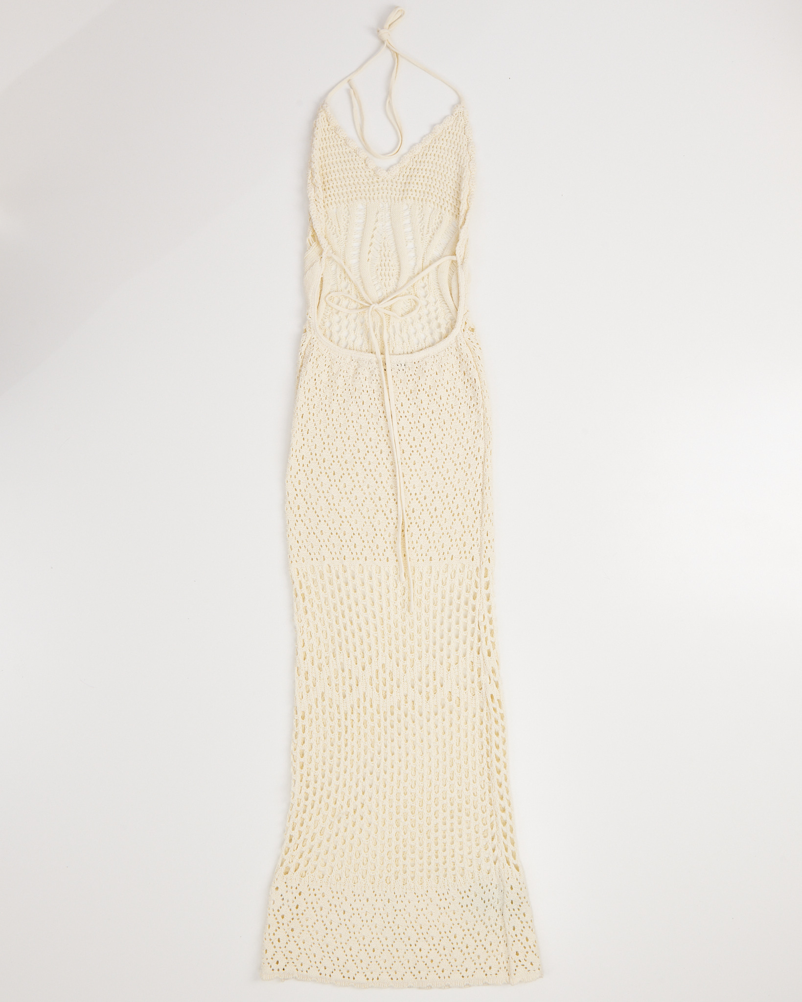 Вязаное платье Robertson Rodeo молочного оттенка. Посадка по фигуре. Верх с глубоким V-вырезом и завязками на шее. Подчеркнута линия талии. Открытая спина, фиксируется тонкими завязками.