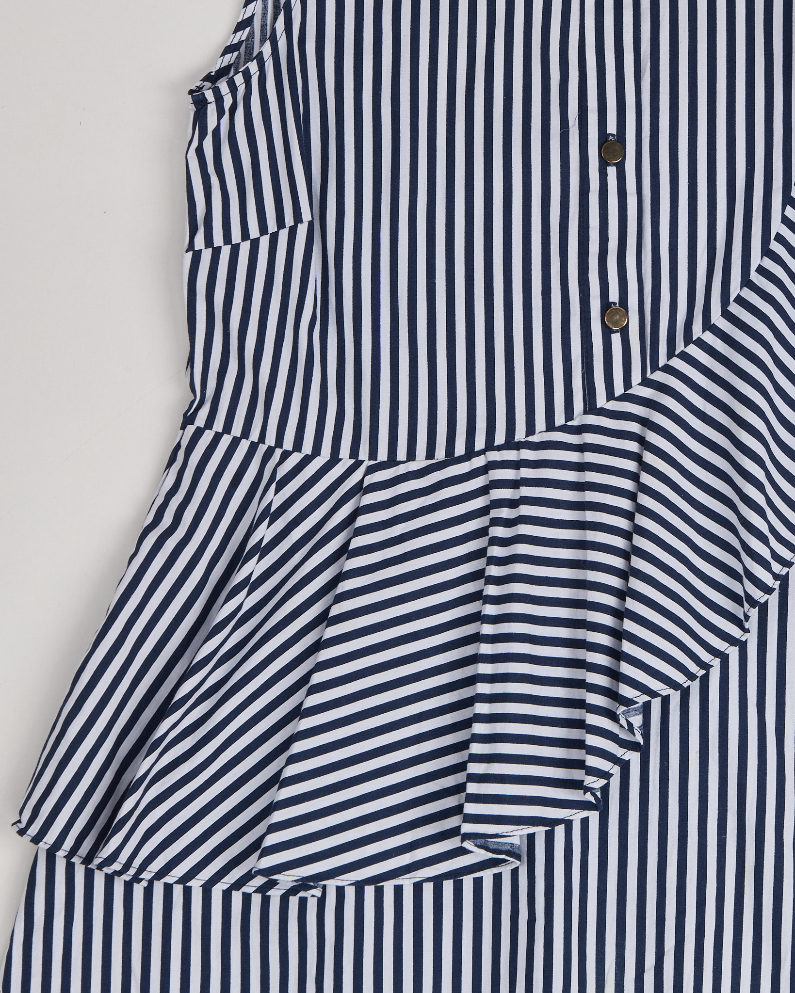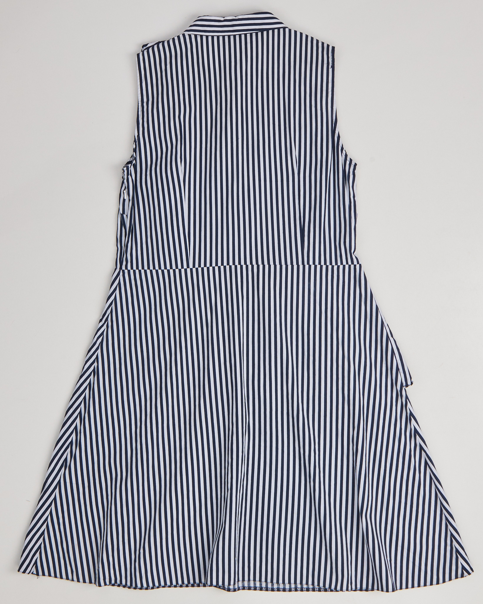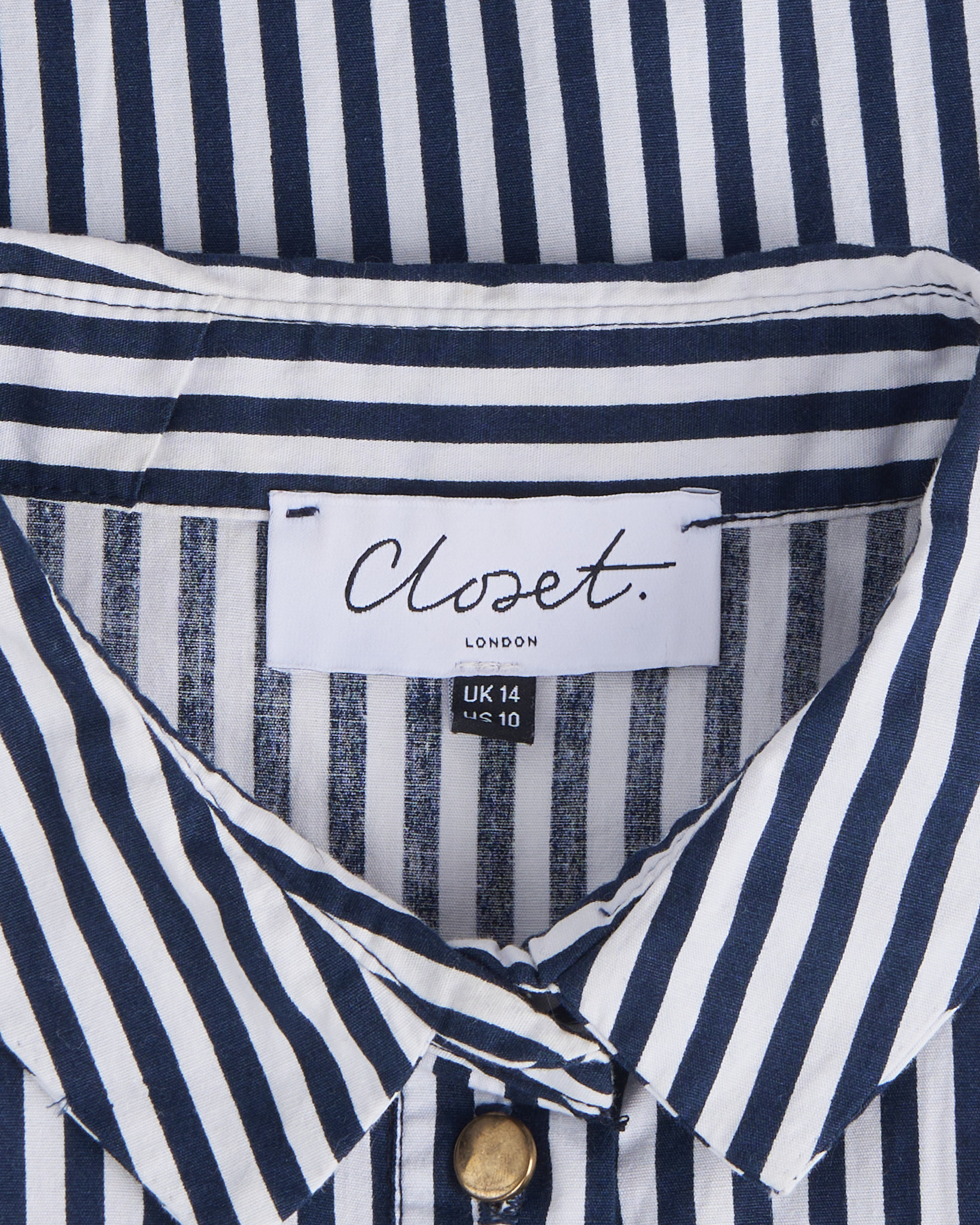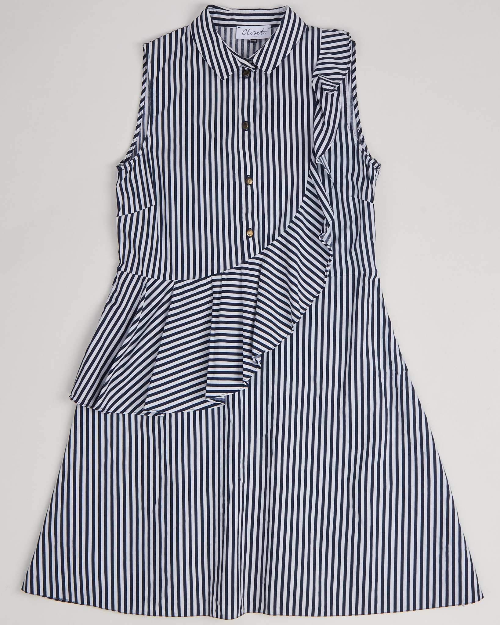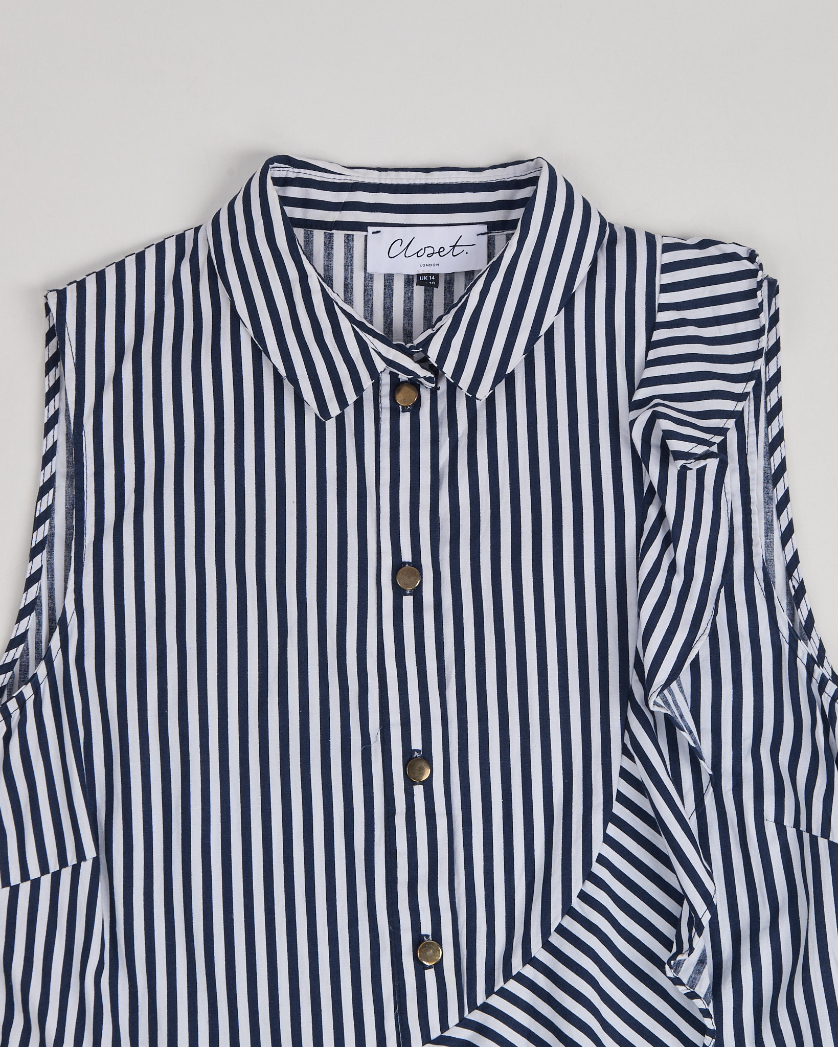 Платье-рубашка в полоску Closet. Платье выполнено в стиле рубашки с воротником и пуговицами, асимметричная оборка на передней части,без рукавов, с расклёшенной юбкой.