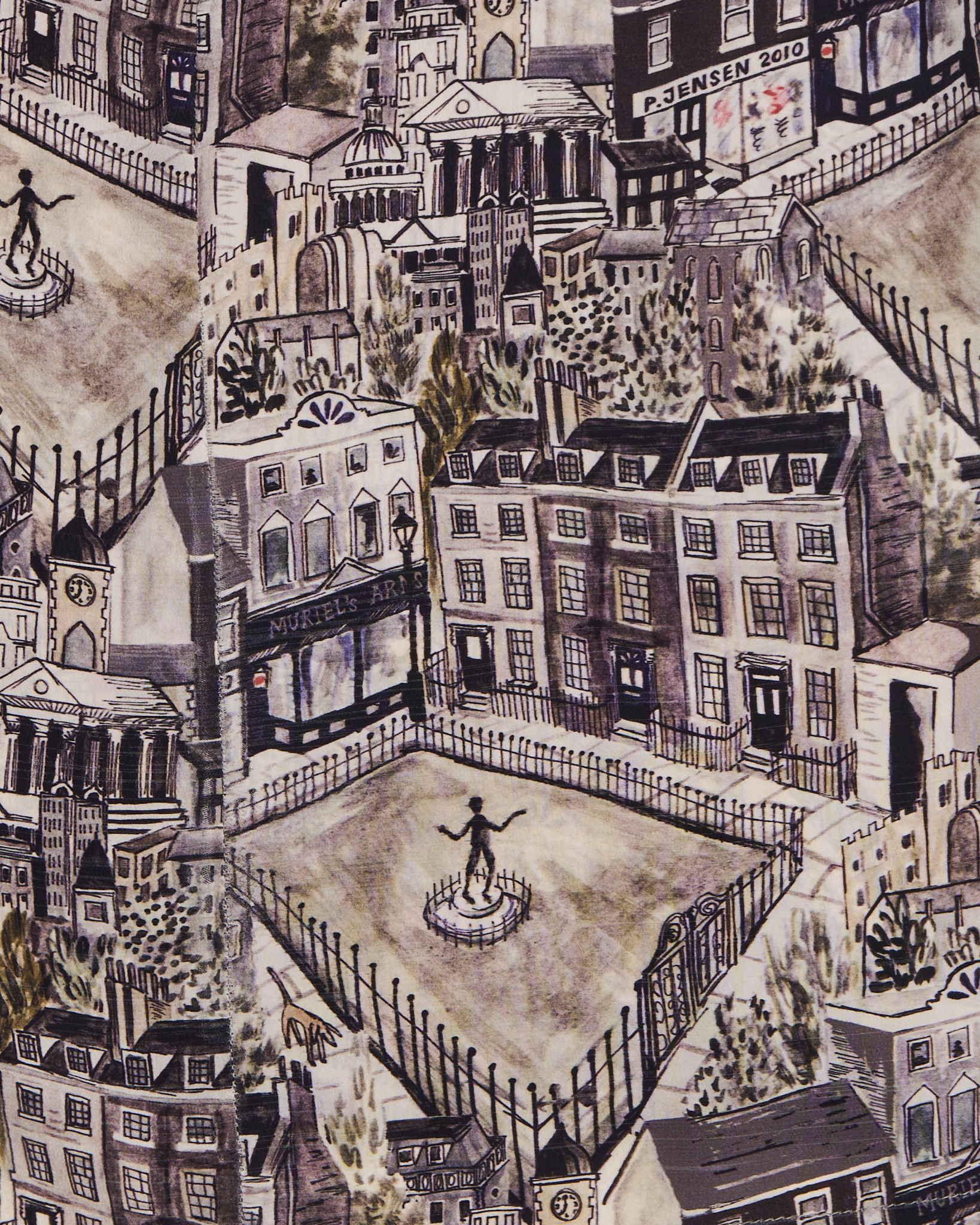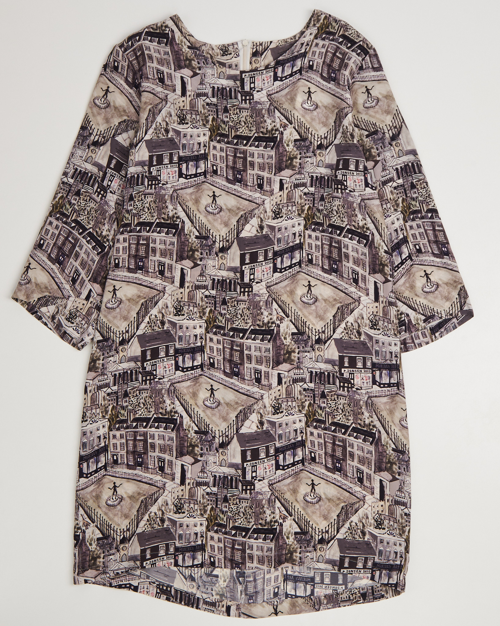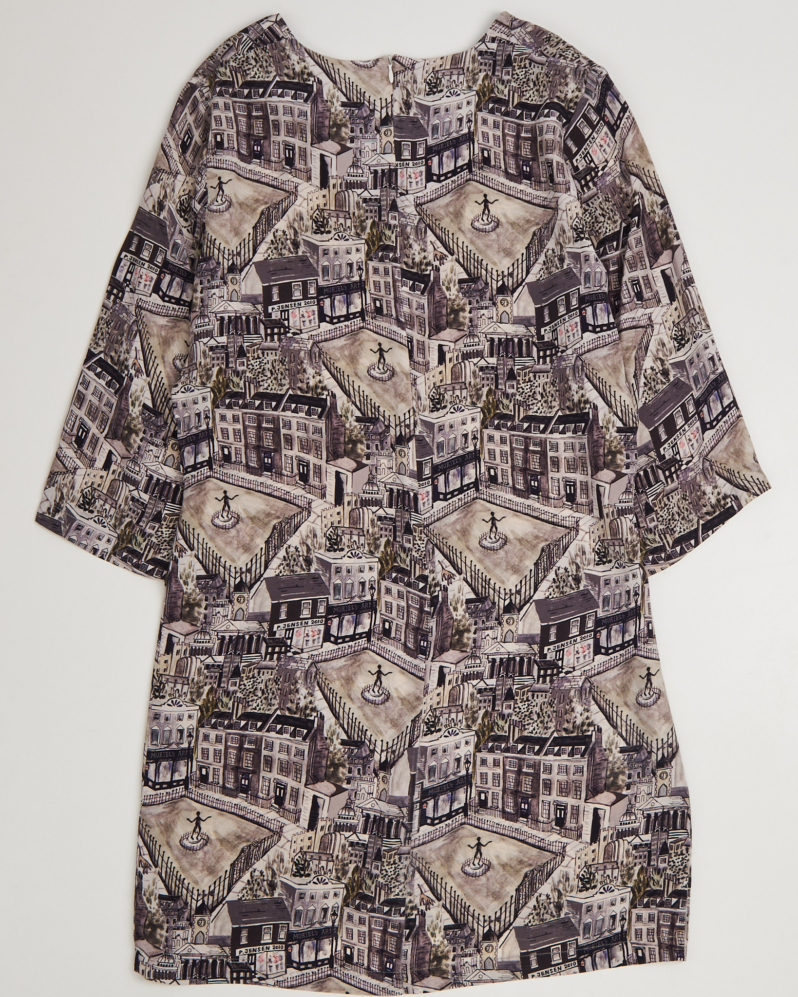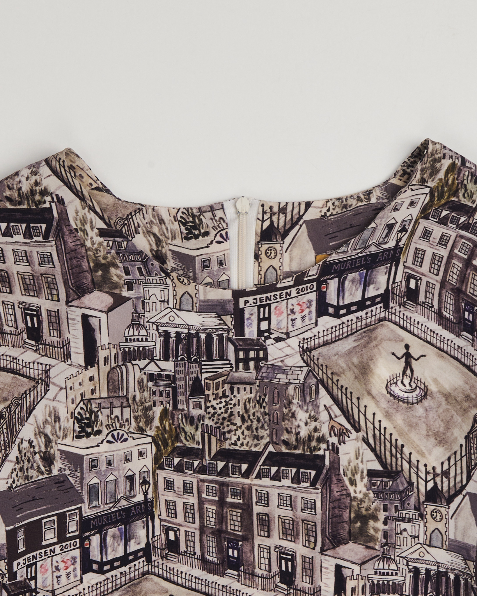 Платье из шелка, прямого силуэта с укороченными рукавами и архитектурным принтом. Застёжка на молнии по спинке