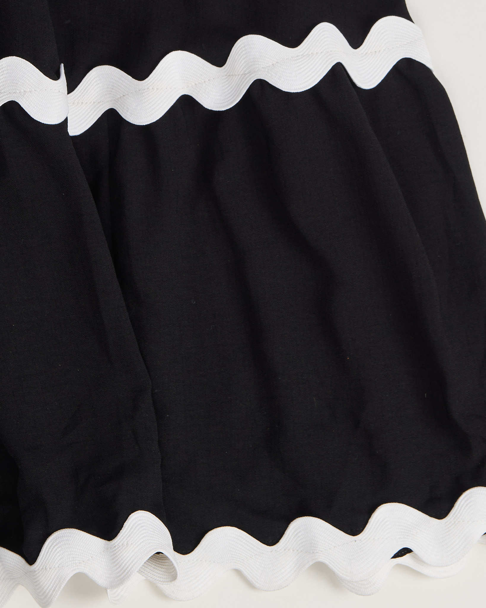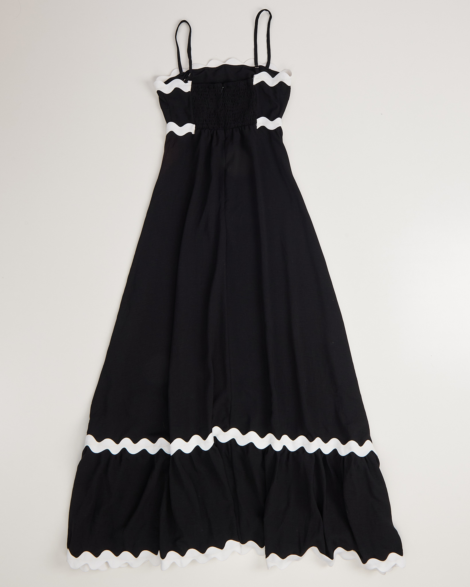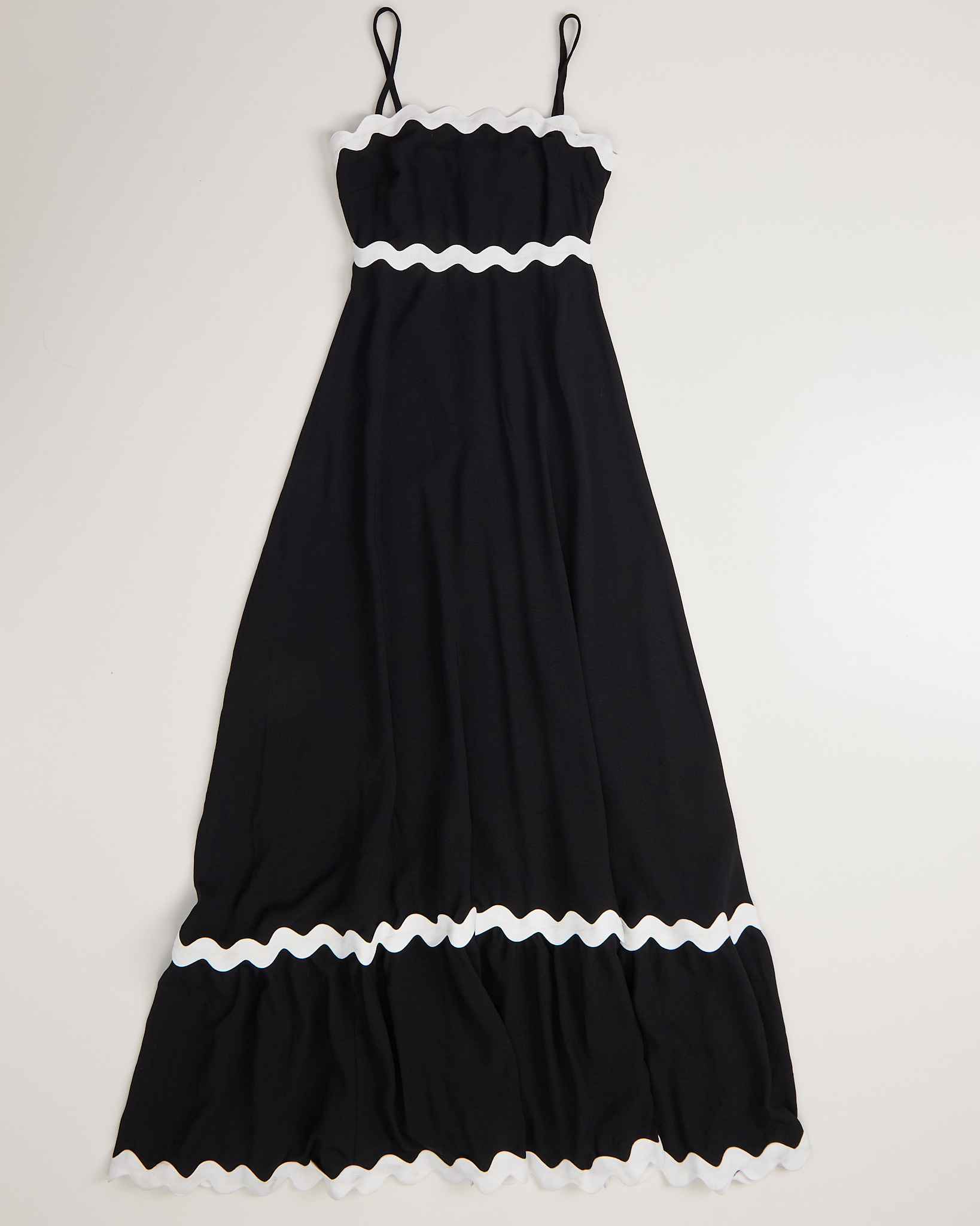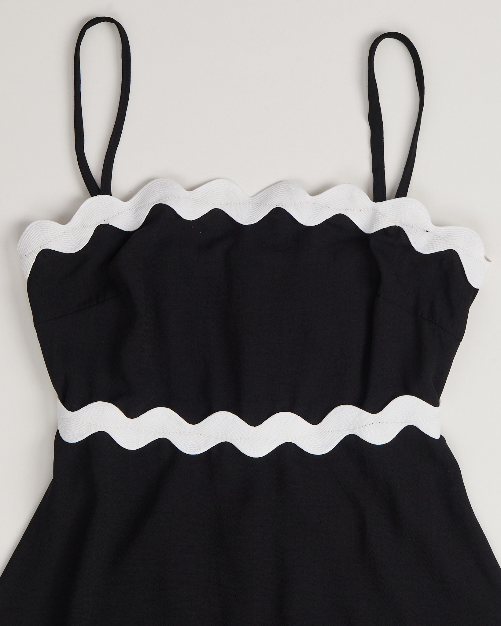 Платье на тонких бретелях с контрастной белой отделкой по линии лифа и подолу. Посадка приталенная в верхней части, силуэт мягко раскрывается книзу. Эластичная спинка обеспечивает удобную посадка.