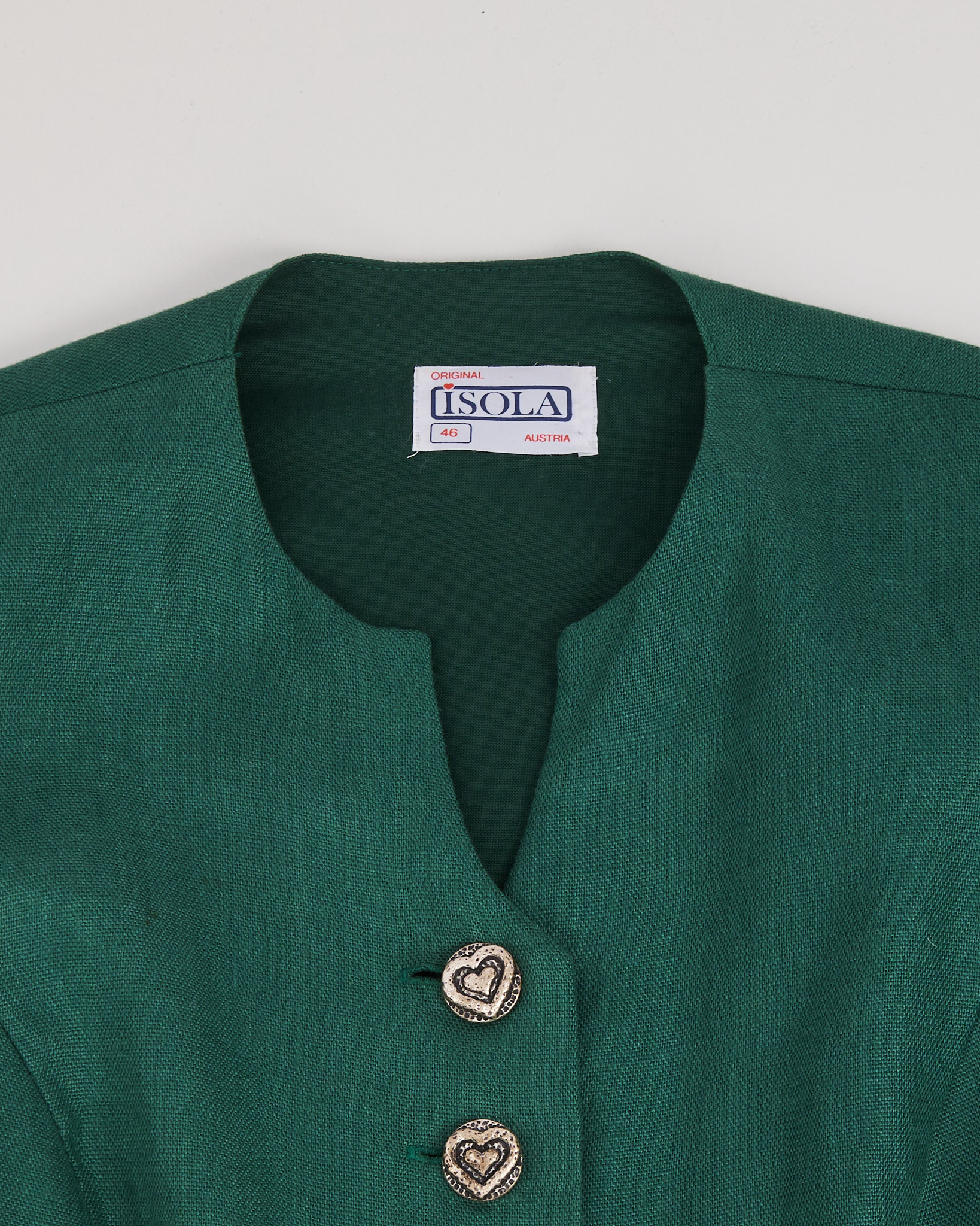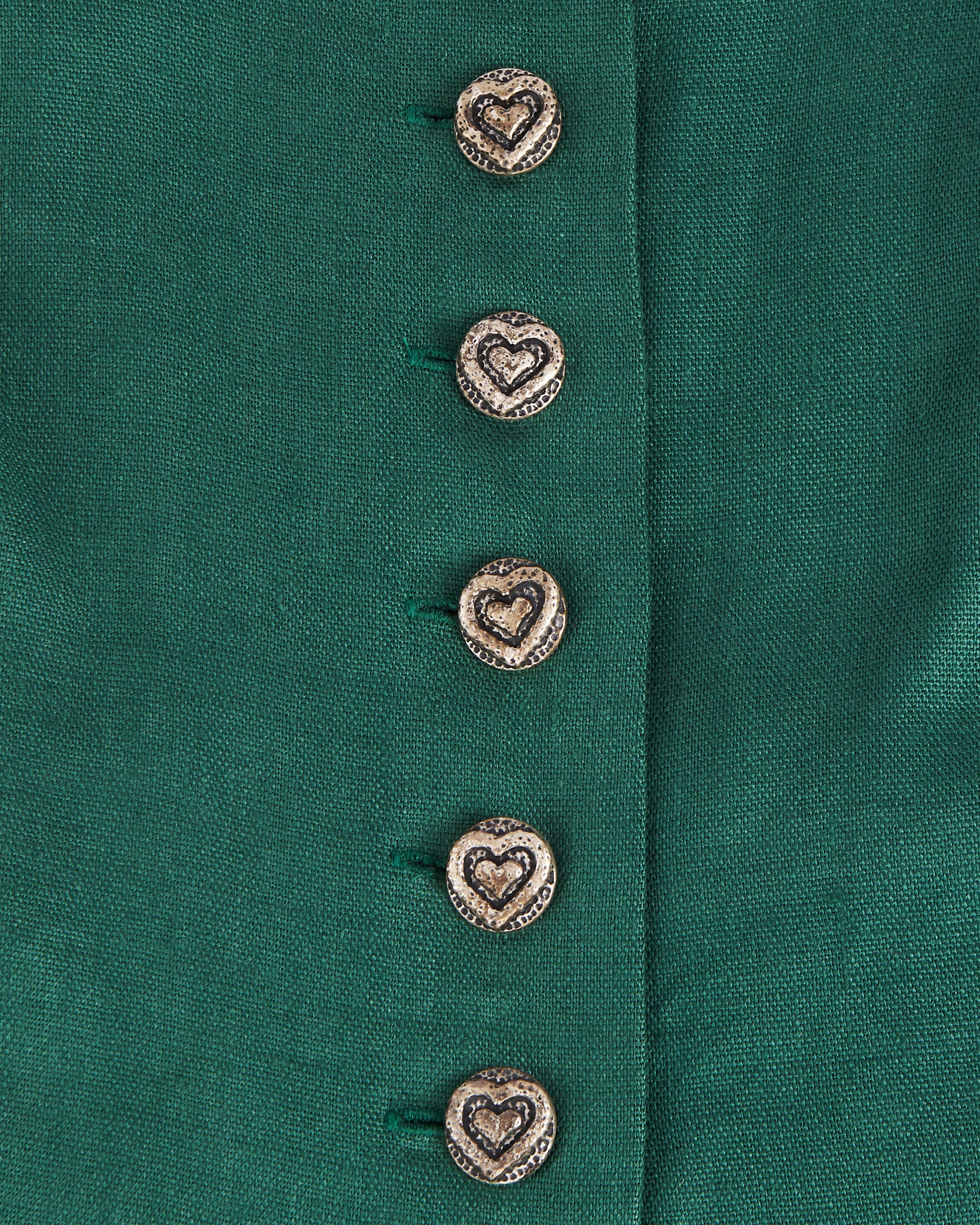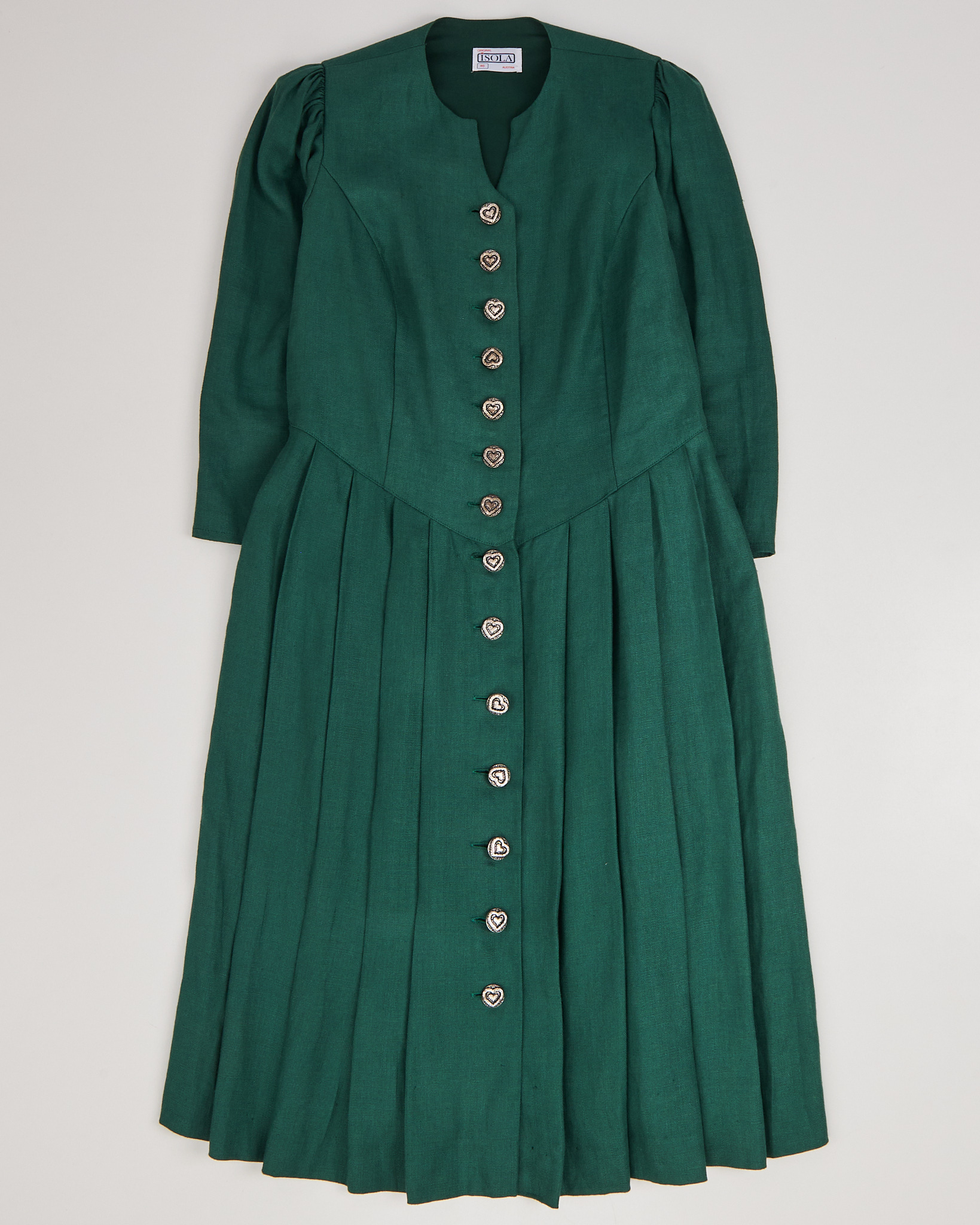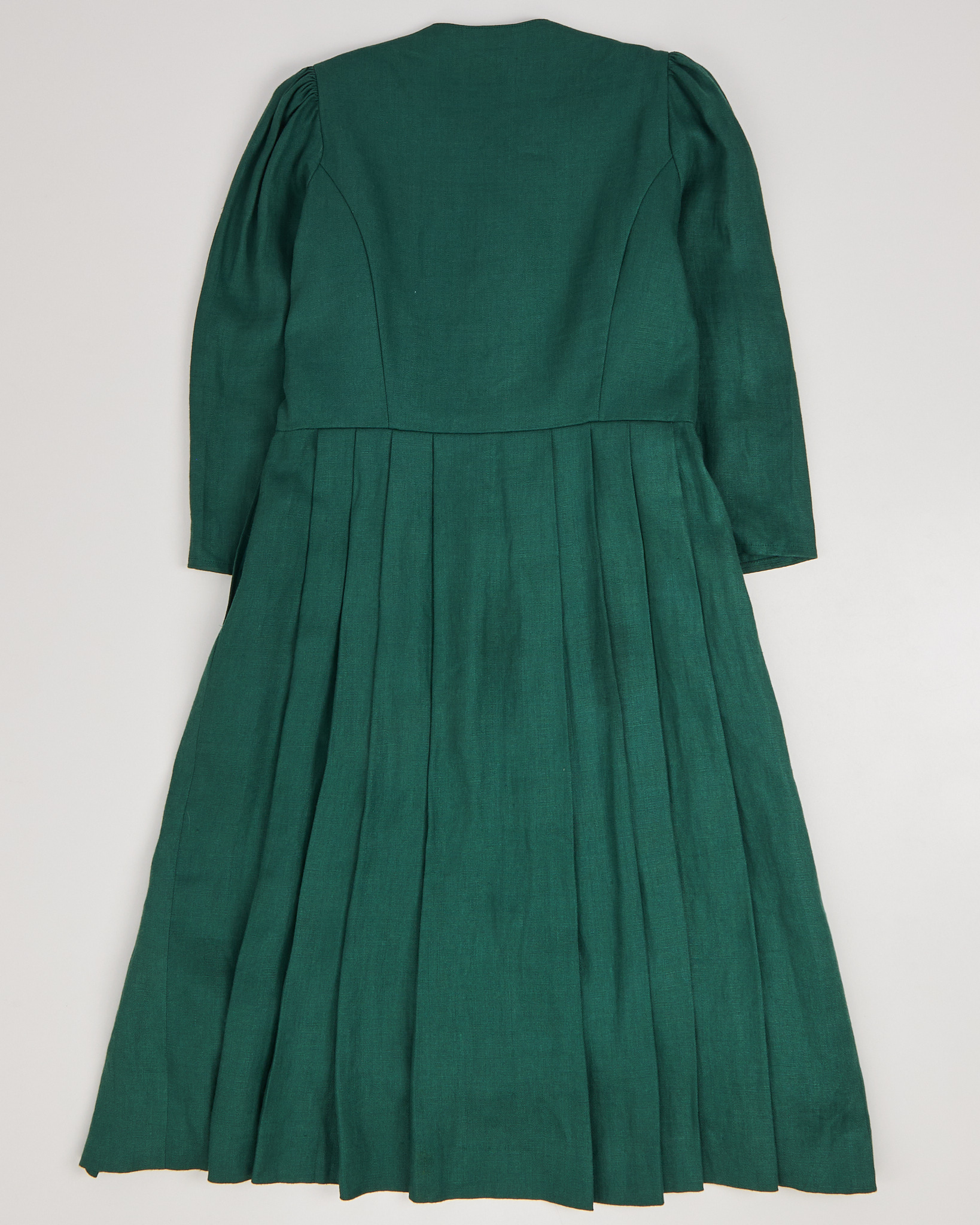 Платье насыщенного зеленого цвета с плиссированной юбкой и декоративными железными пуговицами. Классический фасон с подчеркнутой талией. Два боковых кармана.
