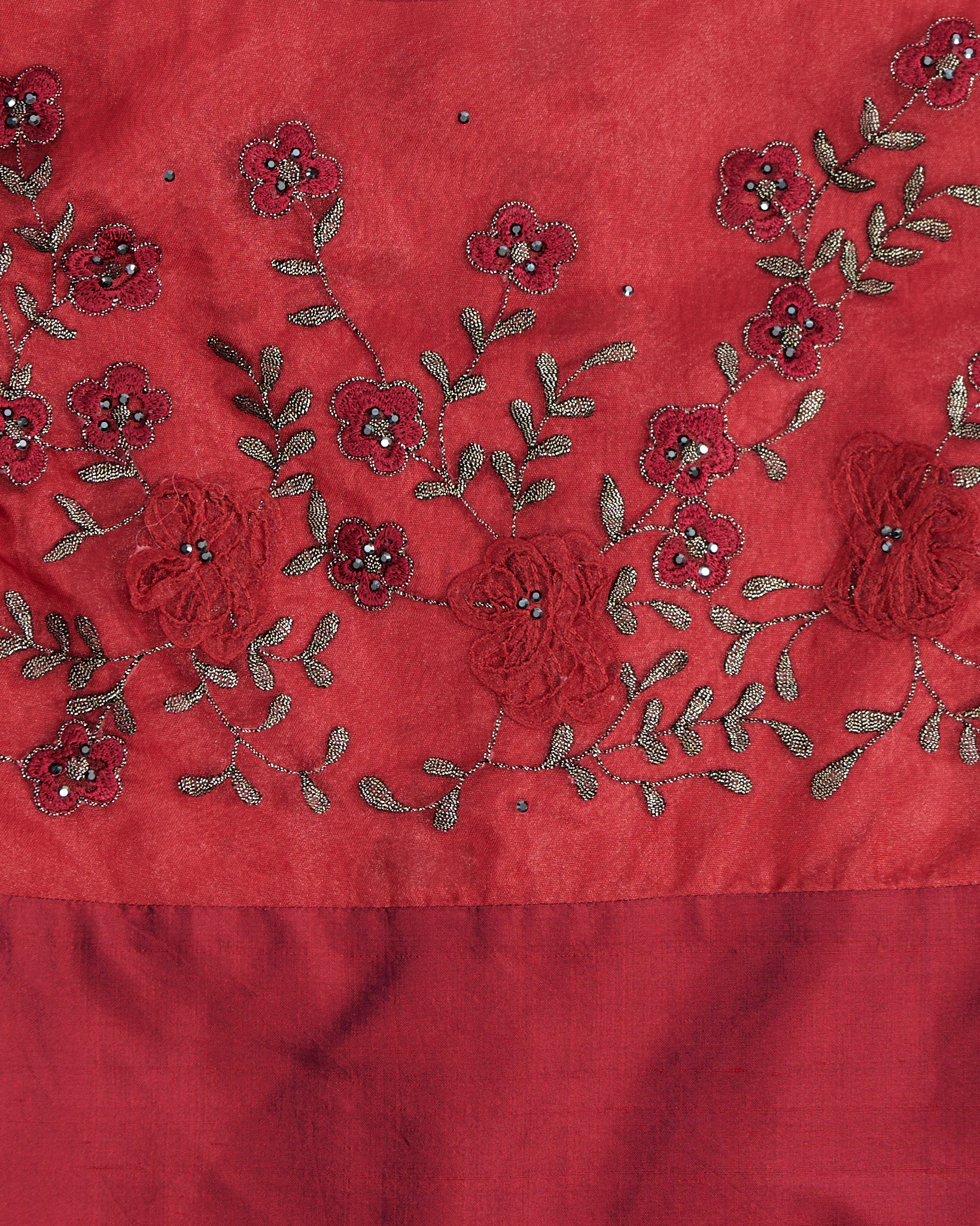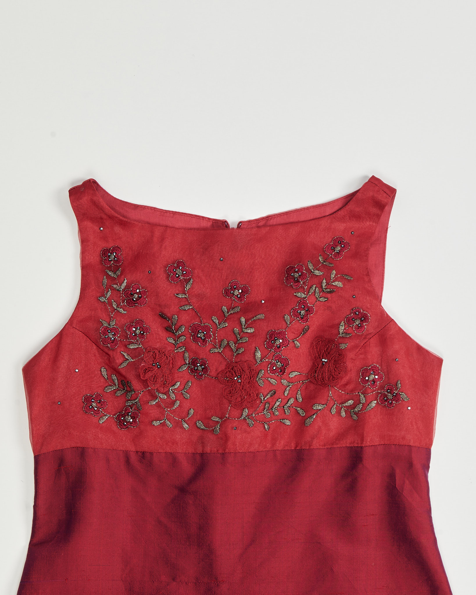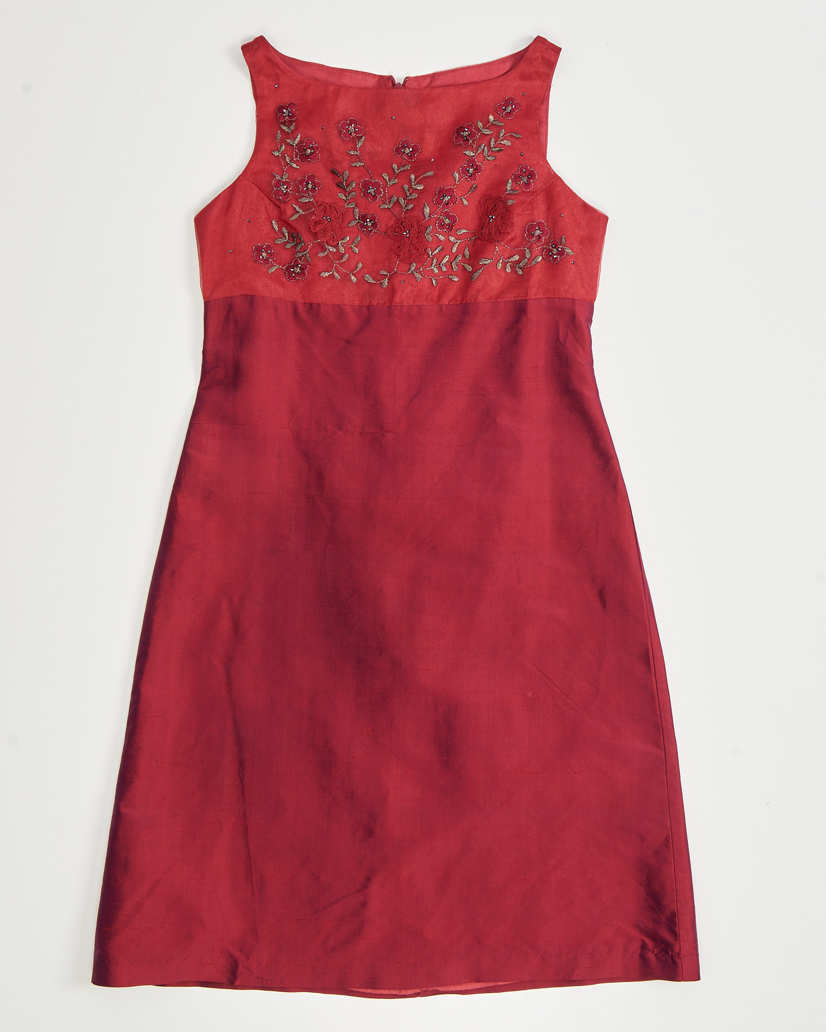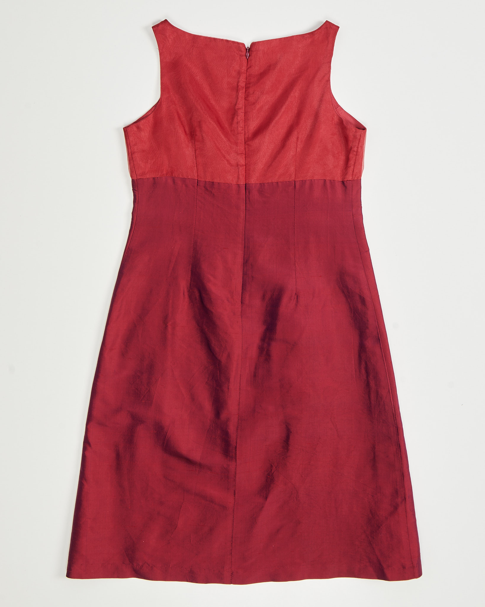 • Платье насыщенного рубиново-красного оттенка с контрастным верхом и А-силуэтом