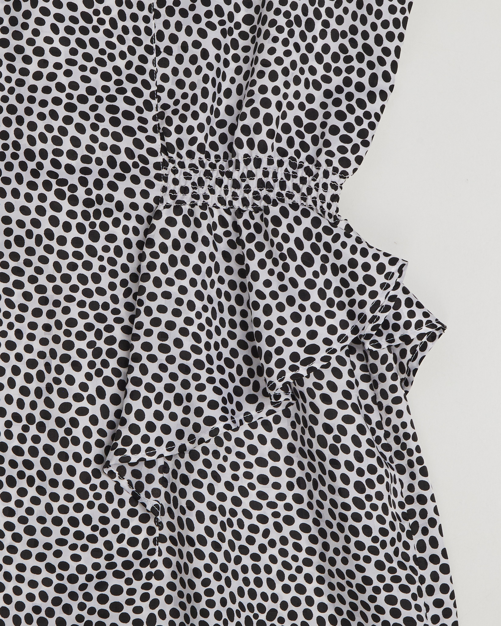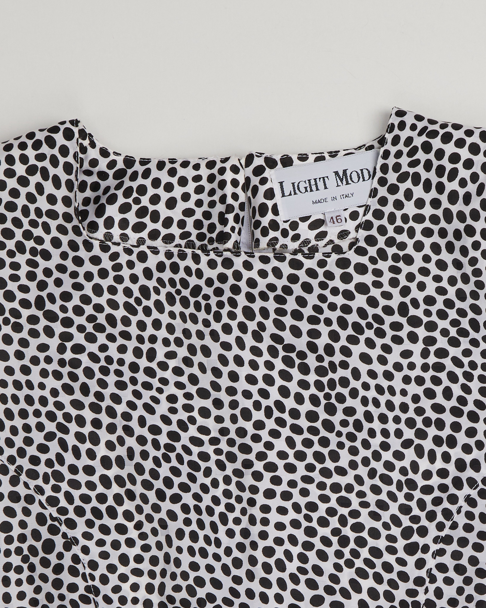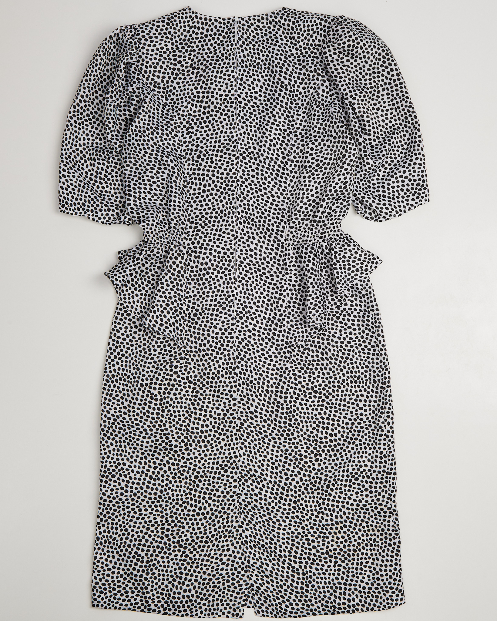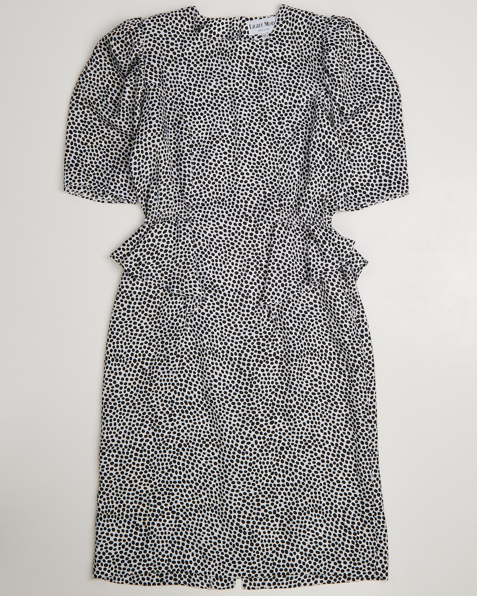 Платье из легкой струящейся ткани в горох. Длина миди, укороченный рукав 3/4. Баска на уровне талии. Сделано в Италии.