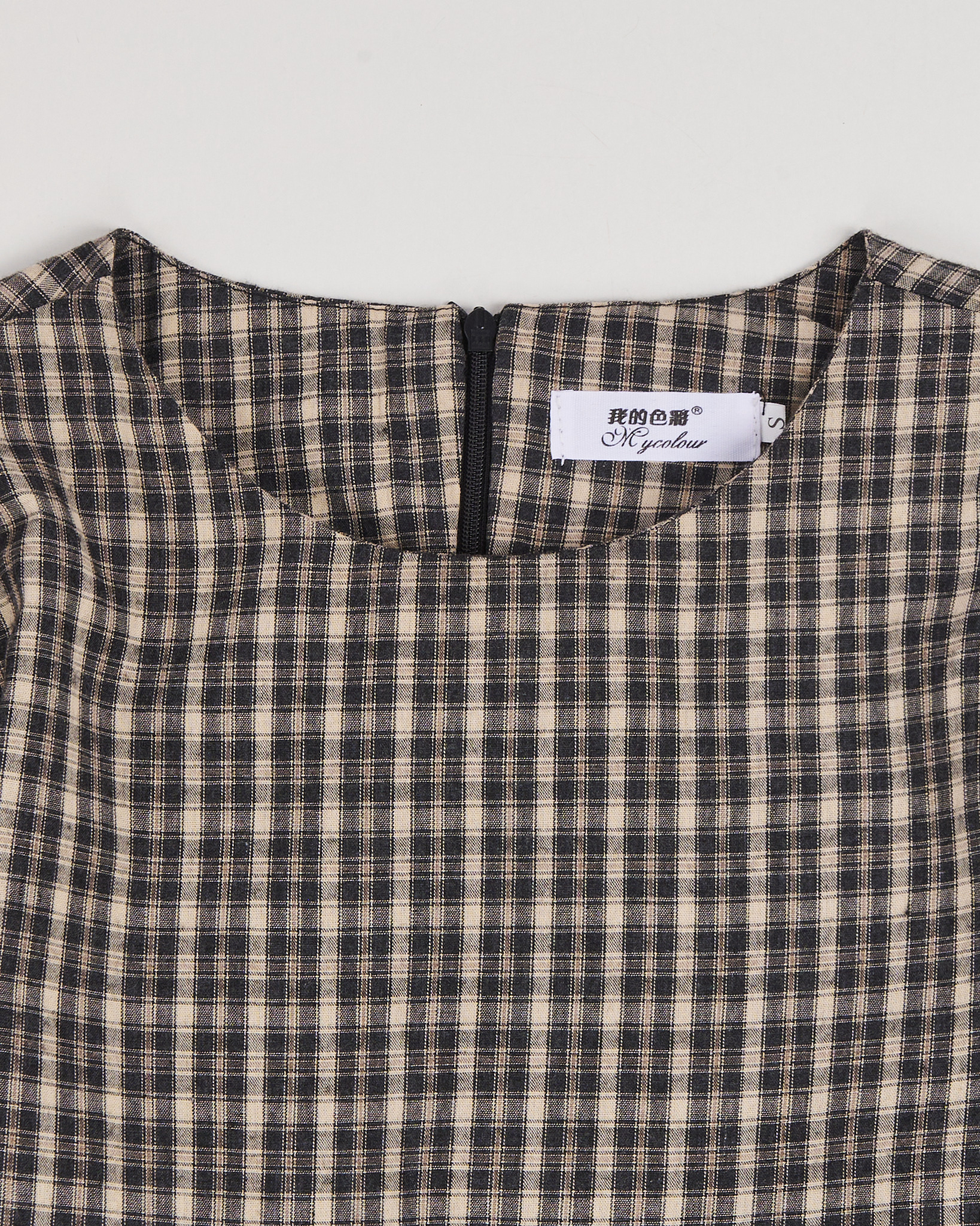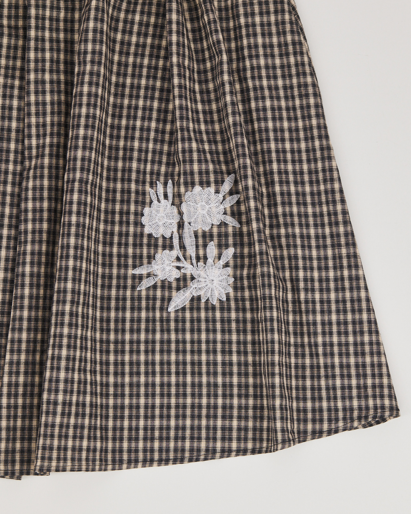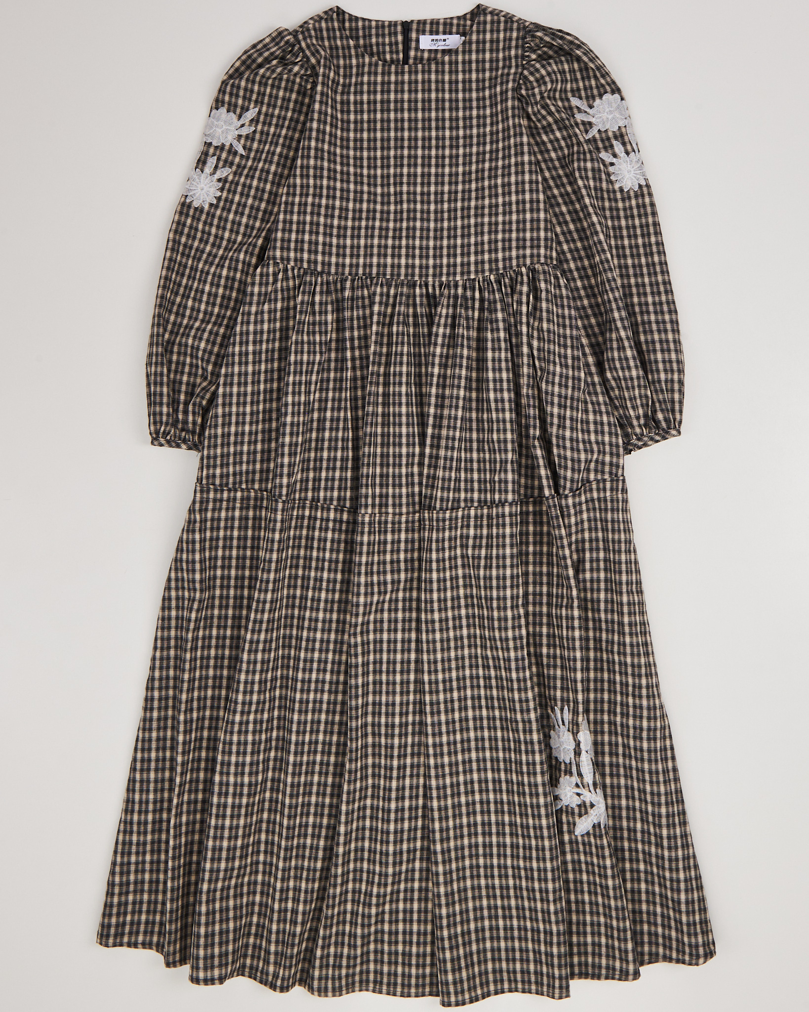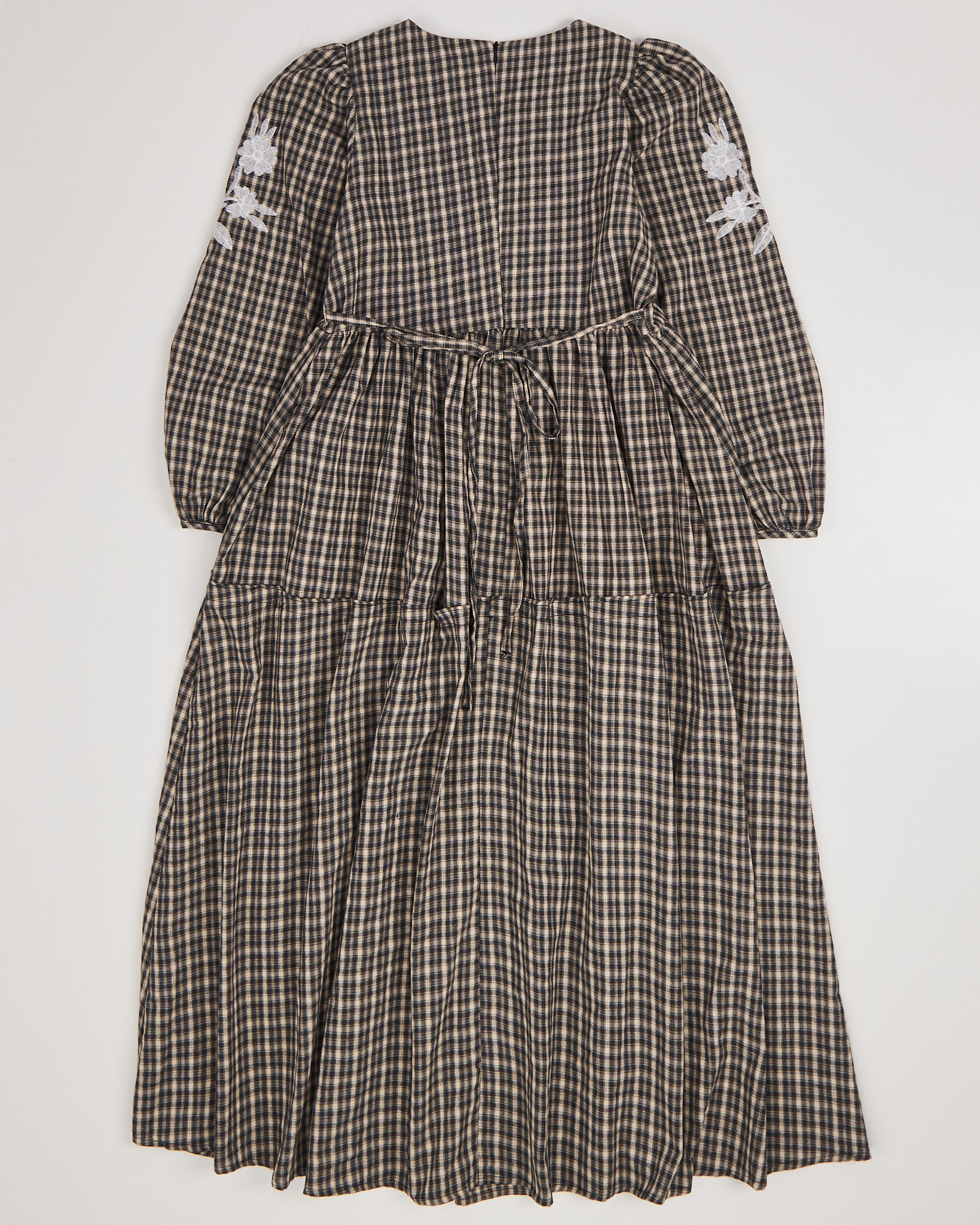 Платье в клетку с элементами вышивки на рукавах, классического кроя с мягкими линиями и пышной юбкой. Сзади-застежка на молнии.