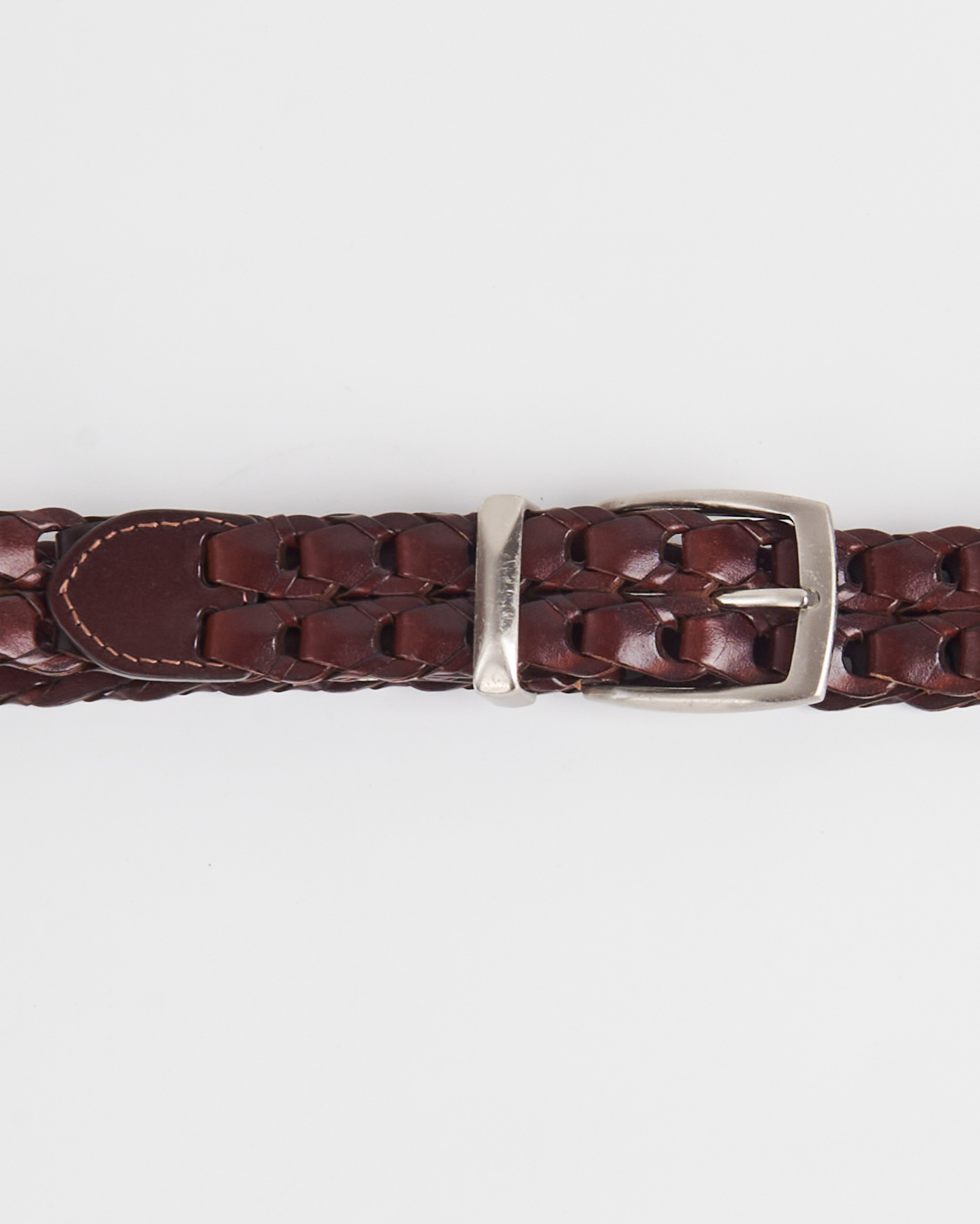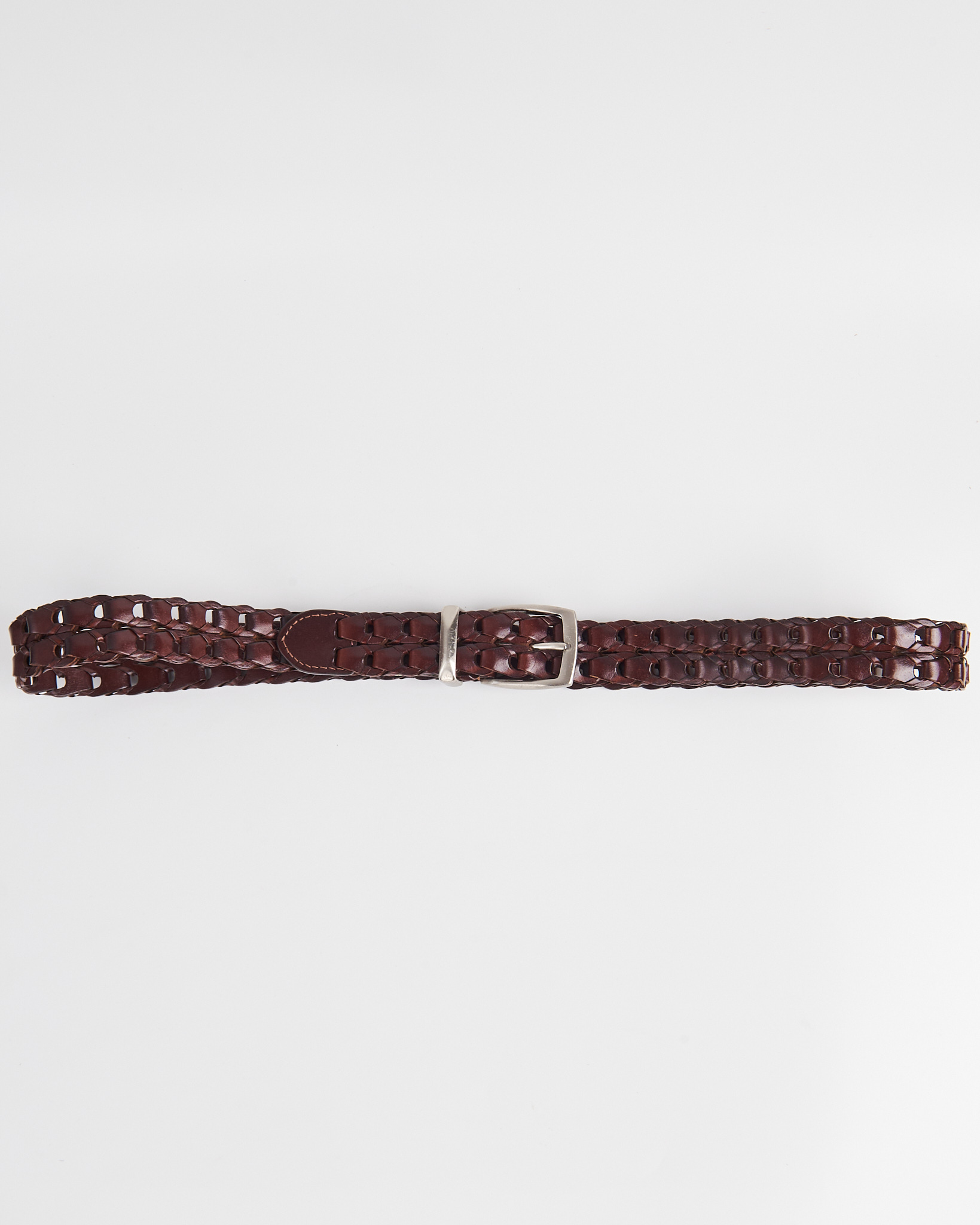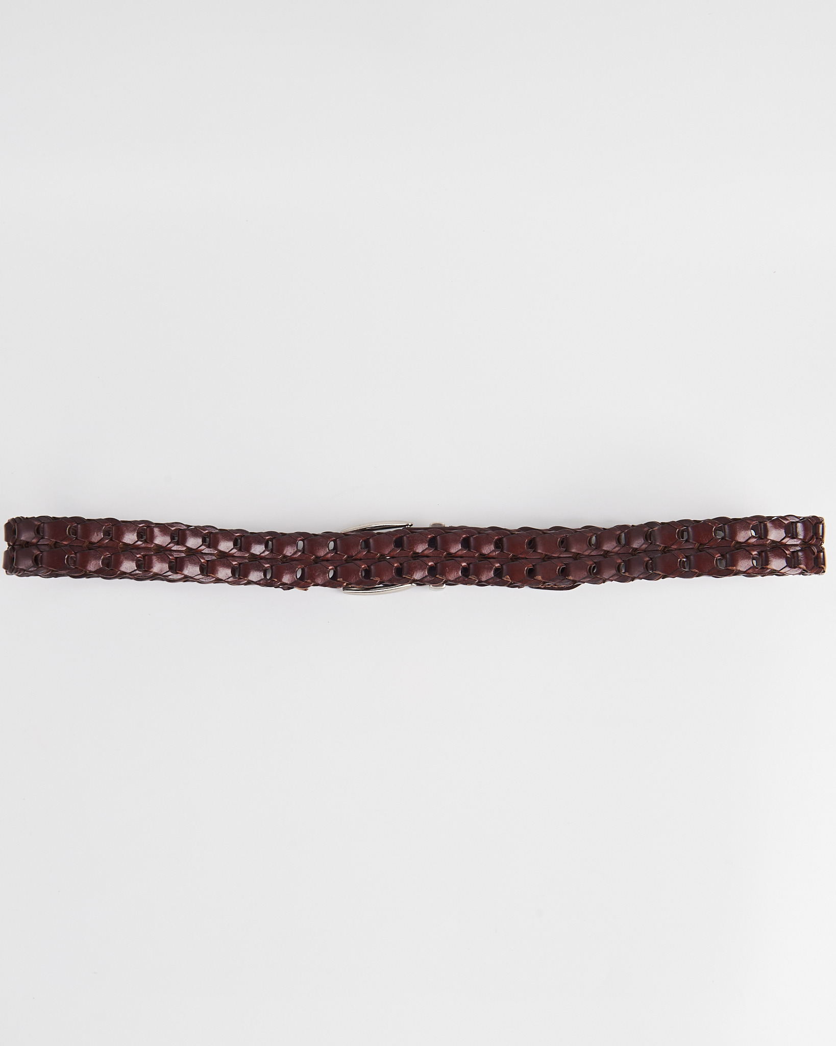 Ремень из натуральной кожи глубокого коричневого оттенка. Посадка легко регулируется по длине за счёт сквозного плетения. Многослойное плетение и аккуратная металлическая пряжка.